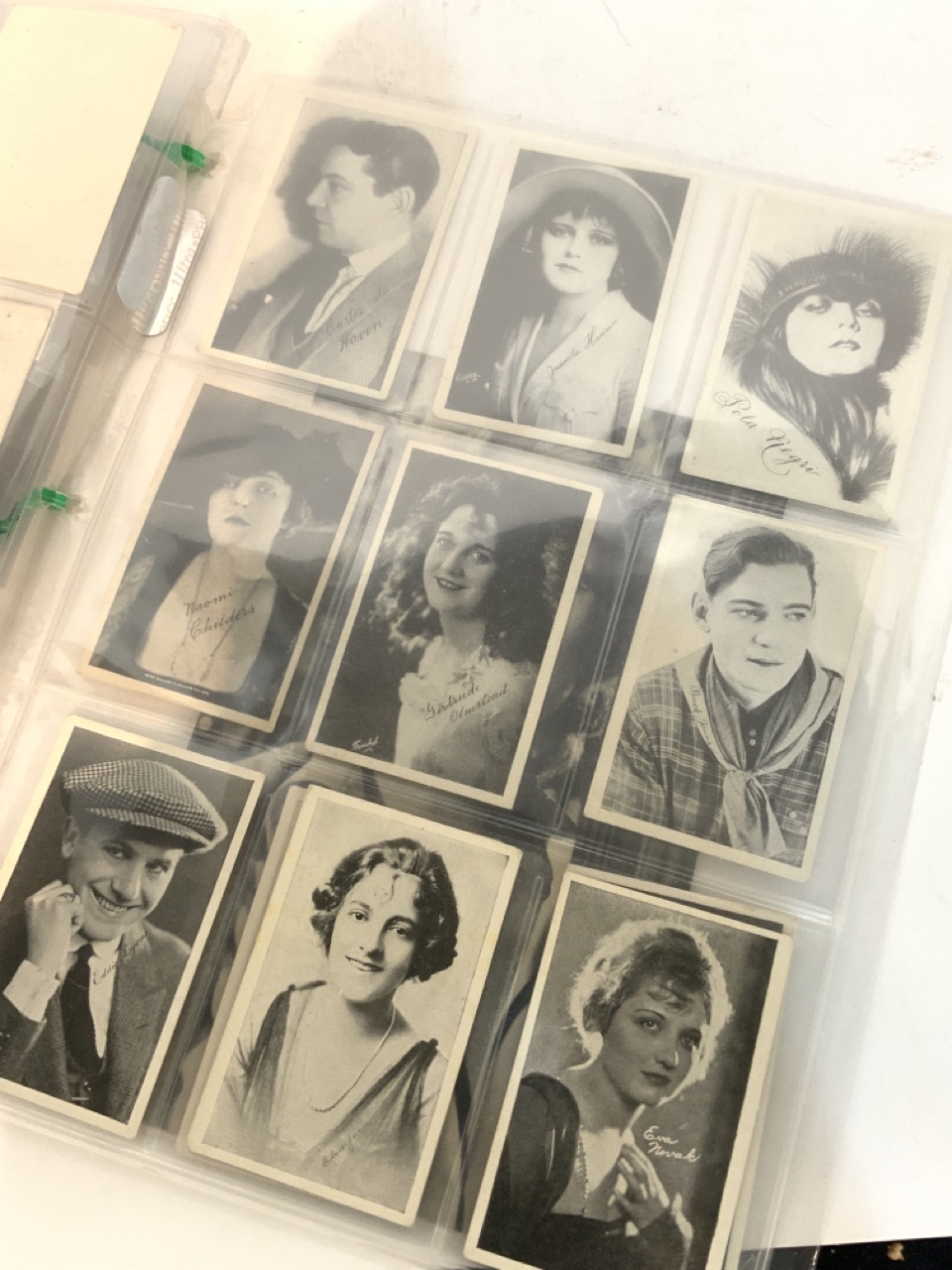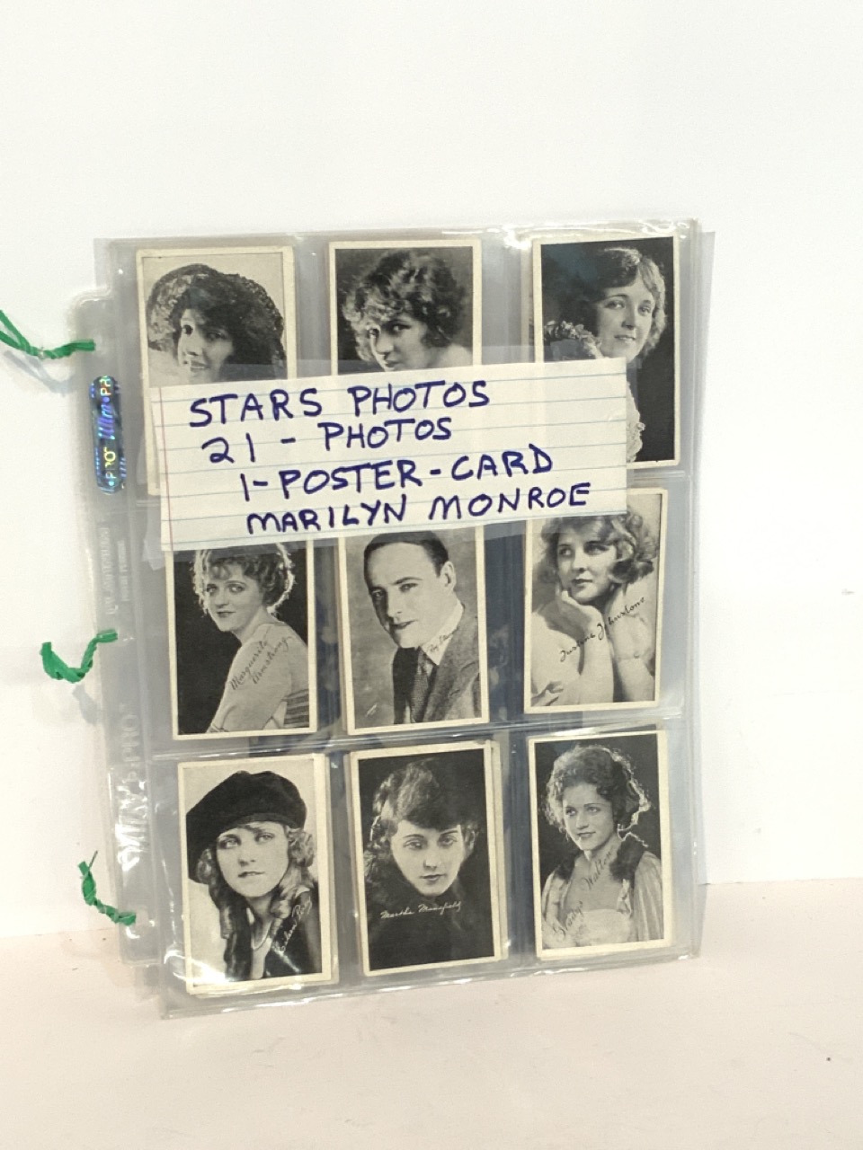 Twenty-One (21) Silent Screen Star photo cards and Marilyn Monroe poster card.