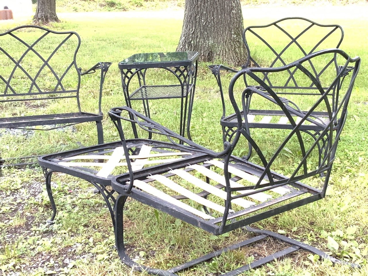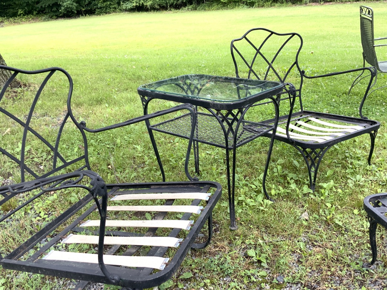 A Woodard outdoor modern design iron lounge chairs with ottoman, glass top side table and arm chair. Fitted cushions available but needing reupholstery.