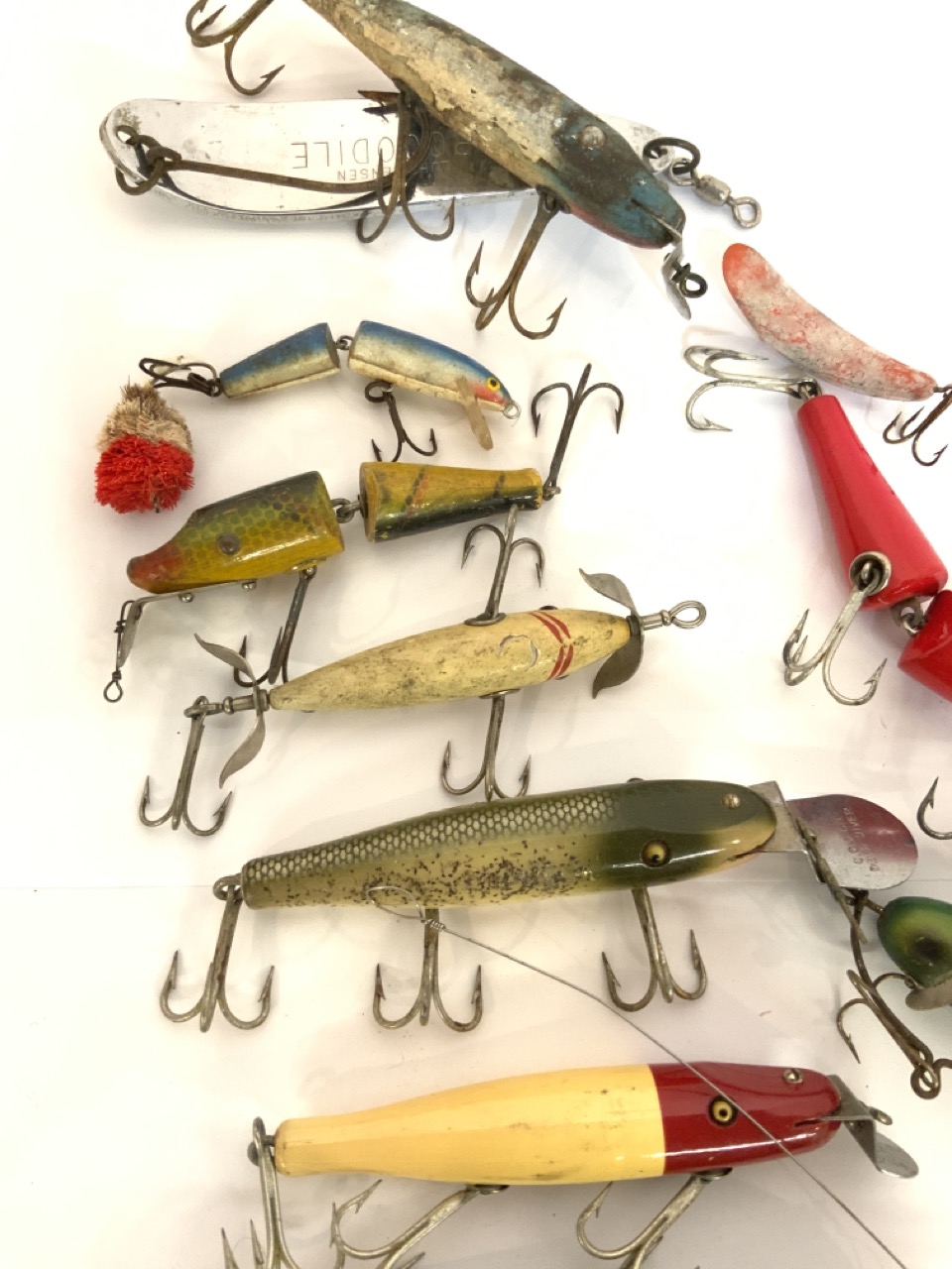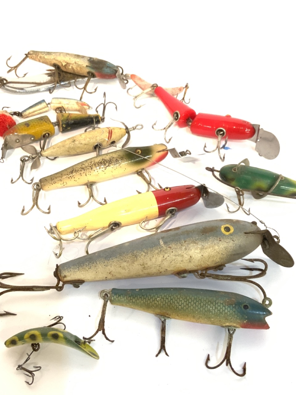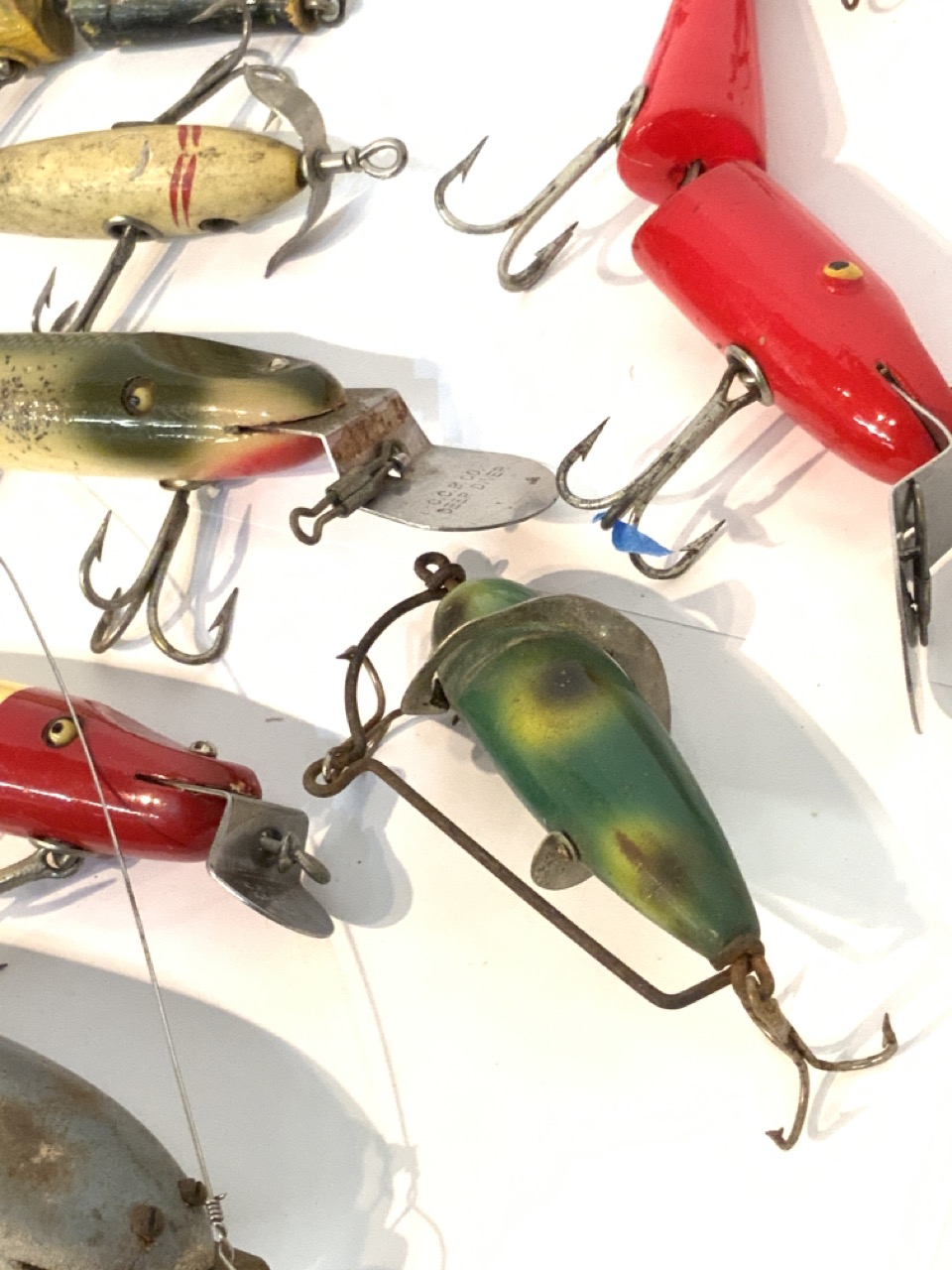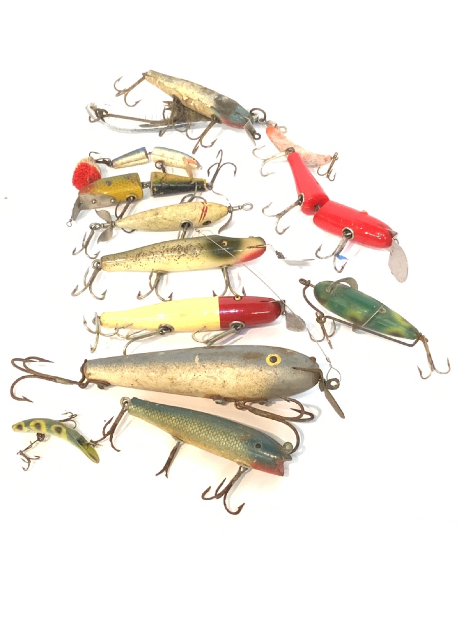 A compiled grouping of all old fishing lures. Most all wood and painted. Nice condition. Please see photograph preview or call.