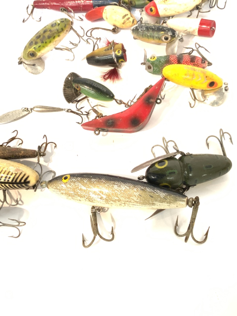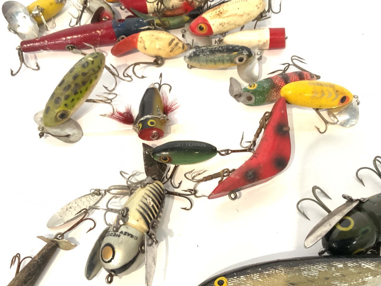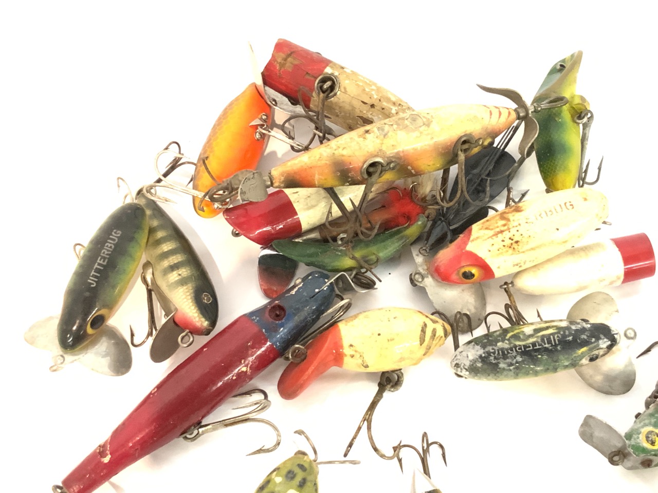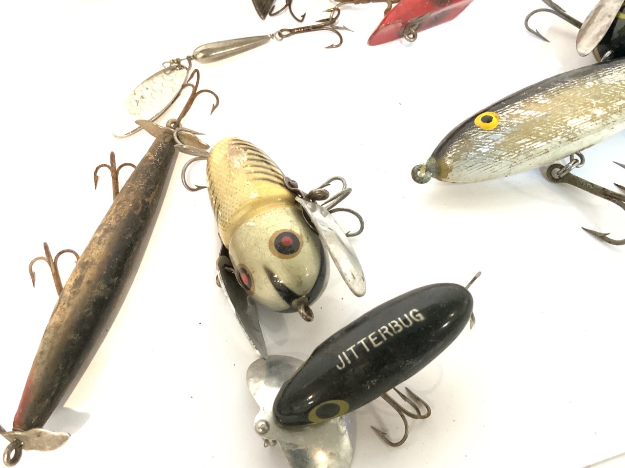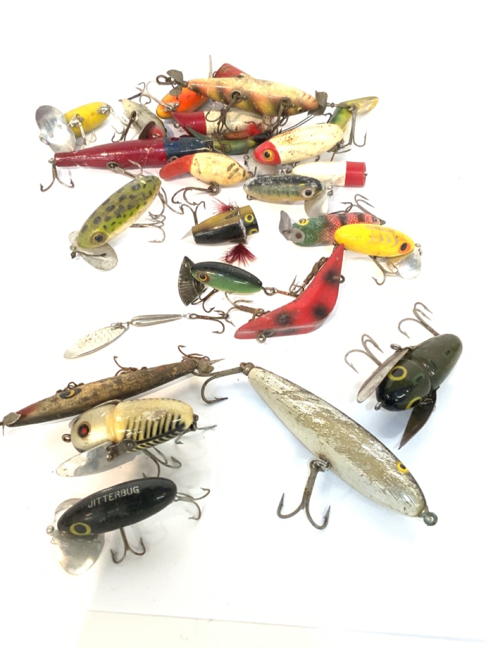 Estate compiled collection of fishing lures. Several Jitterbugs, Heddon Crazy Crawl etc. As seen in photograph preview.