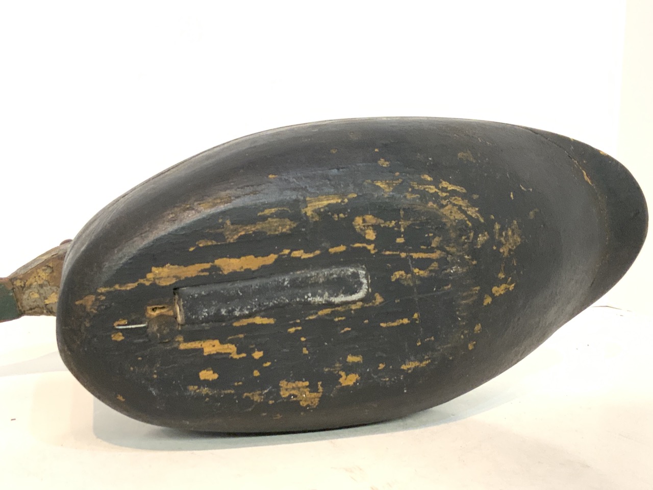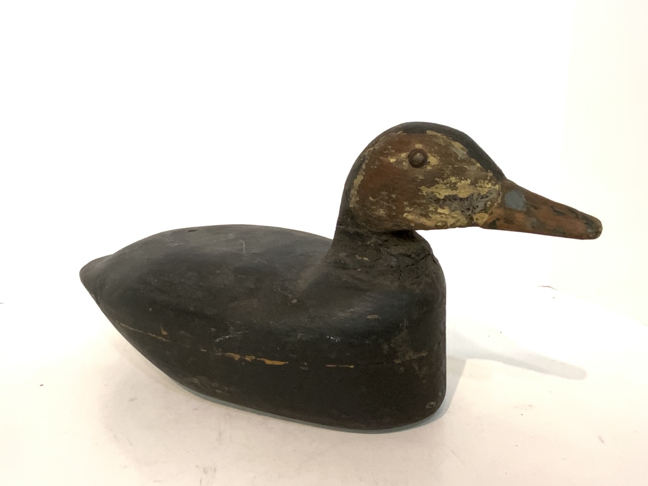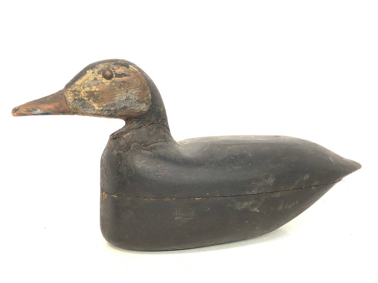 A carved wood duck decoy with brass button eyes.