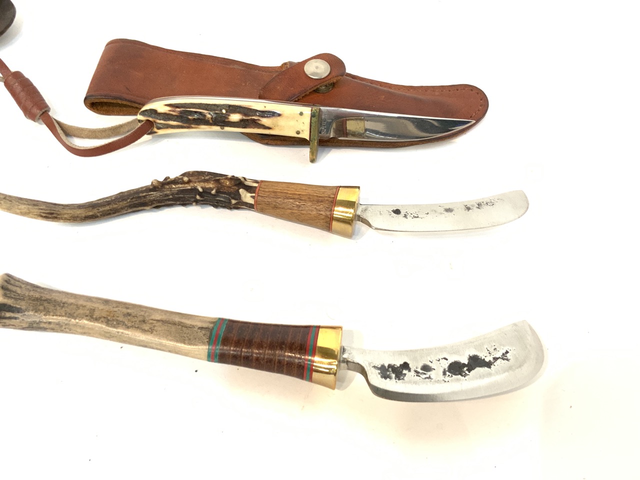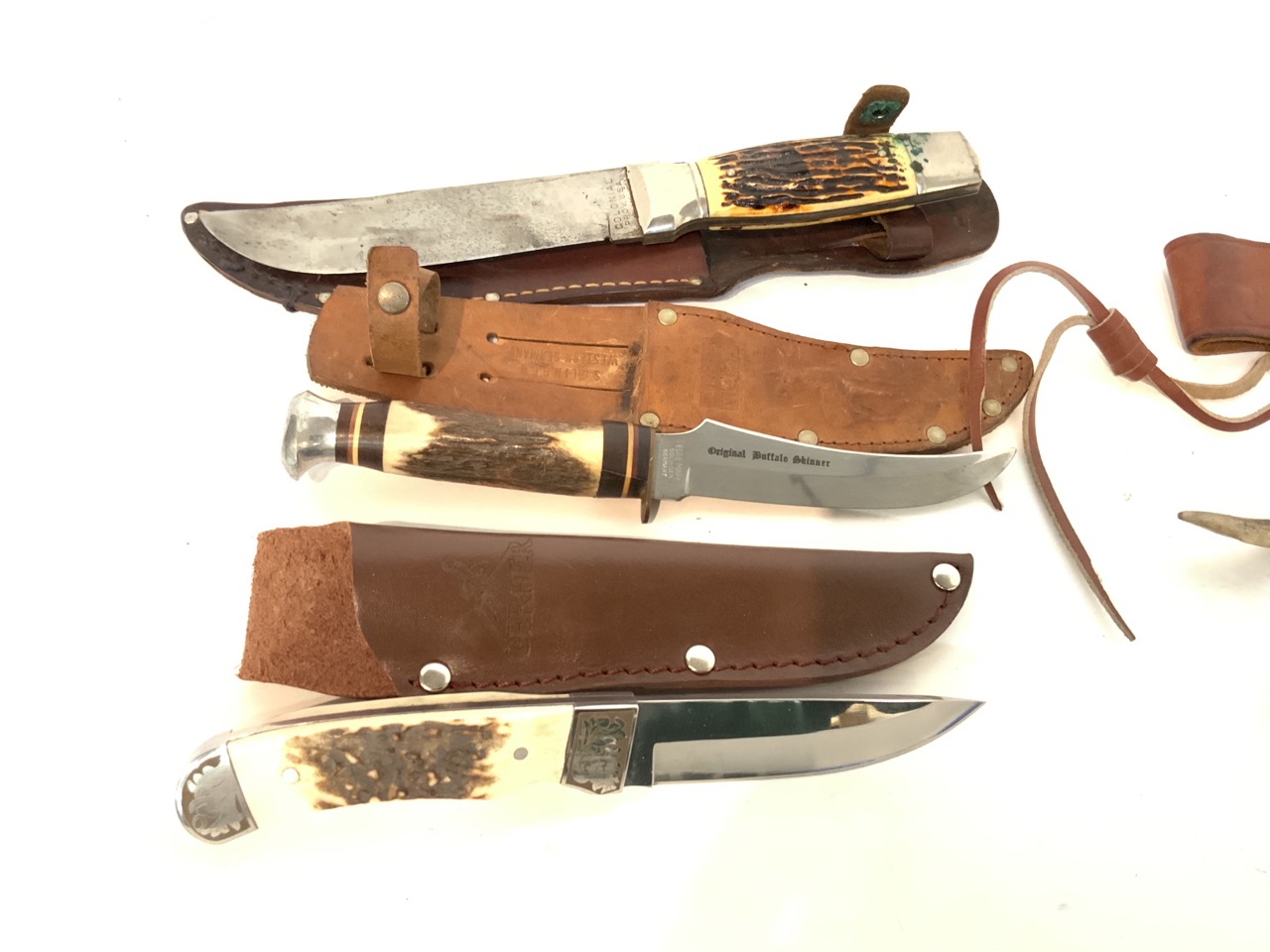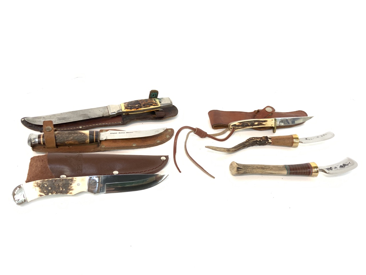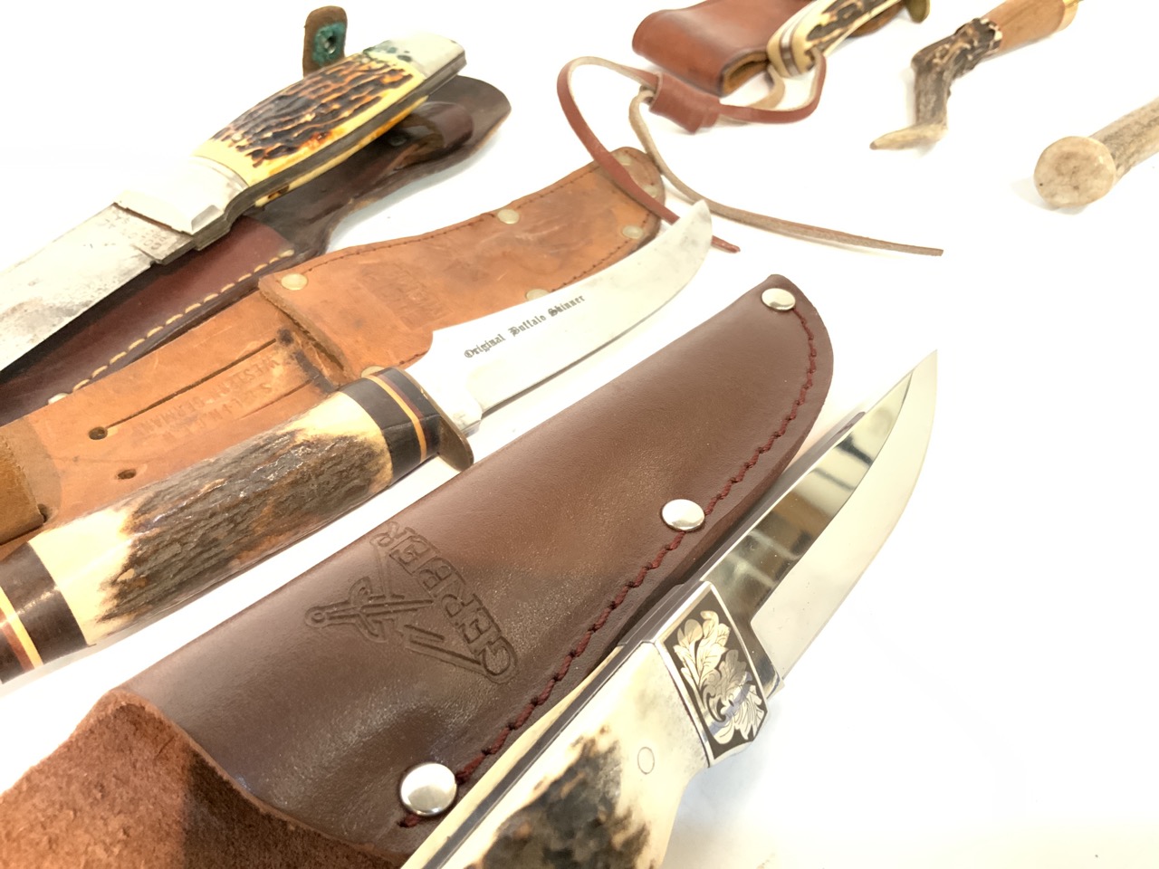 Grouping of six (6) vintage stag handled hunting knives. Including Gerber and Buffalo Skinner....