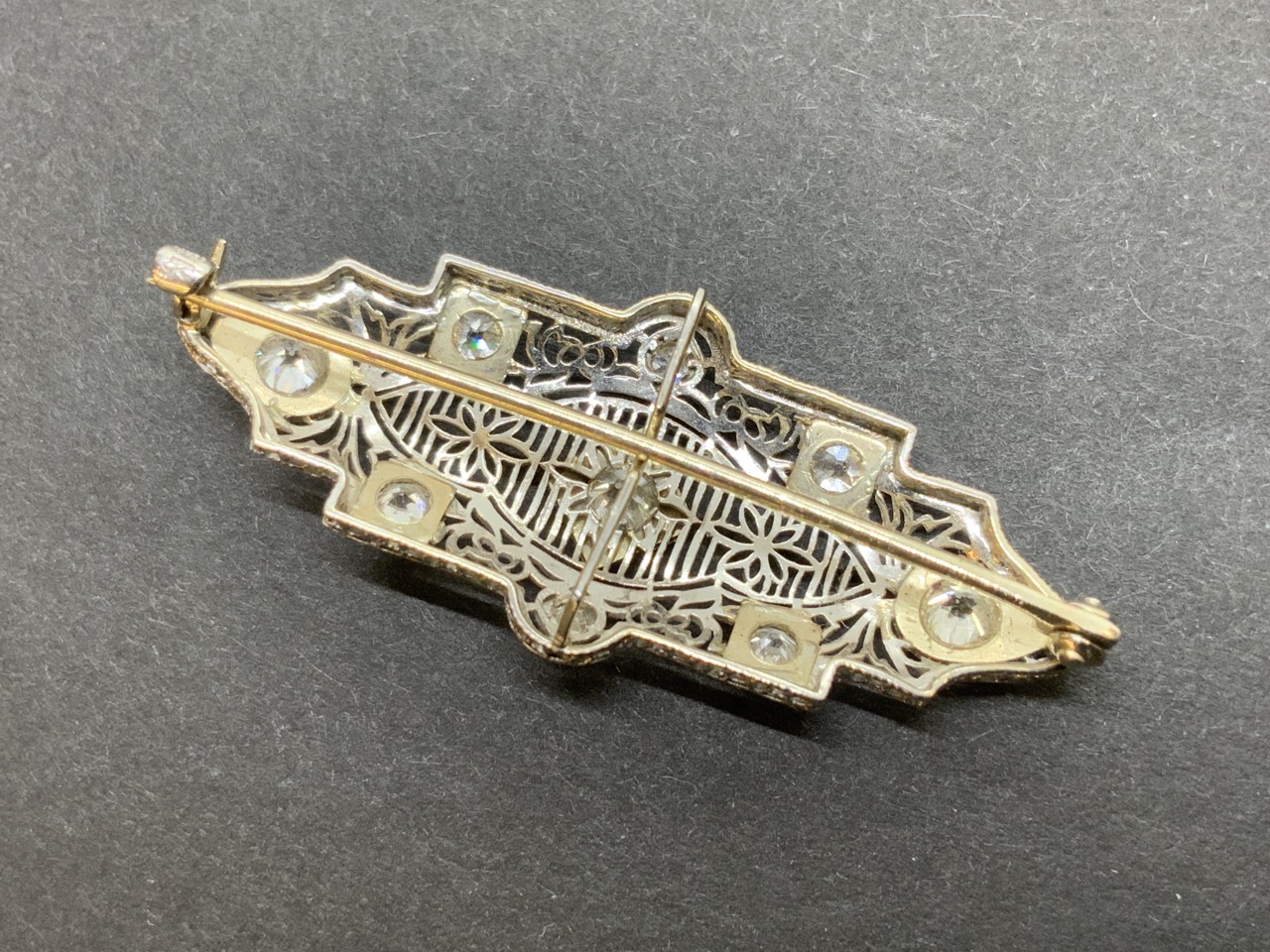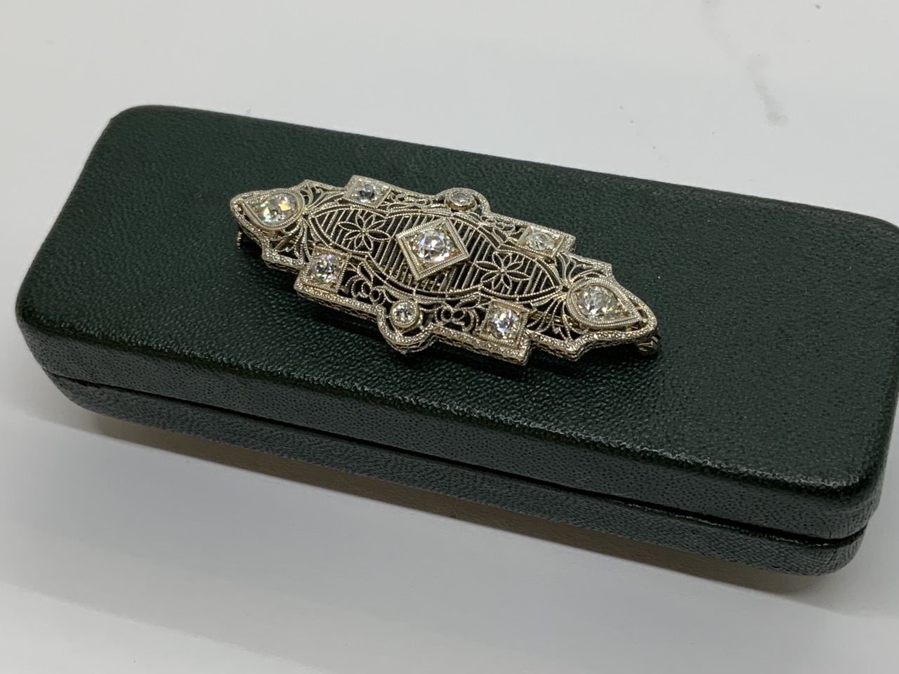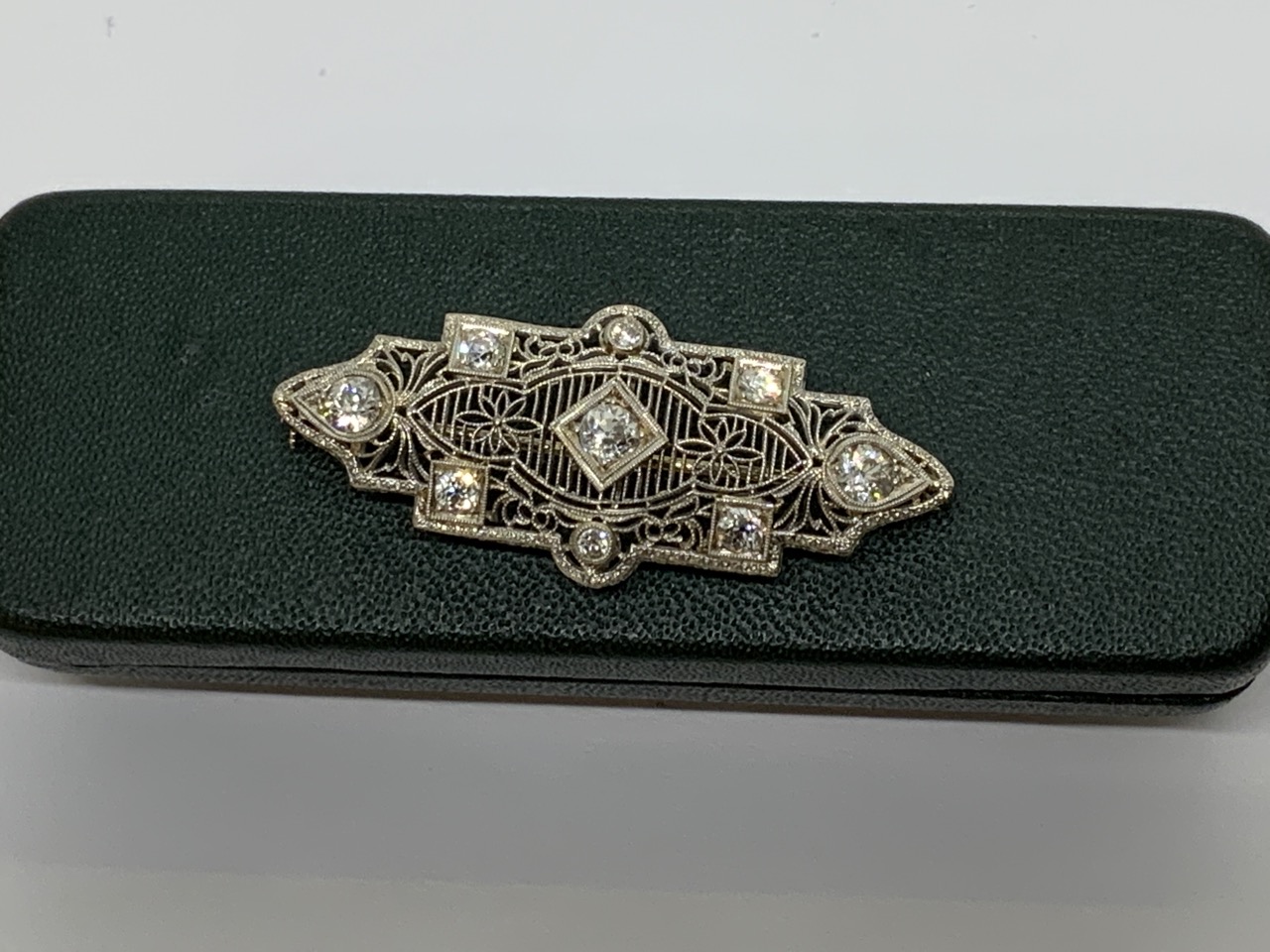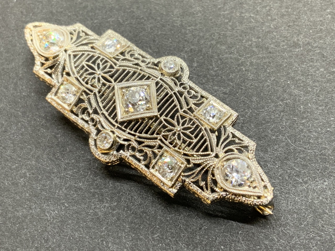 14k white gold estate diamond brooch. Fine filligree work with center diamond surrounded by eight mine cut diamonds.