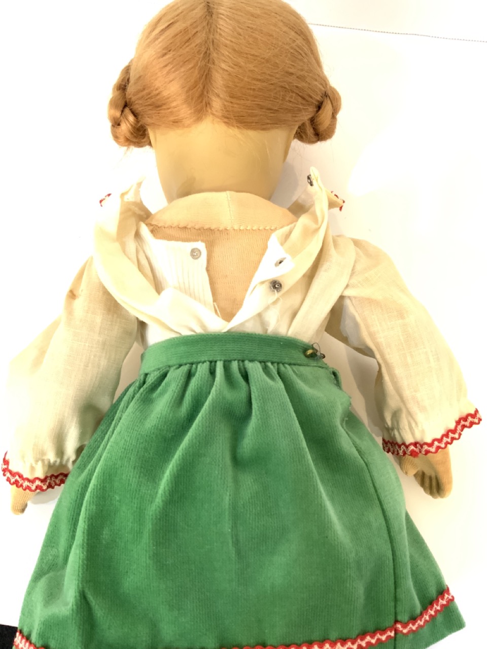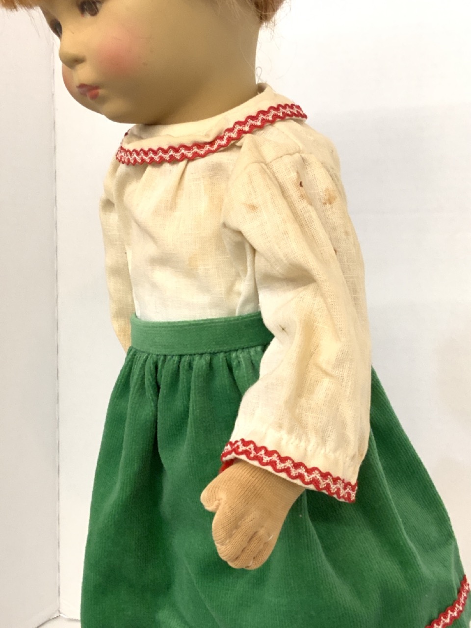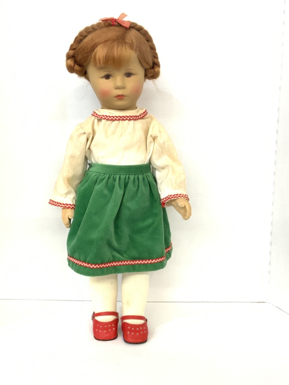 Kathe Kruse 18" cloth head girl doll with cloth body. German dress. Very good near mint condition. Light element/dust soiling to clothing.