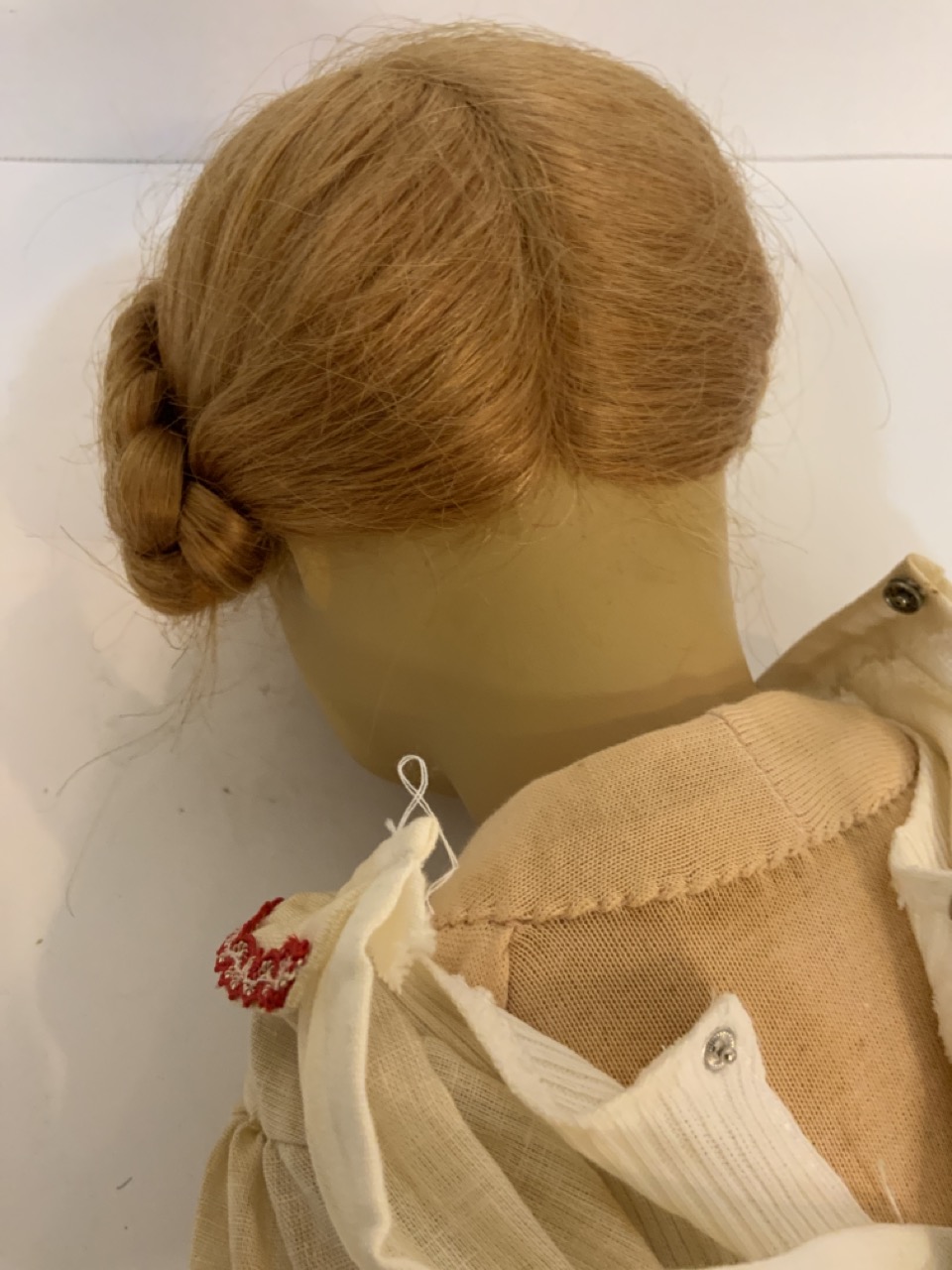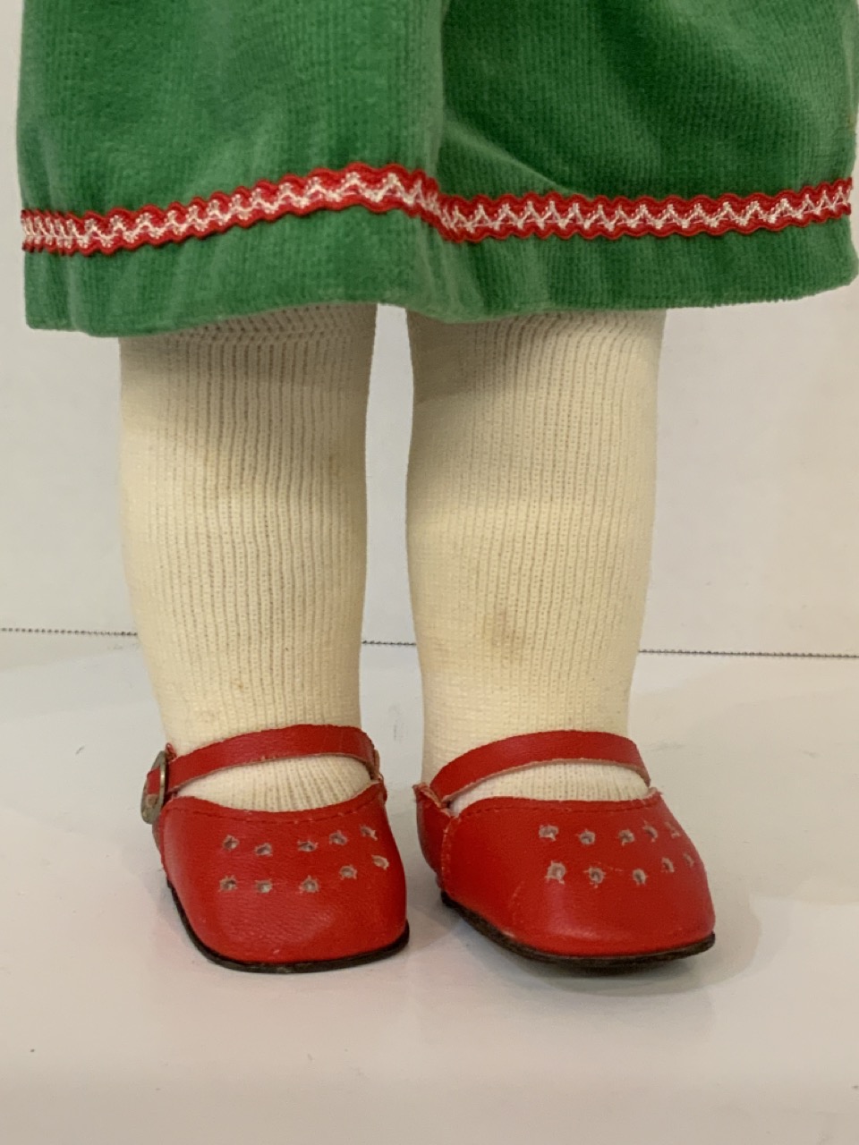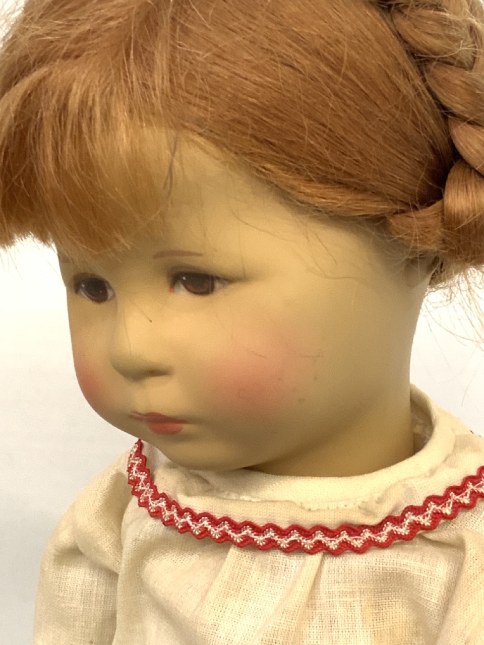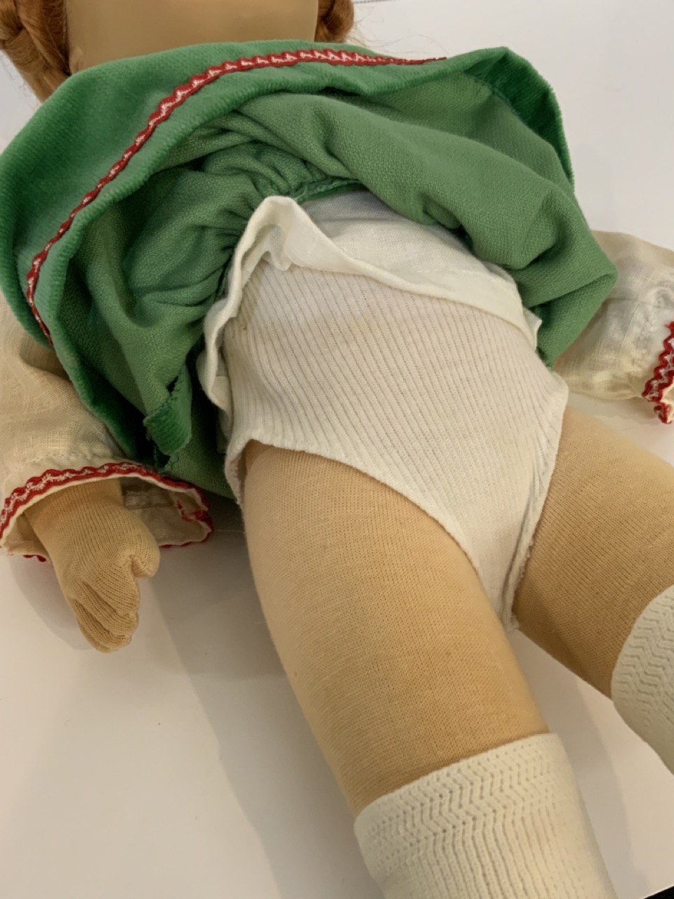 Kathe Kruse 18" cloth head girl doll with cloth body. German dress. Very good near mint condition. Light element/dust soiling to clothing.