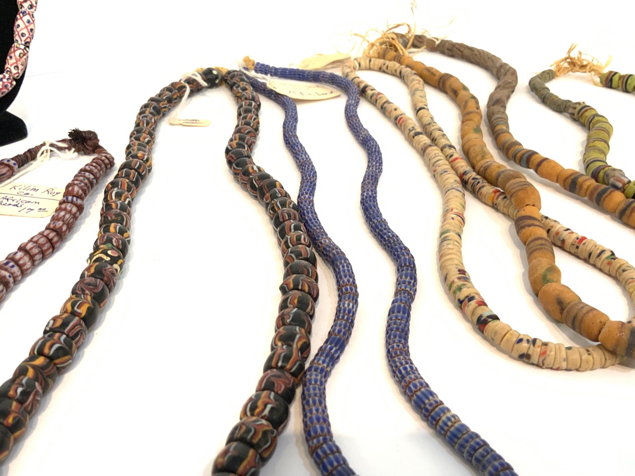 A grouping of Seven (7) strands of African Trade Beads. Kilim Rug, Chevron etc.