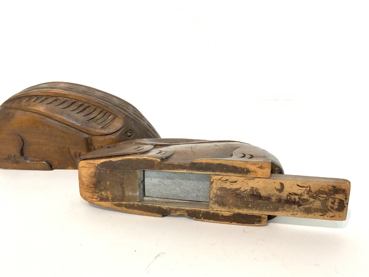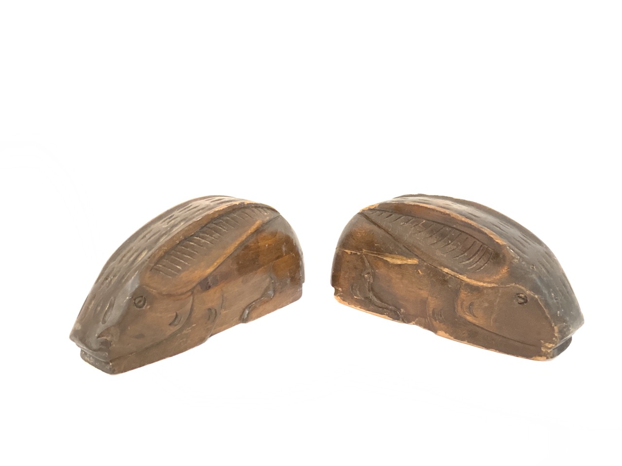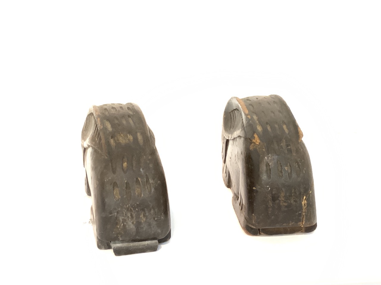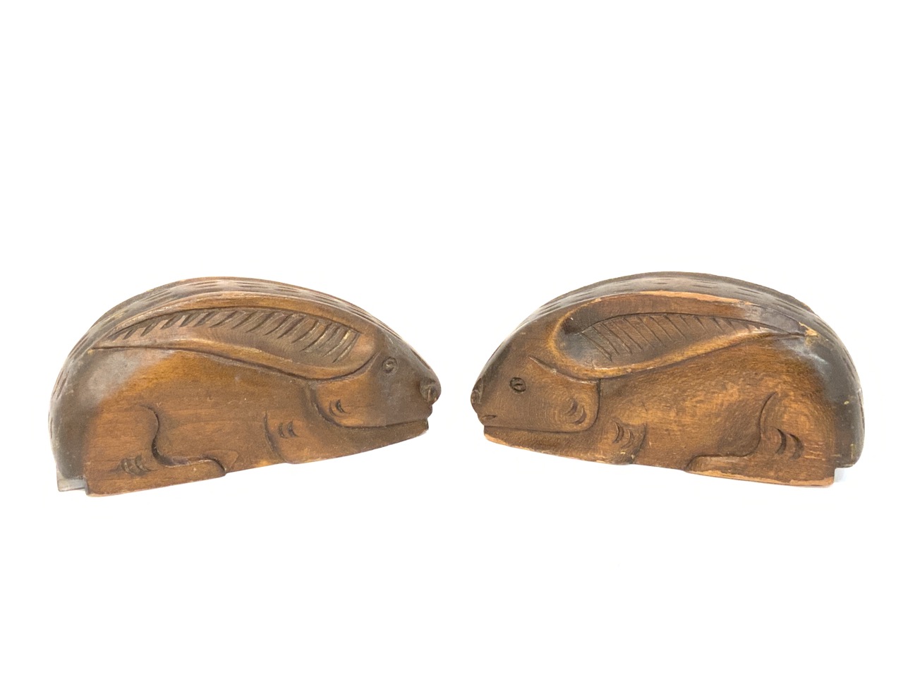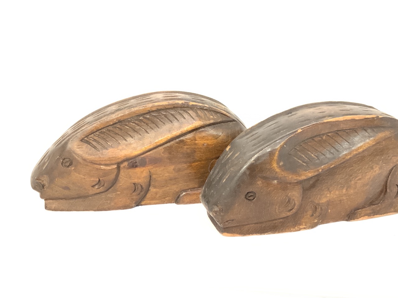 A pair of carved wood rabbit knife sharpeners.