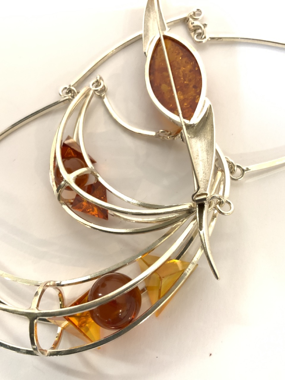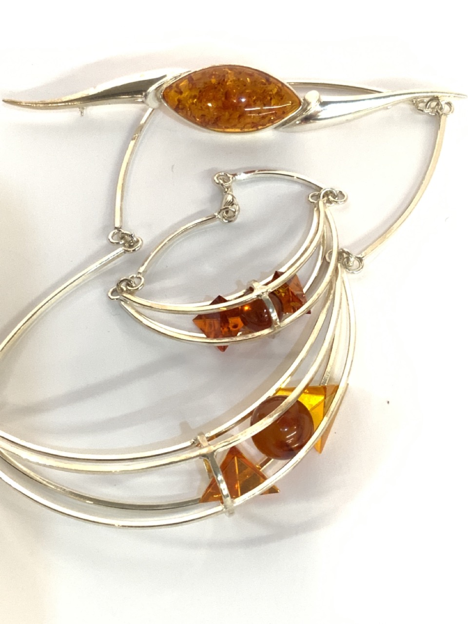 1980's Silver Jewelry Group. Faux amber bobbles and inset stone in pin.