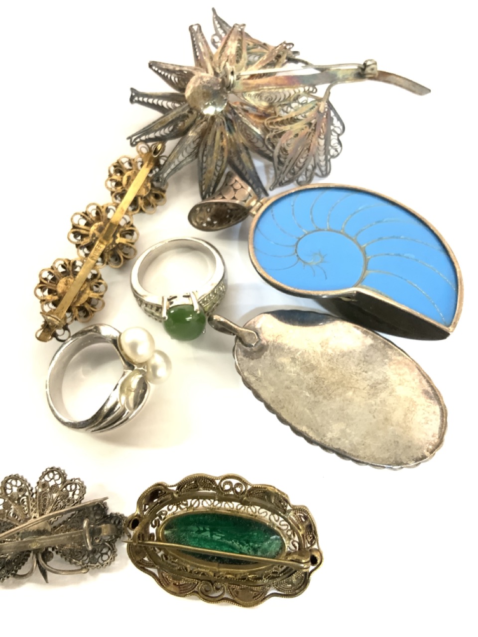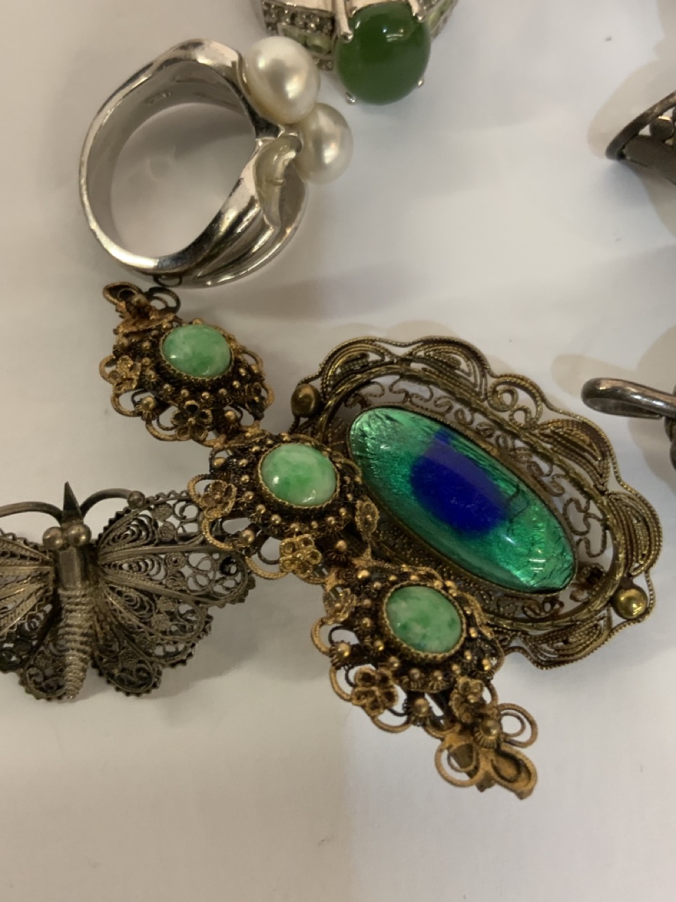 Assorted vintage sterling silver costume jewelry. Filligree butterfly pin, rings, pendants etc. Nice grouping of estate jewelry.