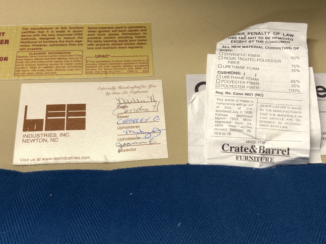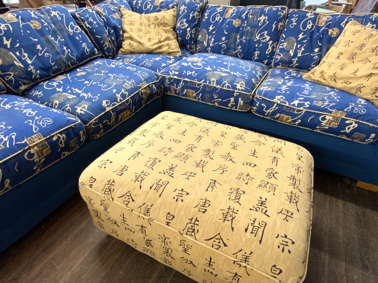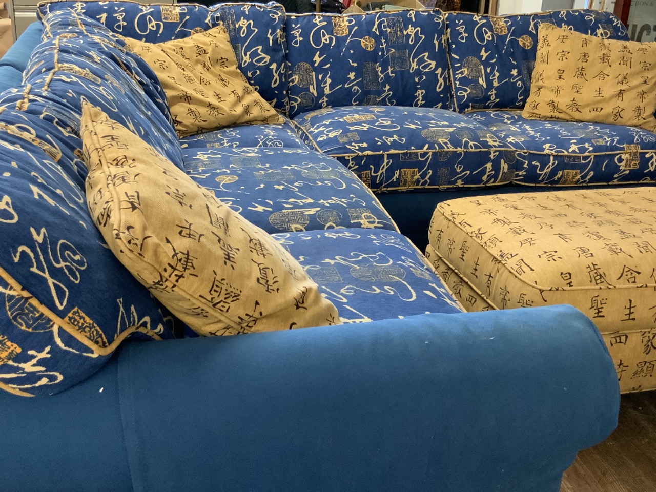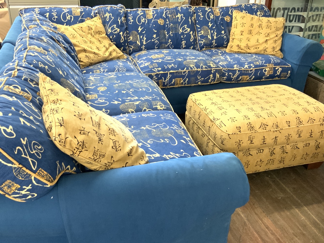 Unique Chinese custom brigh blue, cream and yellow sectional sofa. Custom made for client by Lee Industries for Crate & Barrel. Hand signed. Two pieces. Very good condition with ottoman.