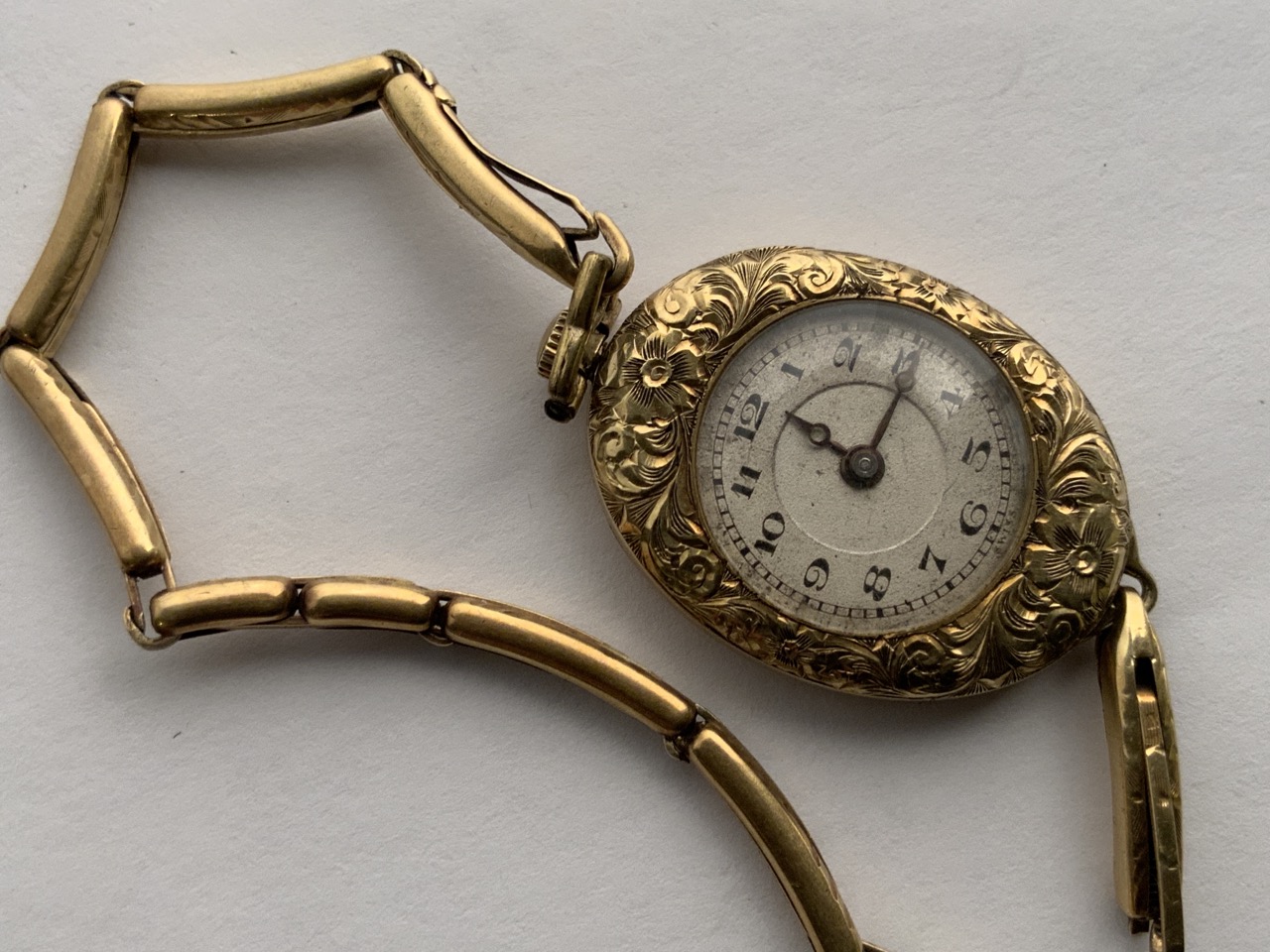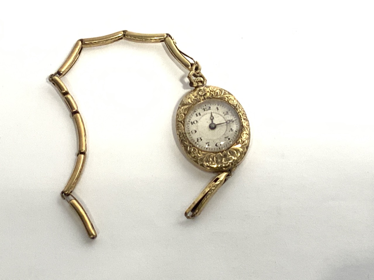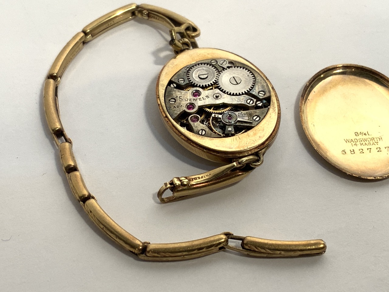 15J Lady's 14k yellow gold wristwatch. Band is 14k gold. Band is broken, watch not tested.
