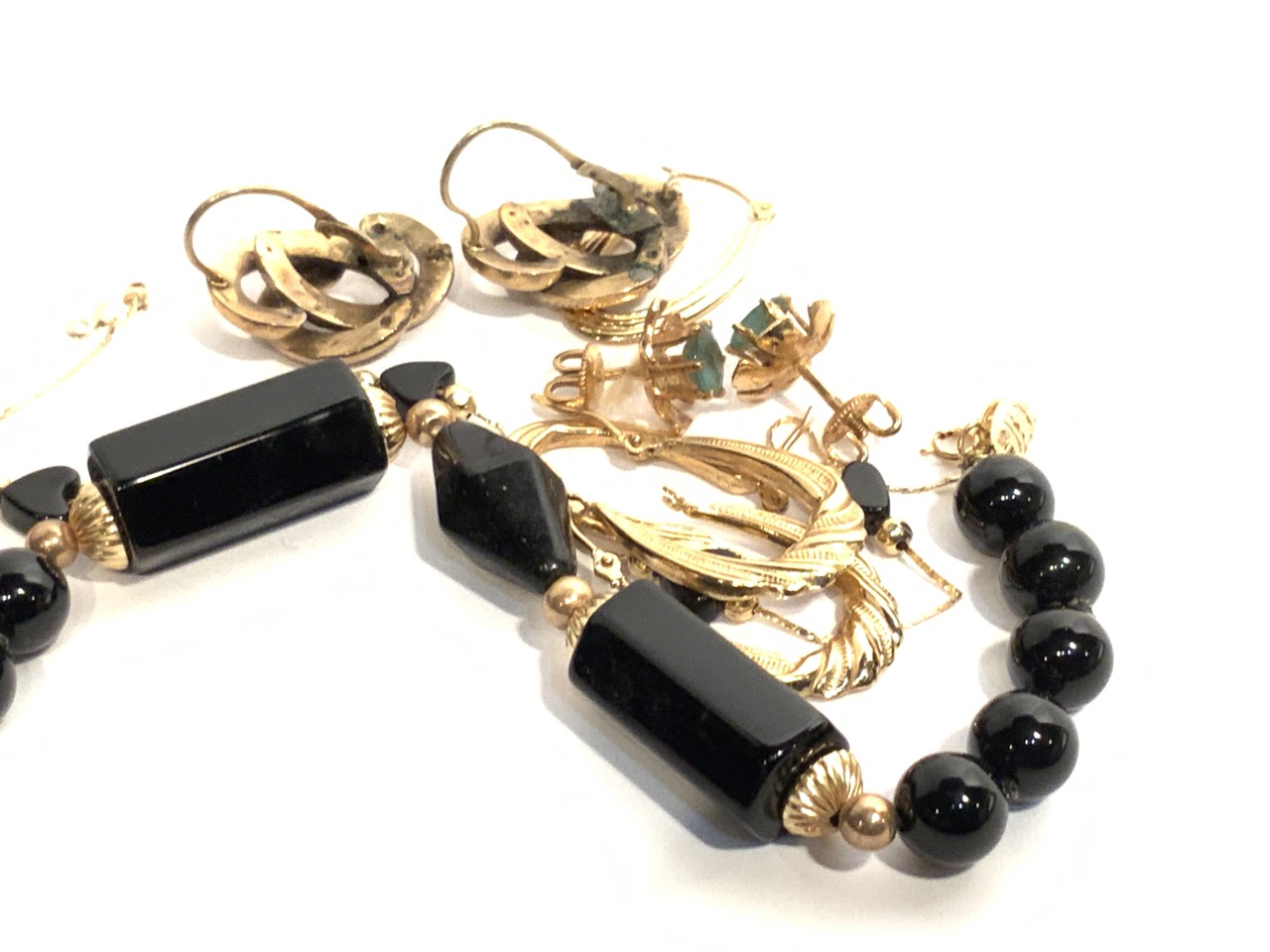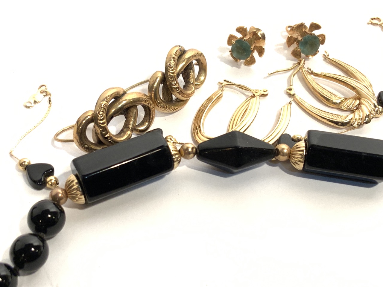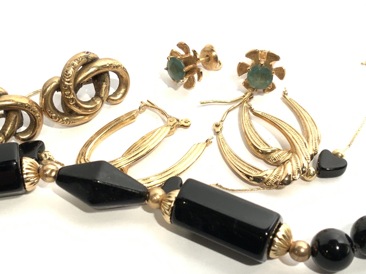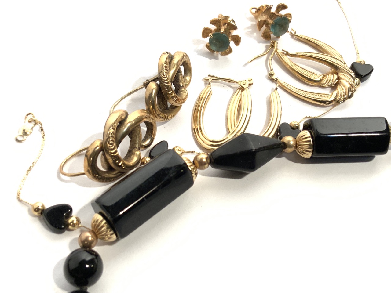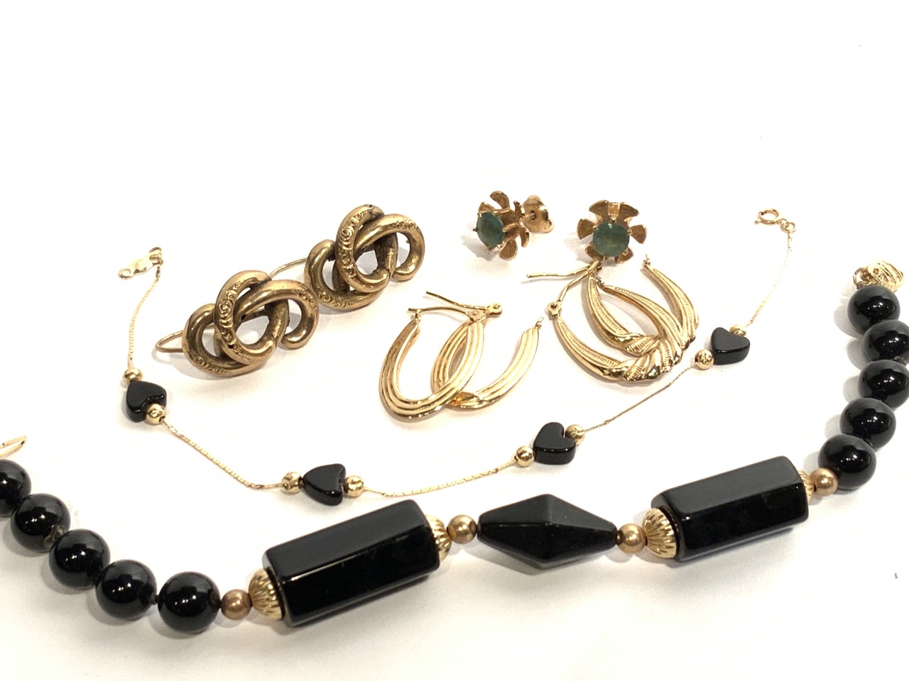 Assorted estate 14k gold jewelry. Earrings, Onyx bracelets etc.