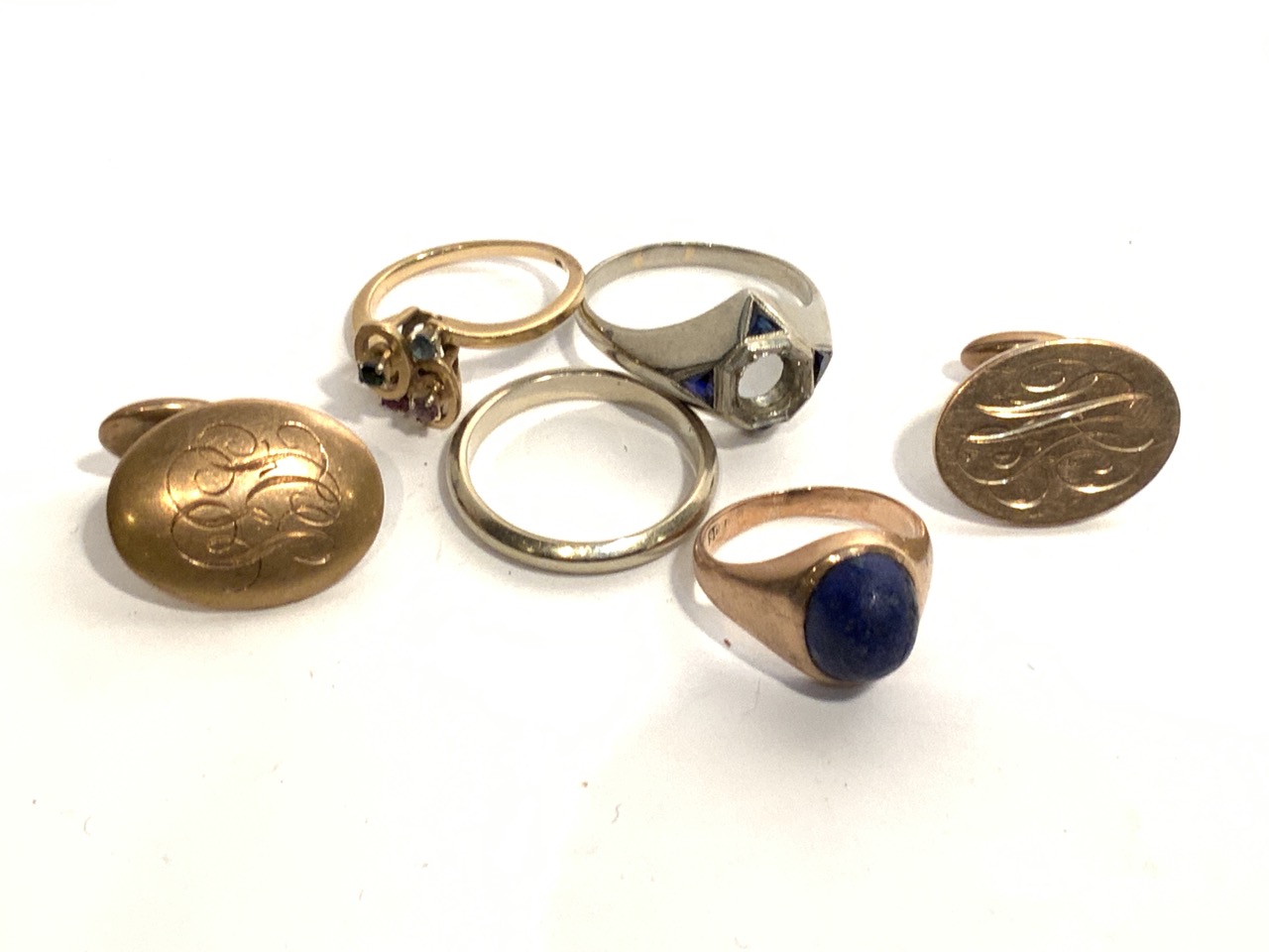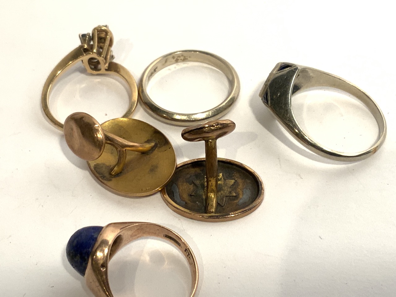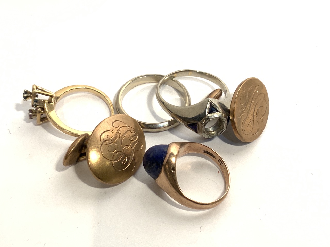 Assorted estate gold jewelry. 9ct-14k including 2 14k individual cufflinks, 14k white gold sapphire ring missing diamond, 9ct lapis ring etc.