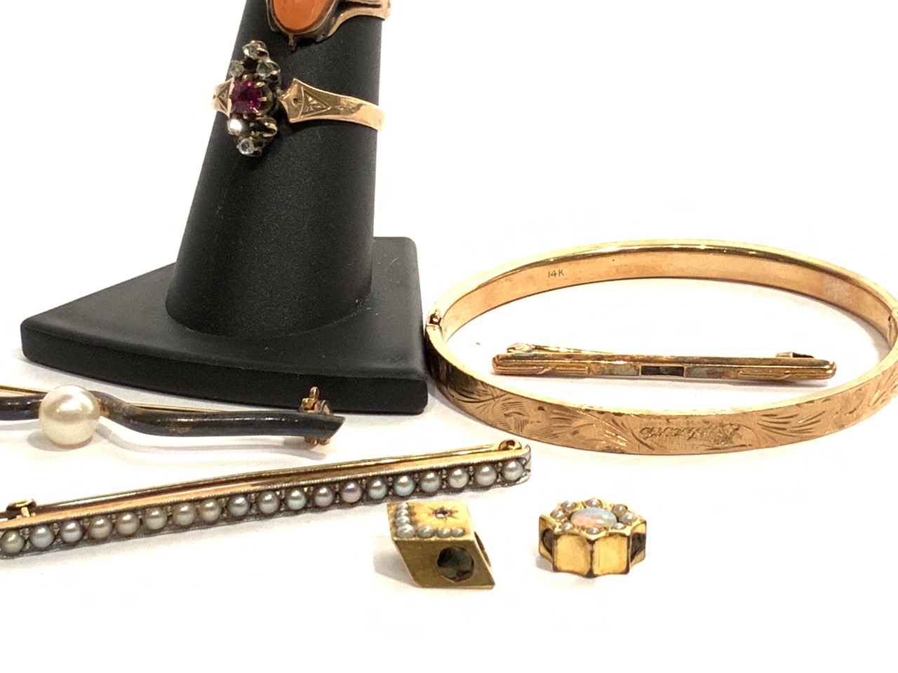 Assorted estate antique jewelry. All gold 10k-14k. Coral cameo ring, bracelet, pins, Victorian spacer charms and 19th c. gemstone ring.