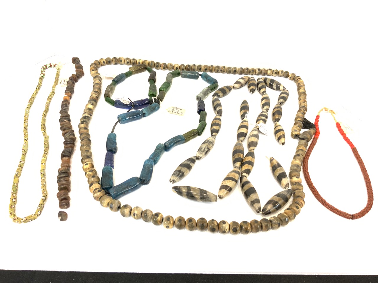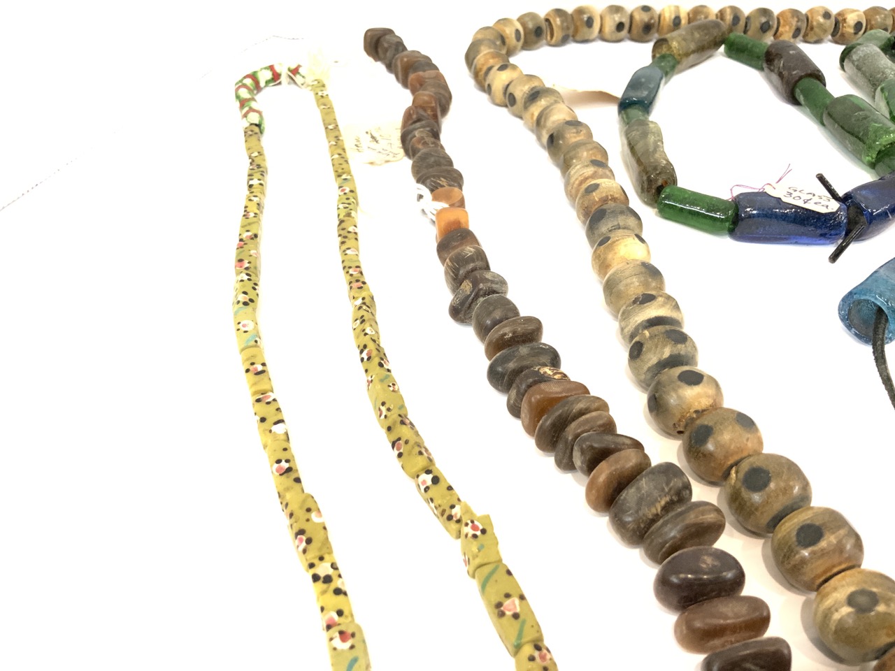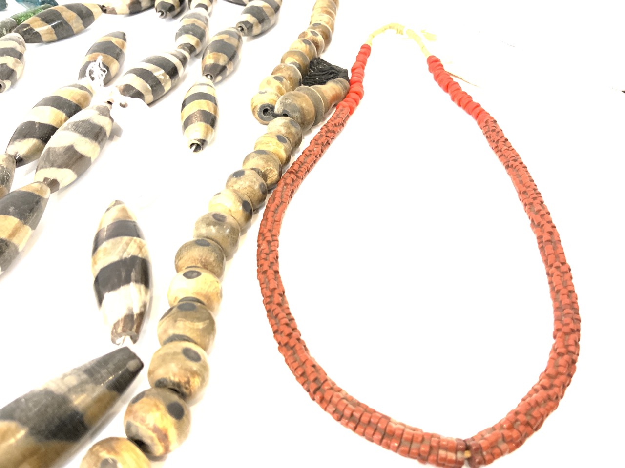 A compiled grouping of beads. Handmade Horn, Glass, Bauxite, and Powder Glass African Necklaces.