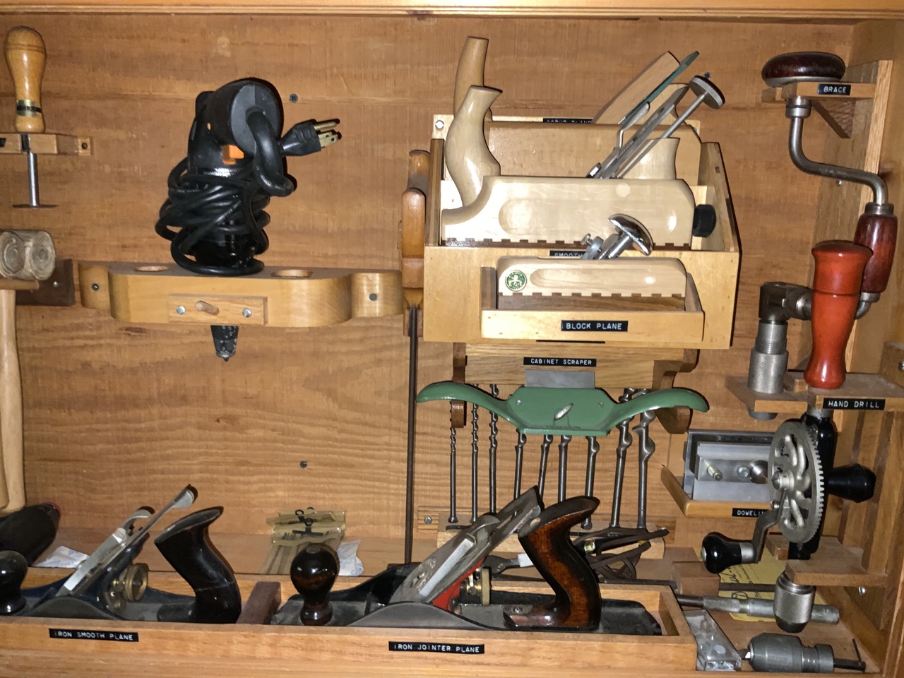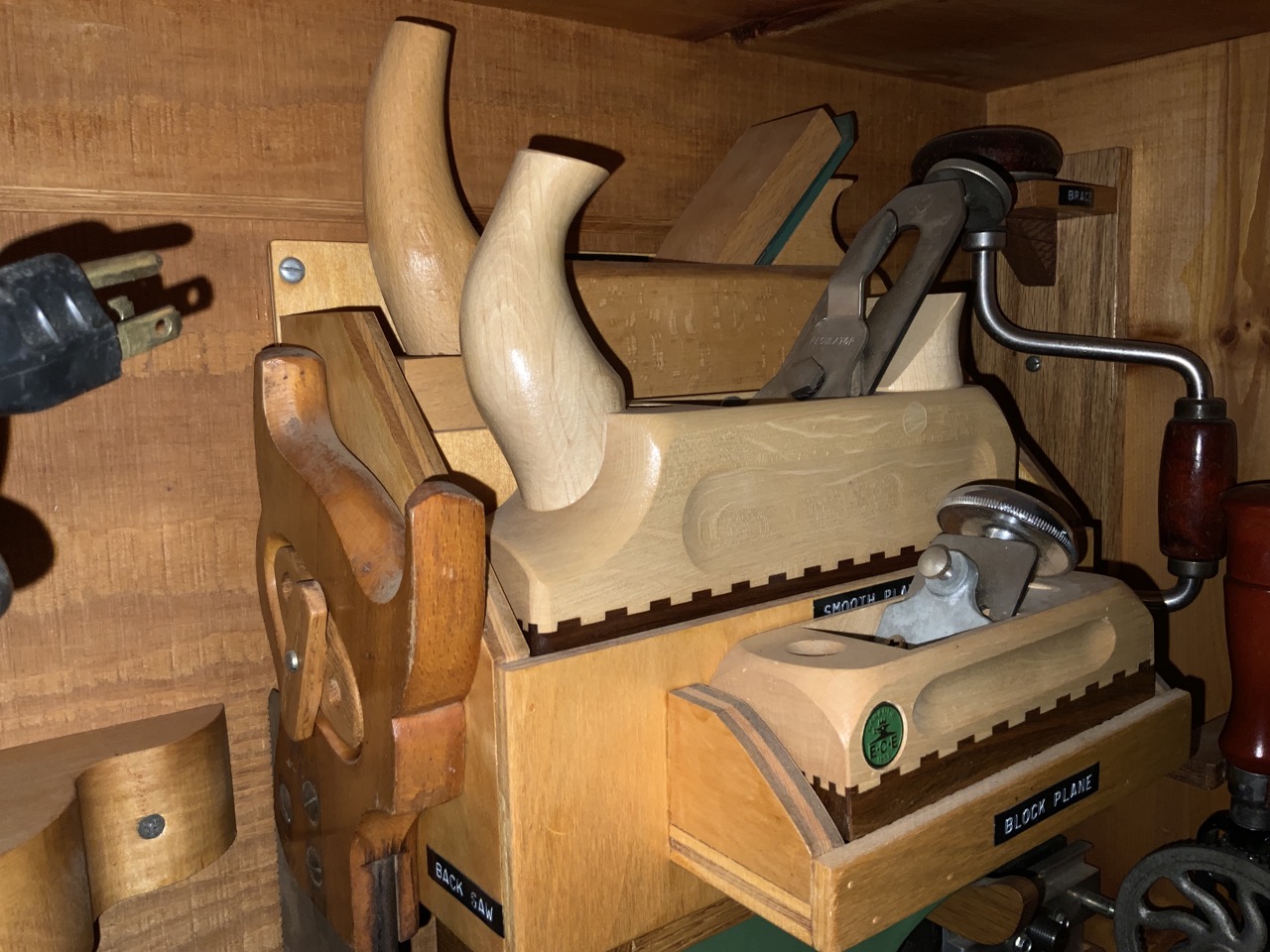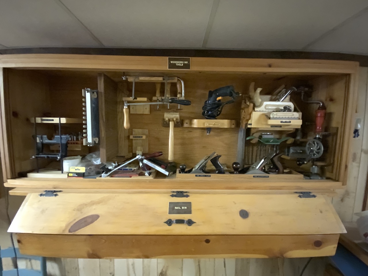Collection Of Woodworking Tools Located On Wall. Cabinet Is Optional. Tools Including E.C. Emmerich Block Planes, Stanley And Miller Falls Wood Planes, Dowling Jig, Joiner, Nail Bin Contents!