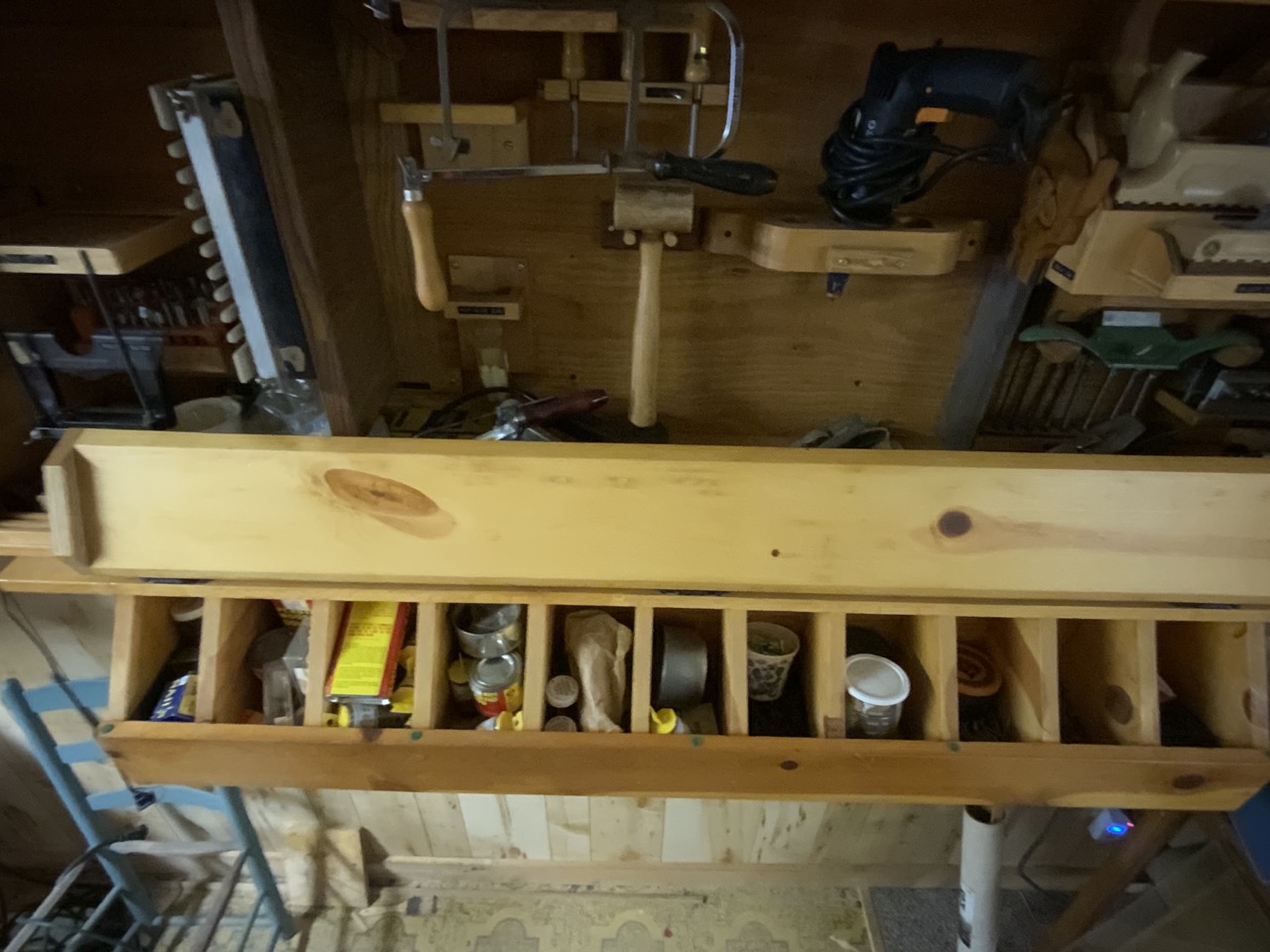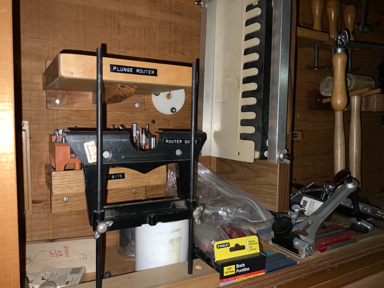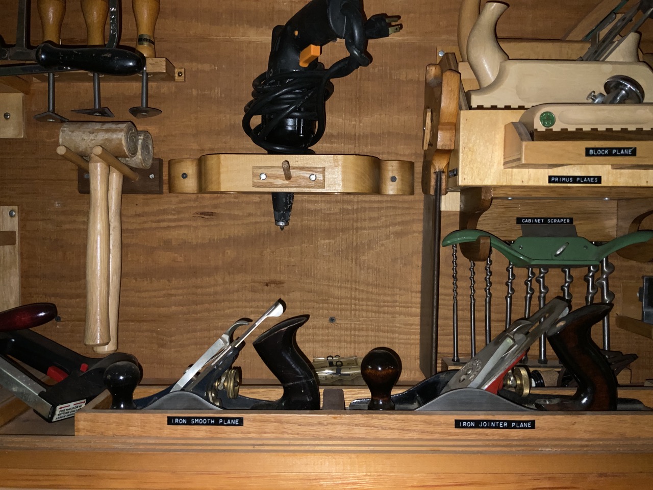 Collection Of Woodworking Tools Located On Wall. Cabinet Is Optional. Tools Including E.C. Emmerich Block Planes, Stanley And Miller Falls Wood Planes, Dowling Jig, Joiner, Nail Bin Contents!