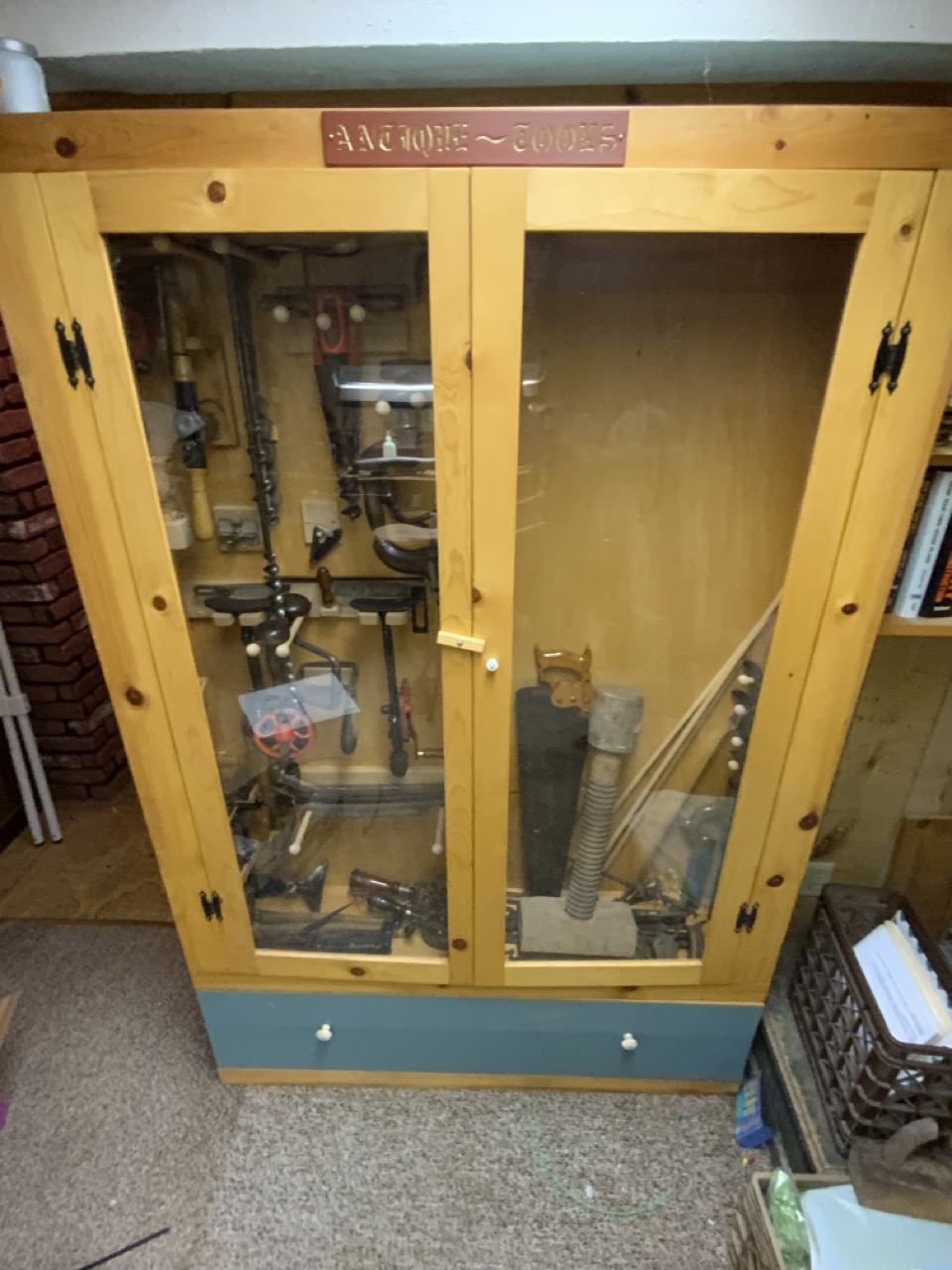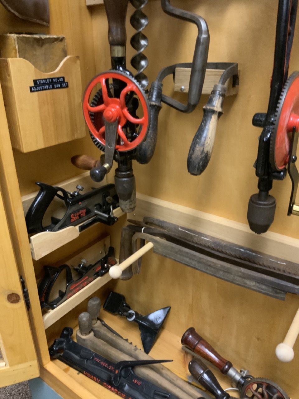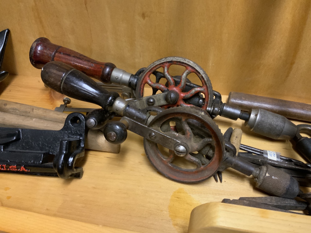 Antique Tools. Cabinet Is Included And Optional. Stanley 78 woodplane, 1910 Disston, Stanley 42 Saw Set, Drills, Saws and all content seen in photograph preview.