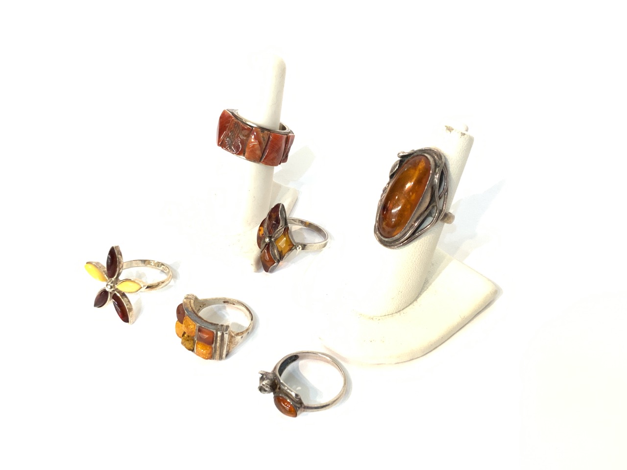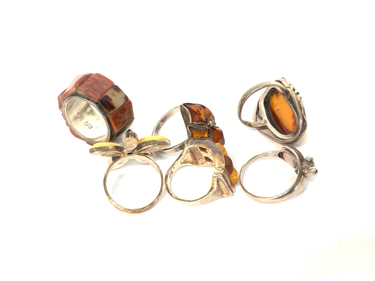 Six estate sterling silver rings. Amber stones.