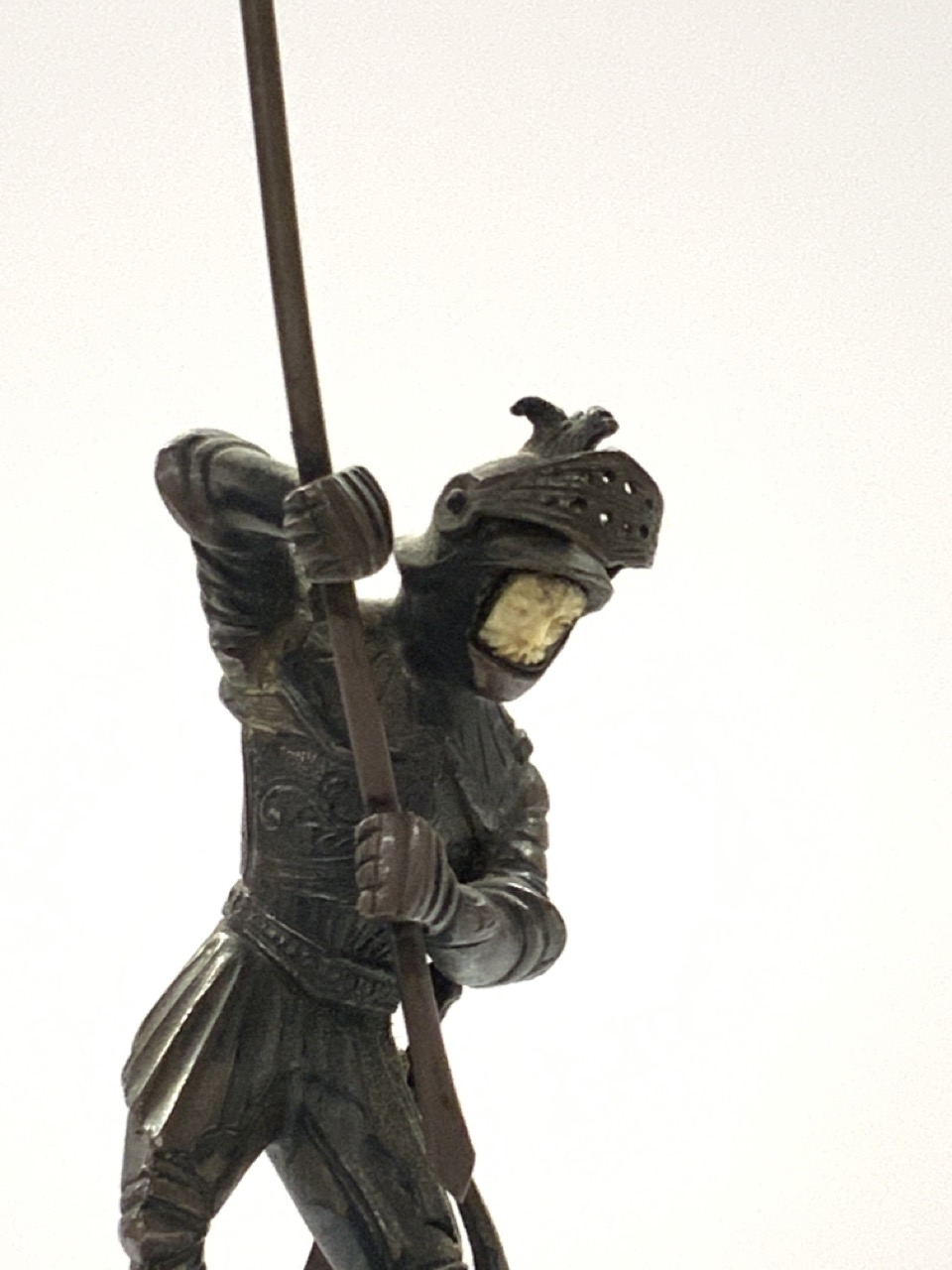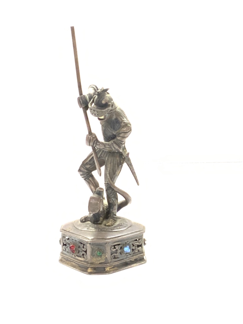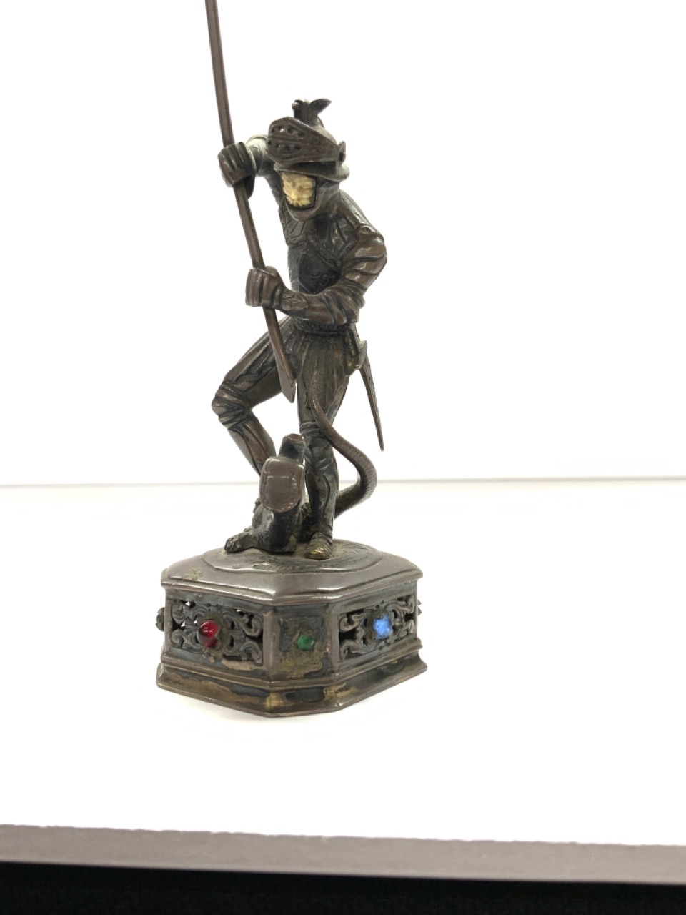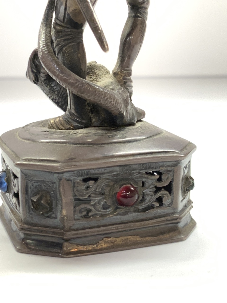 A German silver jeweled knight killing a serpent figure. Carved bone face. One jewel missing.