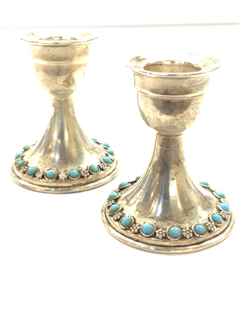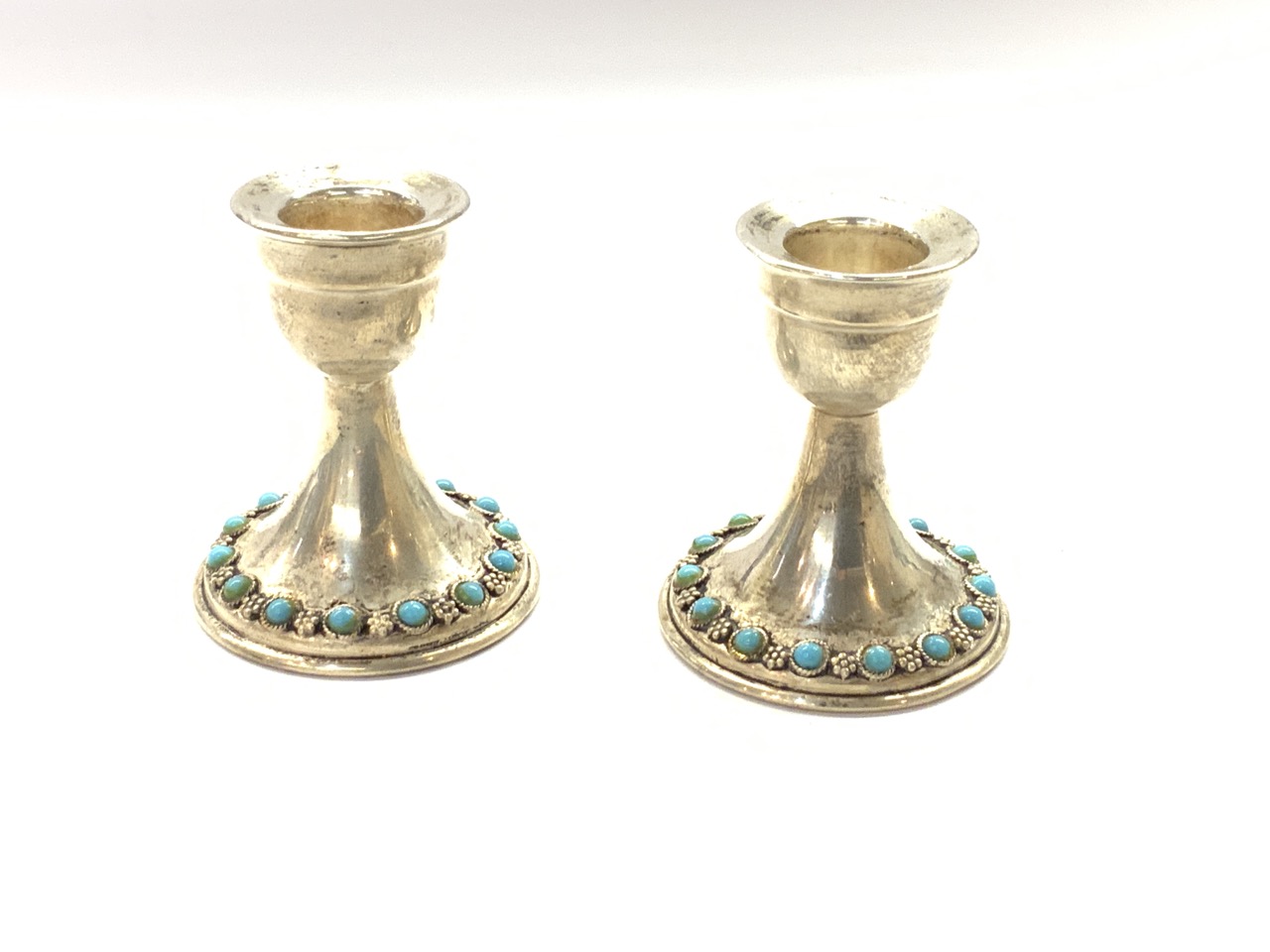 A pair of small sterling silver candlesticks with Persian turquoise stones.