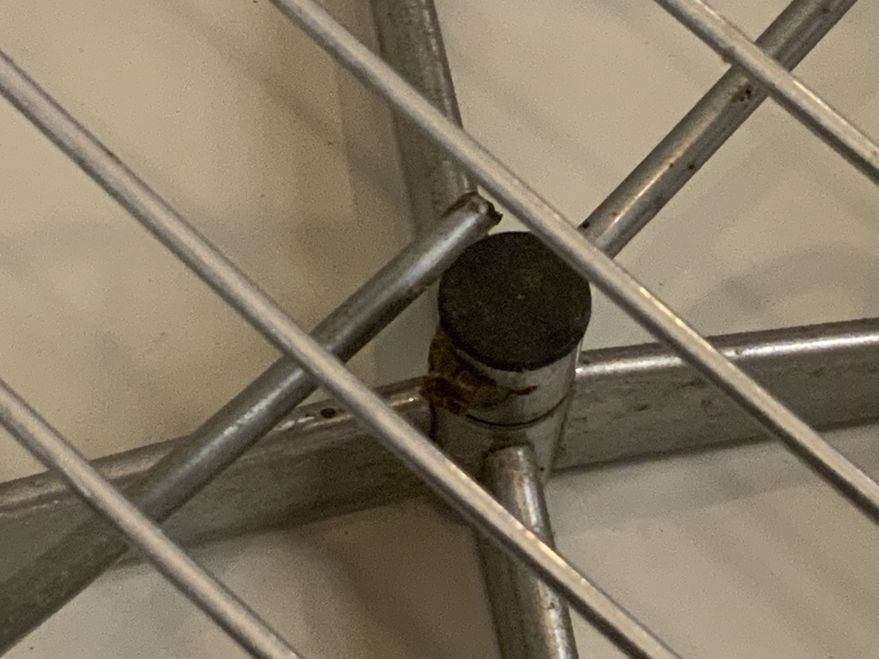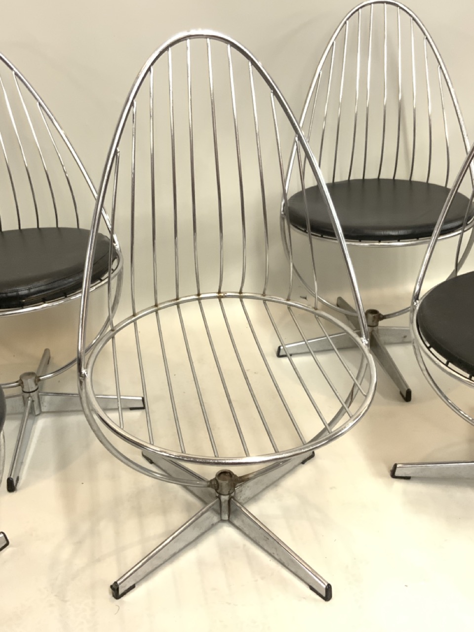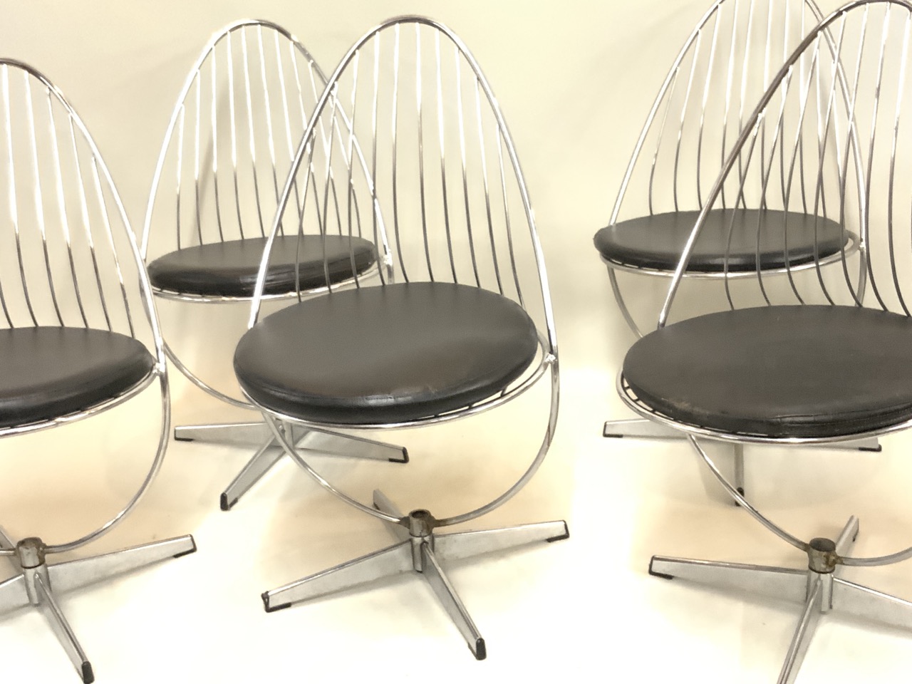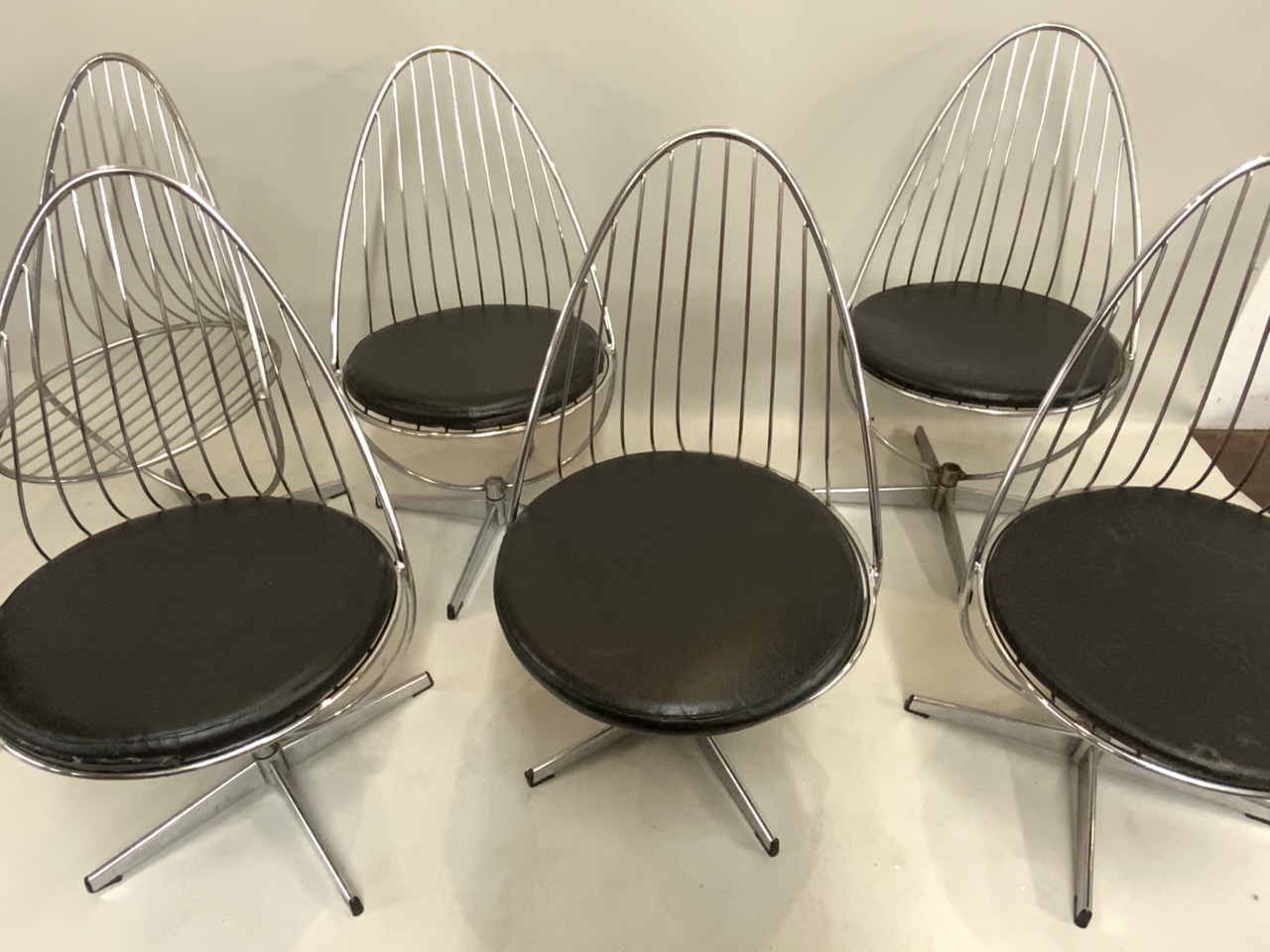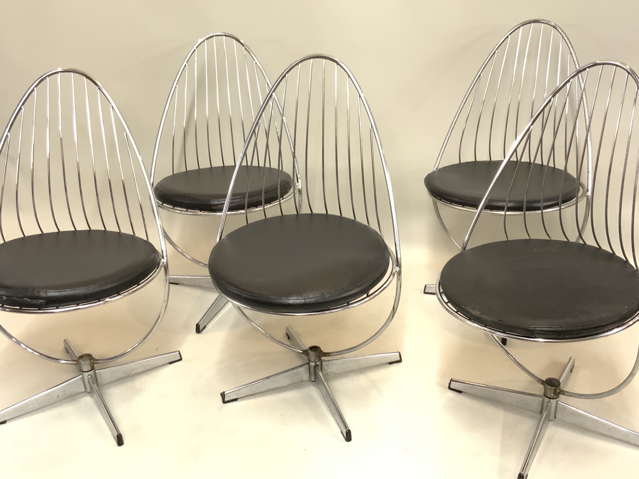 Set Of Six (6) Chrome kitchen chairs with spindle cone form backs. One chair is broken at base needing welding and missing black vinyl circular cushion.