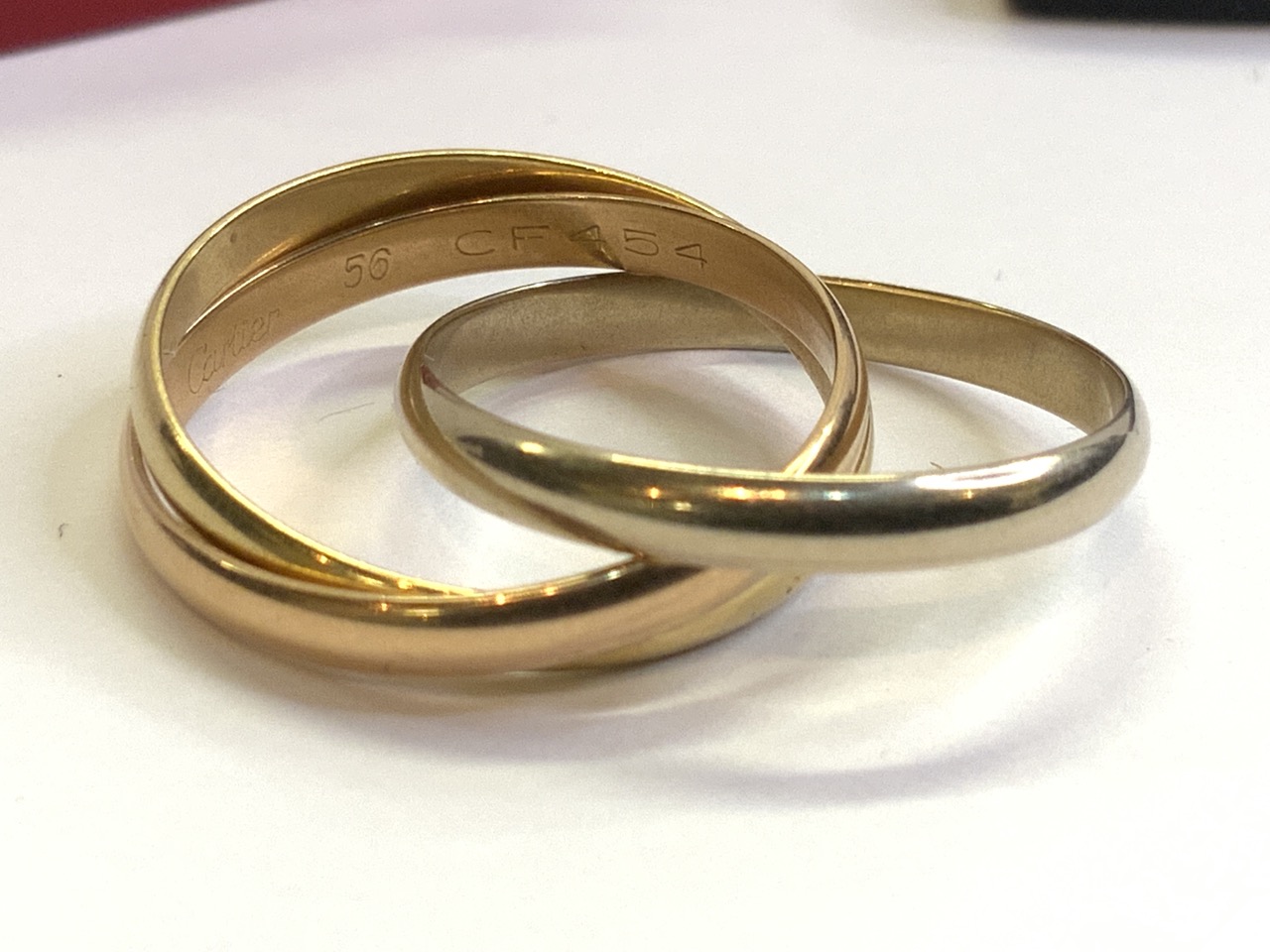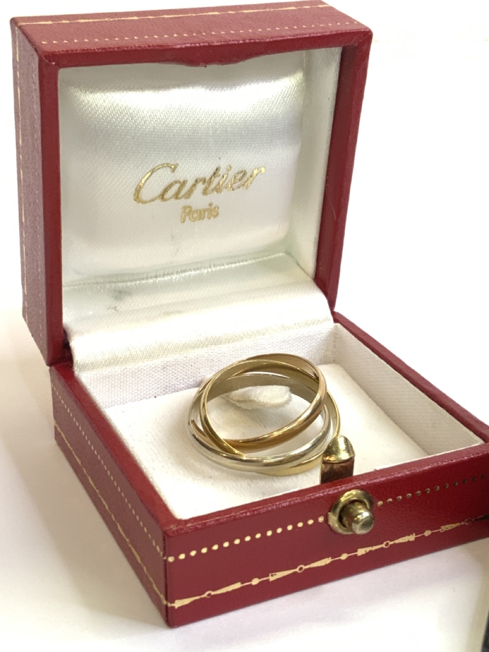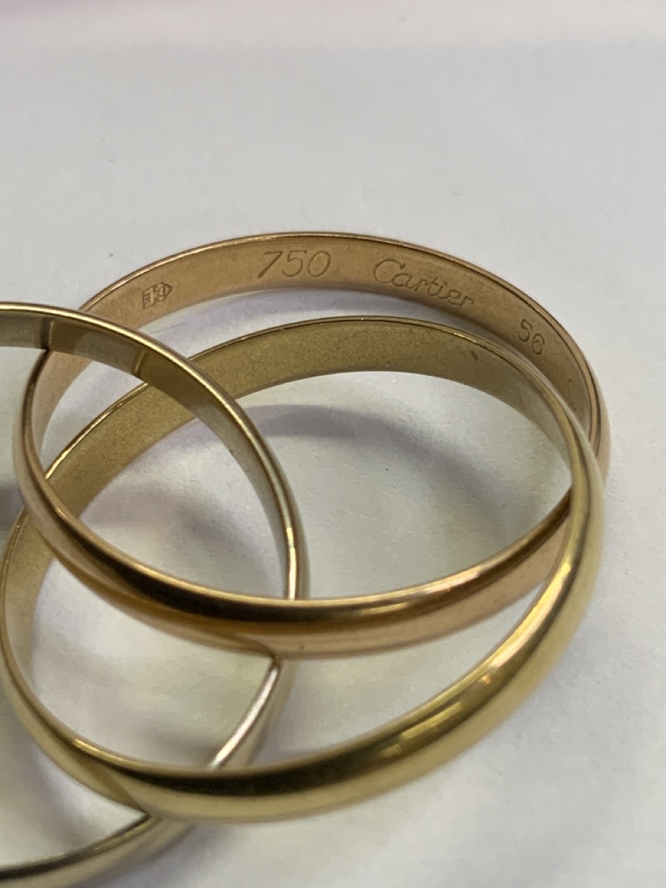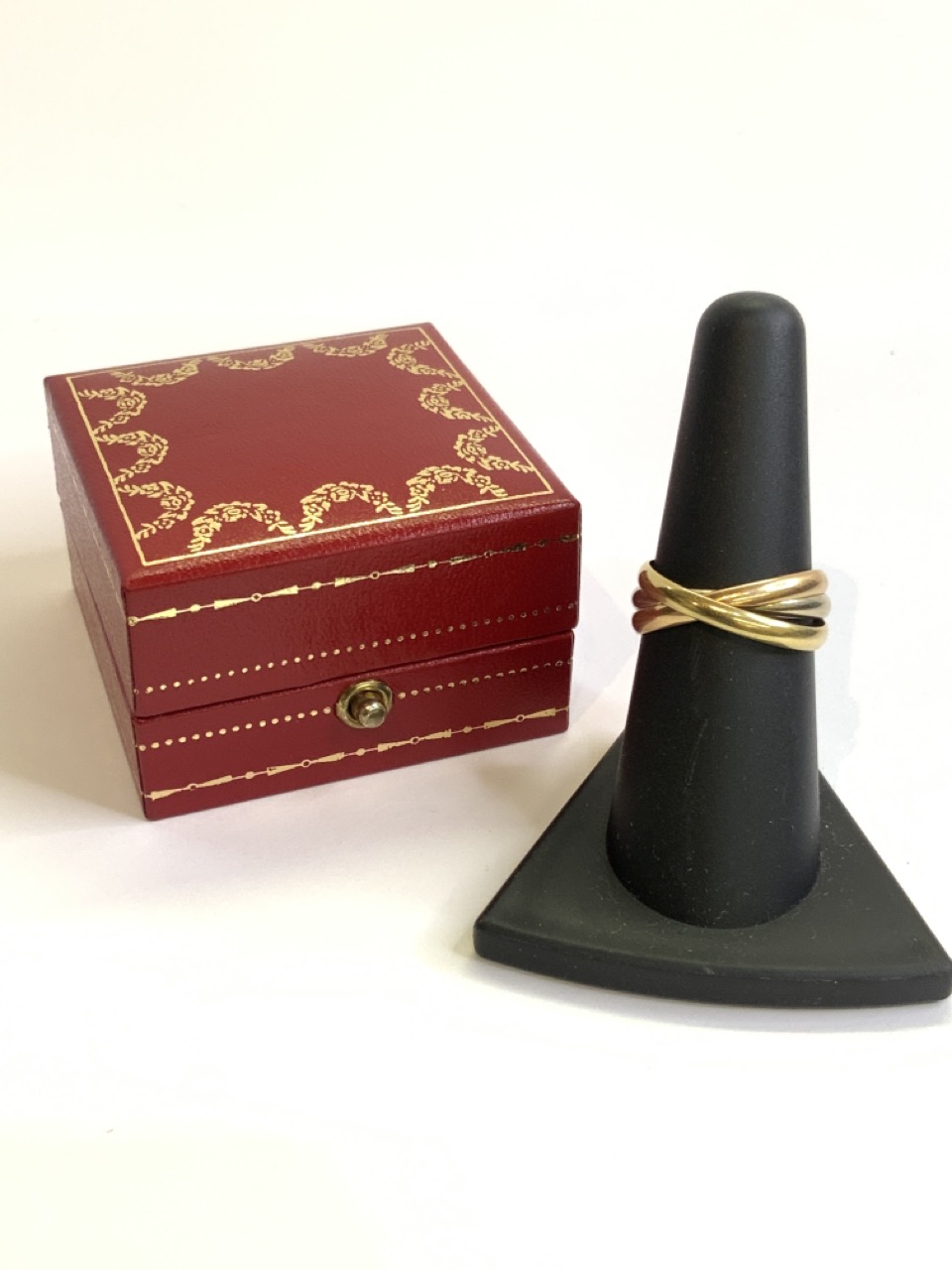 Cartier 18k Trinity Tri-Gold band ring. A fine ring signed by Cartier 750 with Serial number. A fine trio set with yellow, white and rose gold bands. Comes with original box.