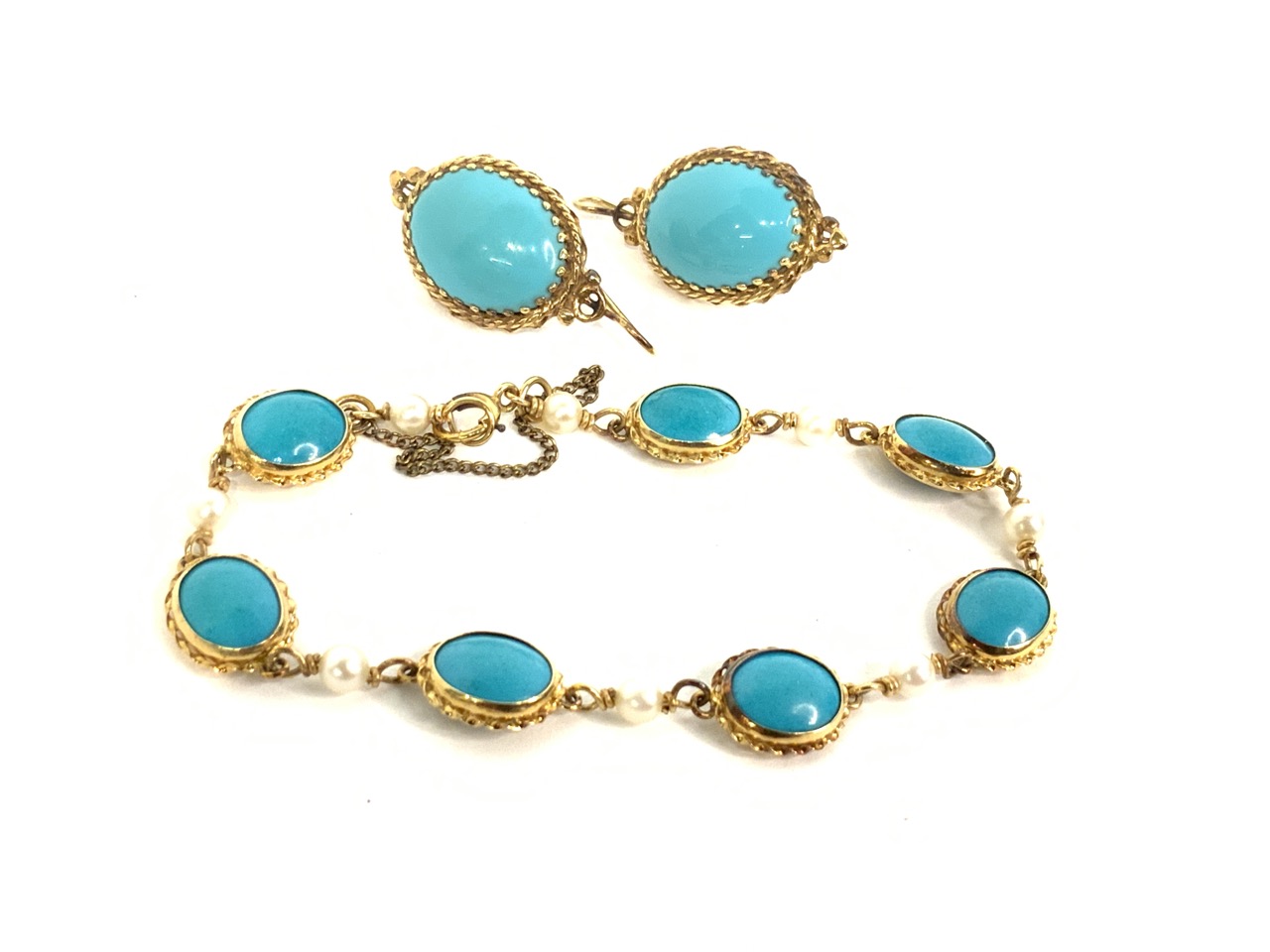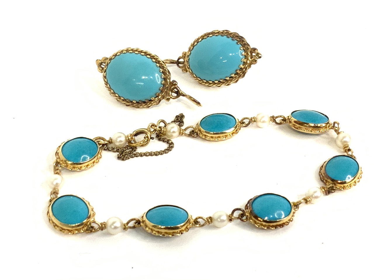 14k yellow gold Persian turquoise with pearls bracelet and earrings set.