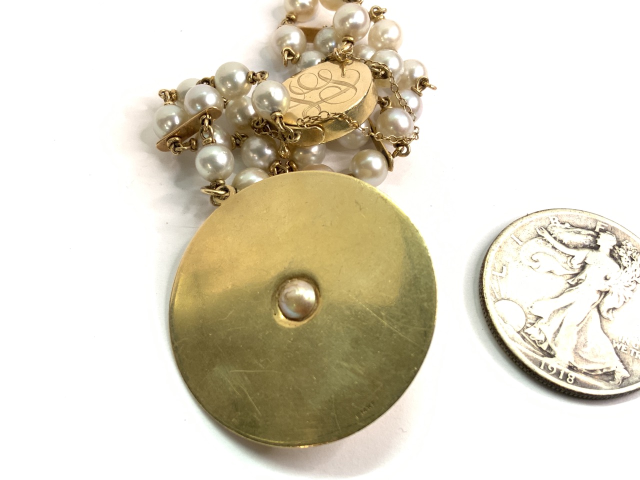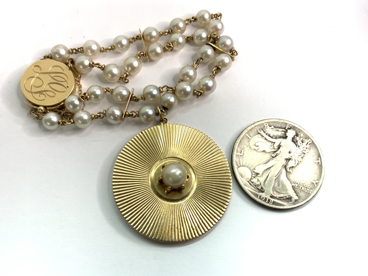 14k double strand pearl bracelet with gold 1/4" clasp and large disc charm pendant approx. 1 1/2".