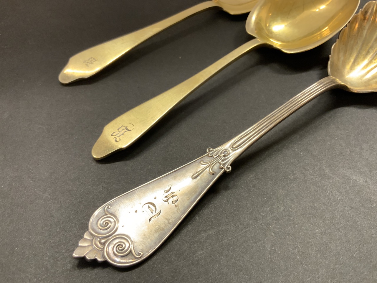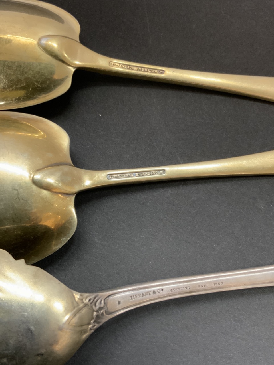 Three (3) Tiffany & Co. sterling silver serving spoons. Two having a gold wash.