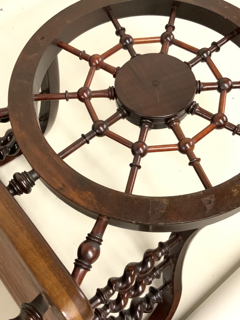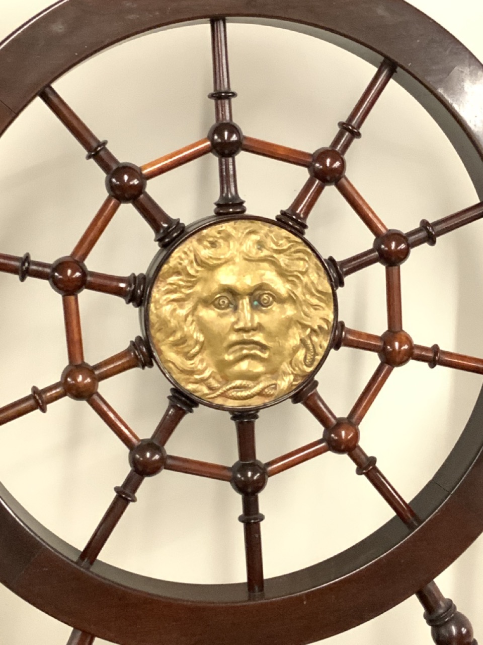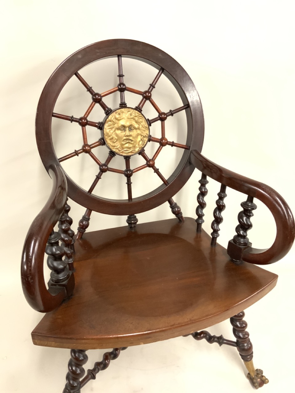 Victorian web back mahogany arm chair with carved bronze plaque of Medusa's face.