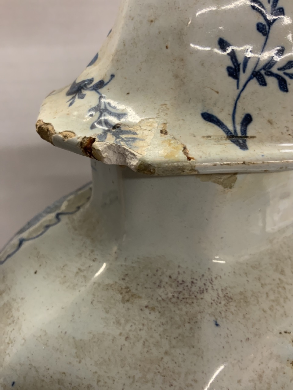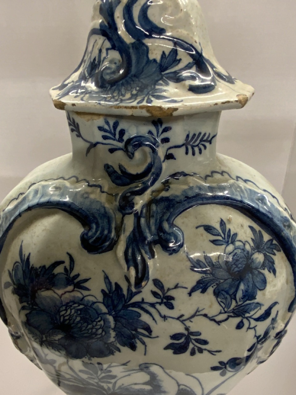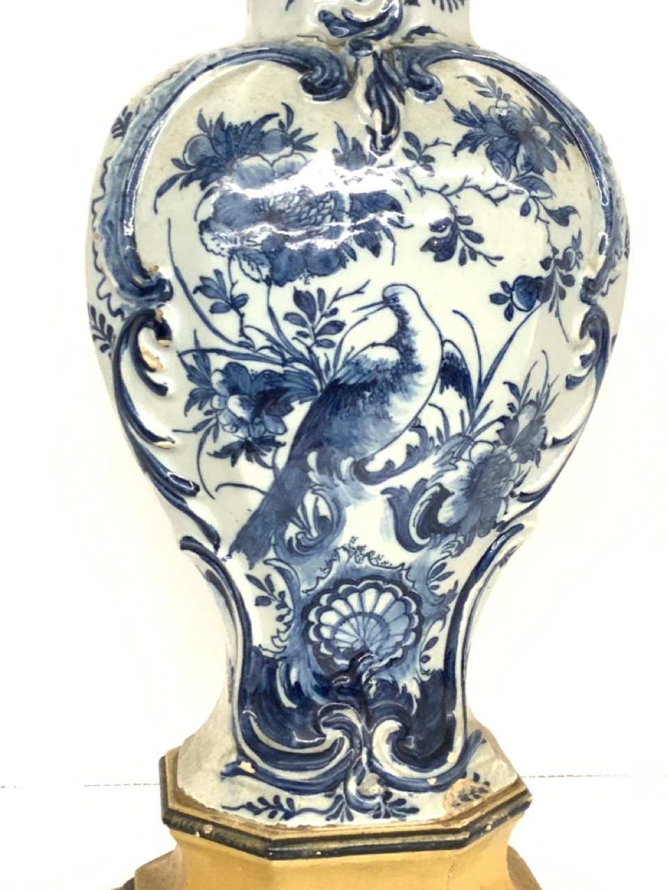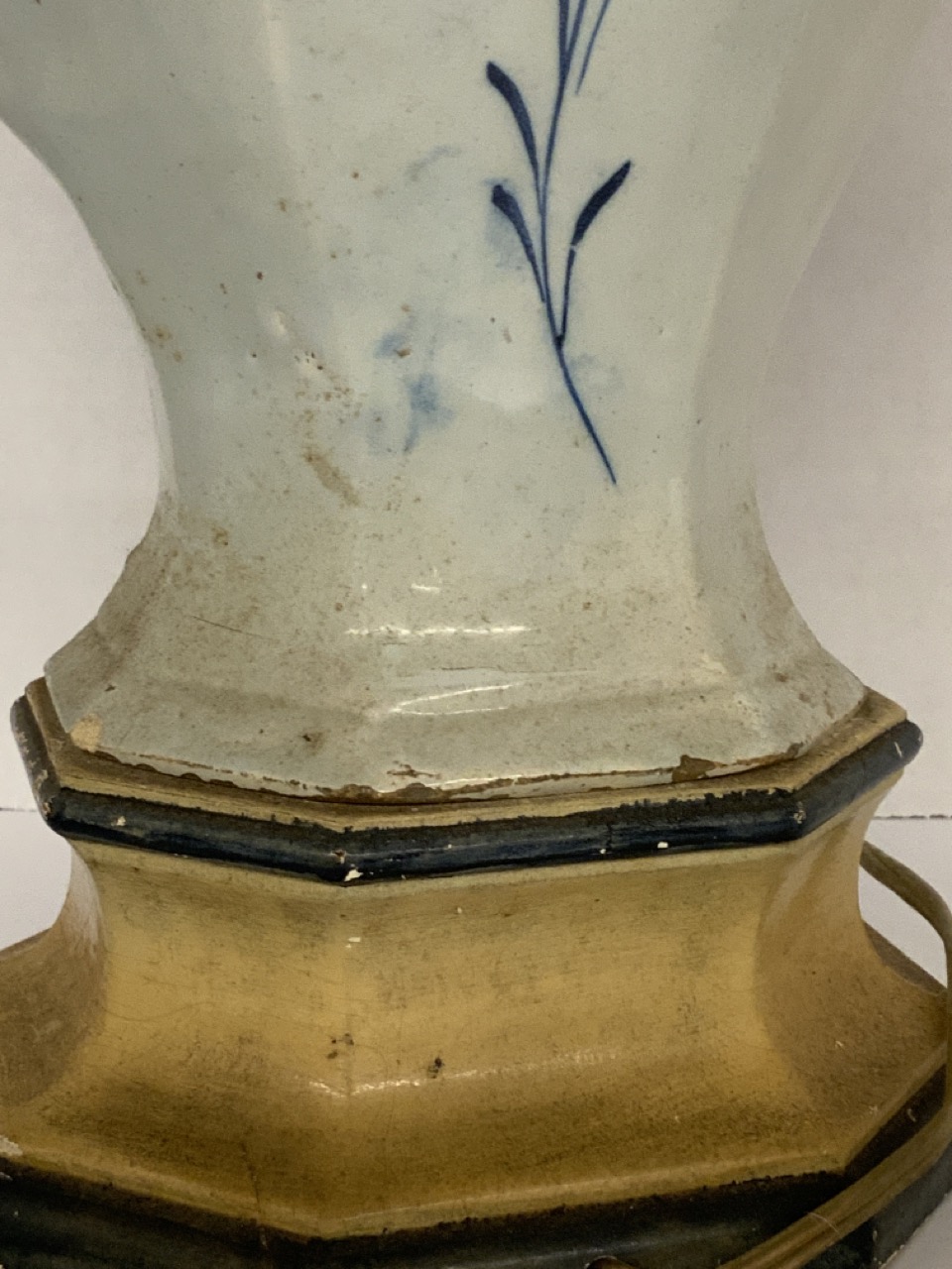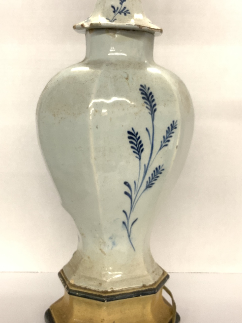 An 18th century Delft Urn electrified table lamp. Some older chips, flakes seen. Not removed from base to inspect base.