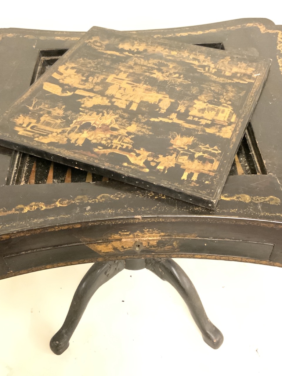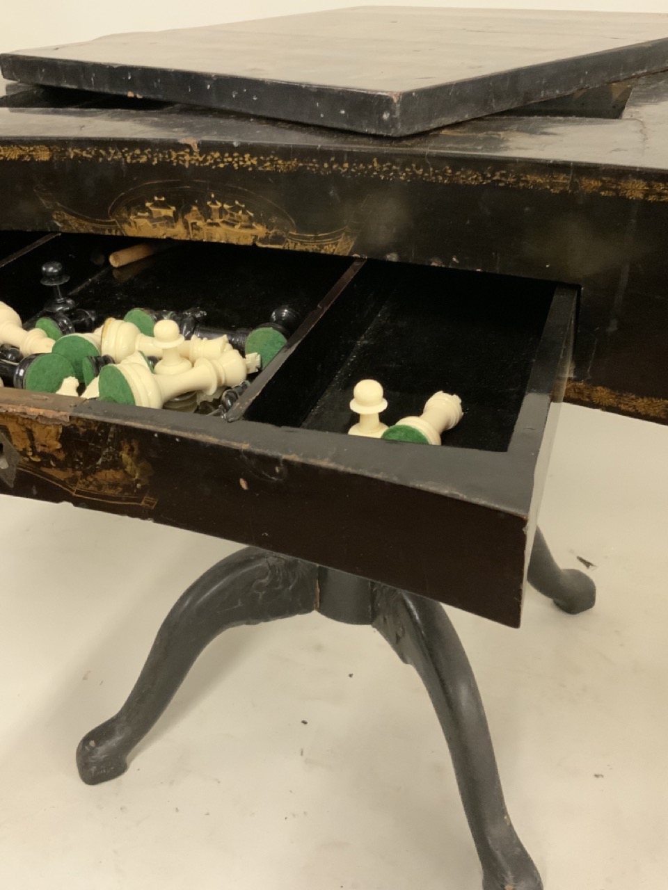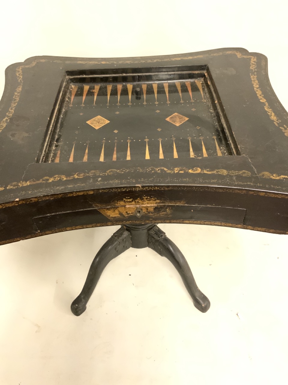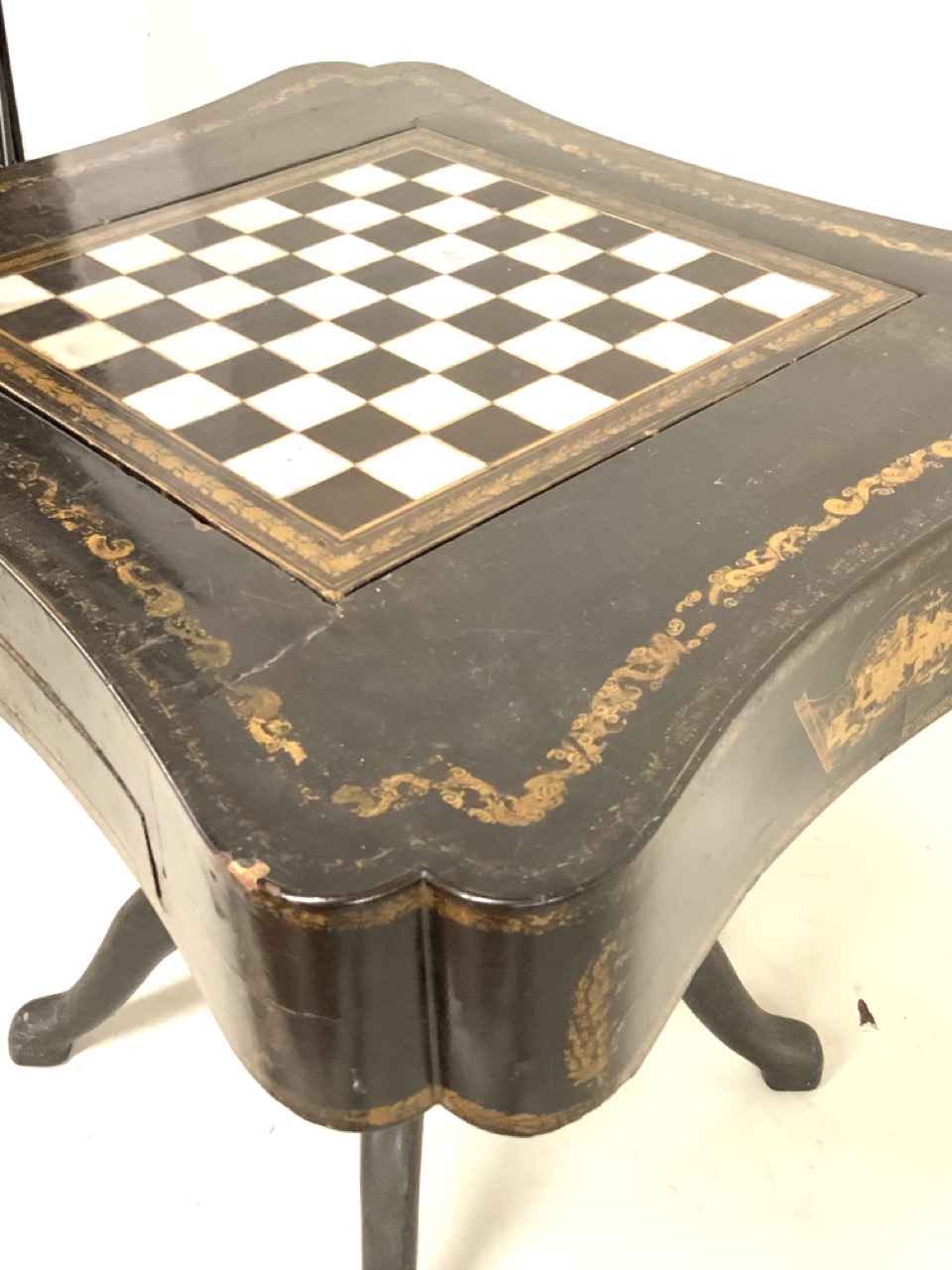 A fine 19th century English black lacquered Chinoserie gold gilt games table with reversible mother of pearl chess board top. Chinese themed gold gilt decoration and foliage with landscape. Some wear noted. Table needs restoration and cleaning.