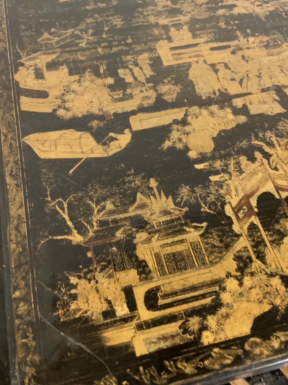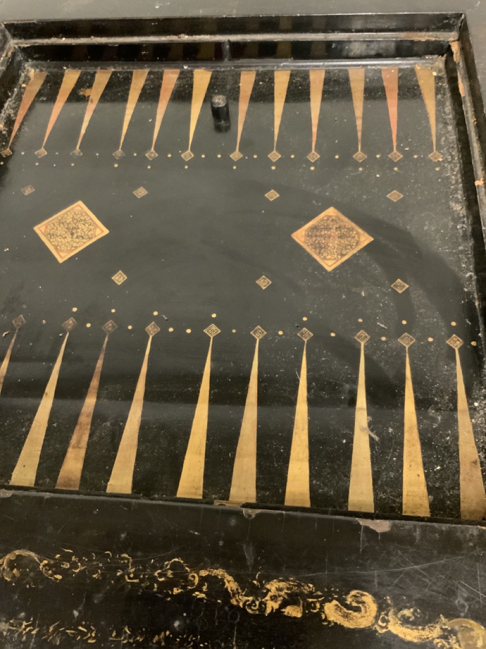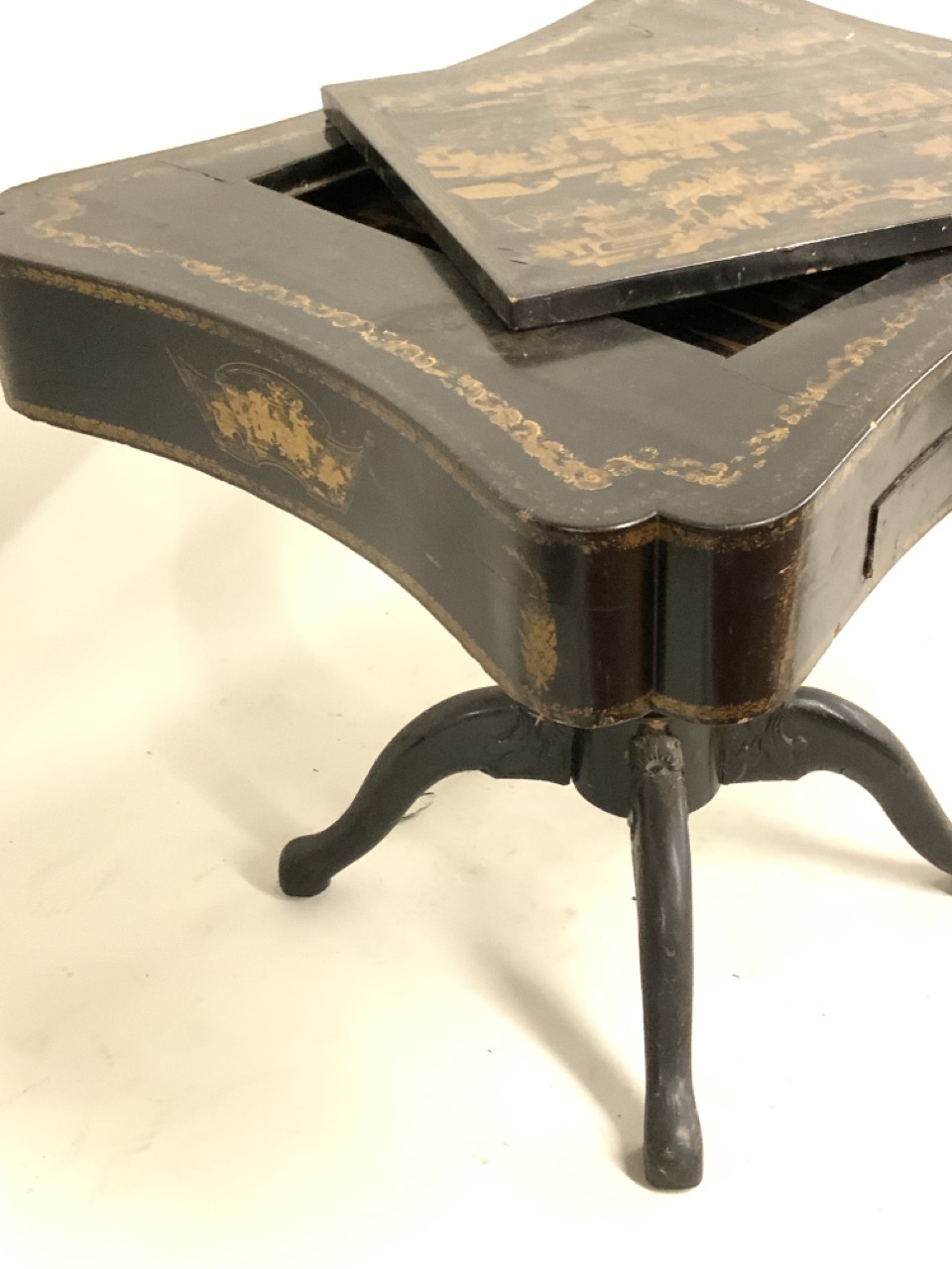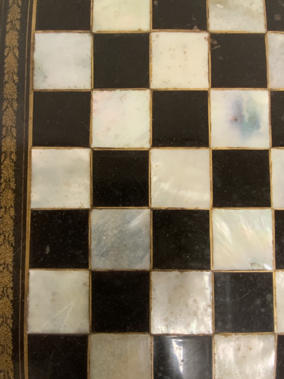 A fine 19th century English black lacquered Chinoserie gold gilt games table with reversible mother of pearl chess board top. Chinese themed gold gilt decoration and foliage with landscape. Some wear noted. Table needs restoration and cleaning.