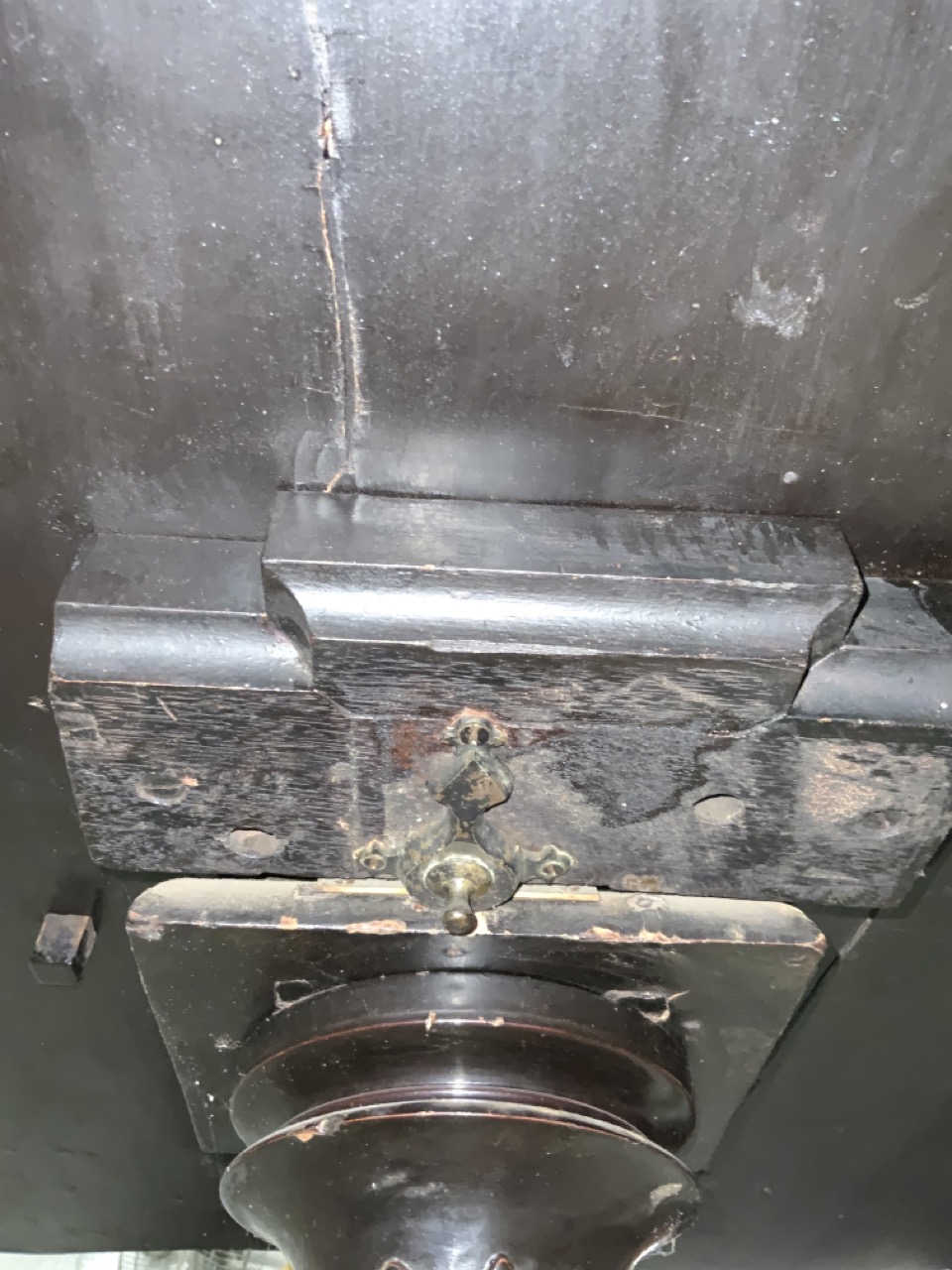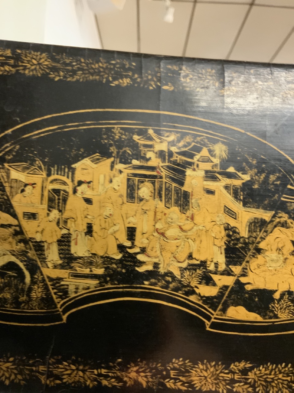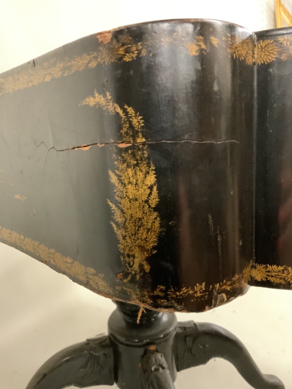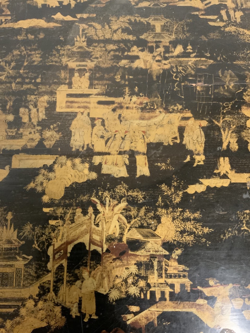 A fine 19th century English black lacquered Chinoserie gold gilt games table with reversible mother of pearl chess board top. Chinese themed gold gilt decoration and foliage with landscape. Some wear noted. Table needs restoration and cleaning.