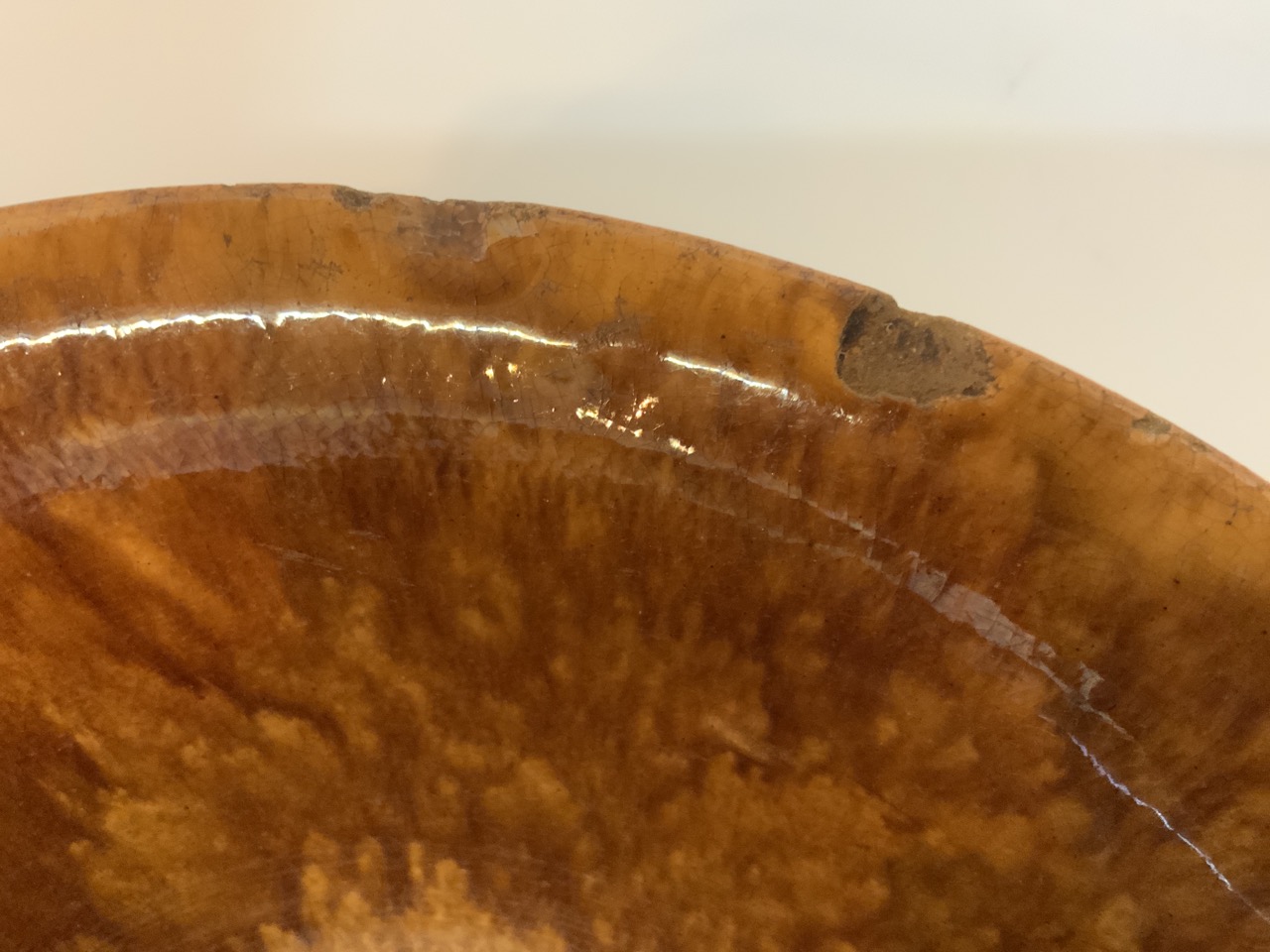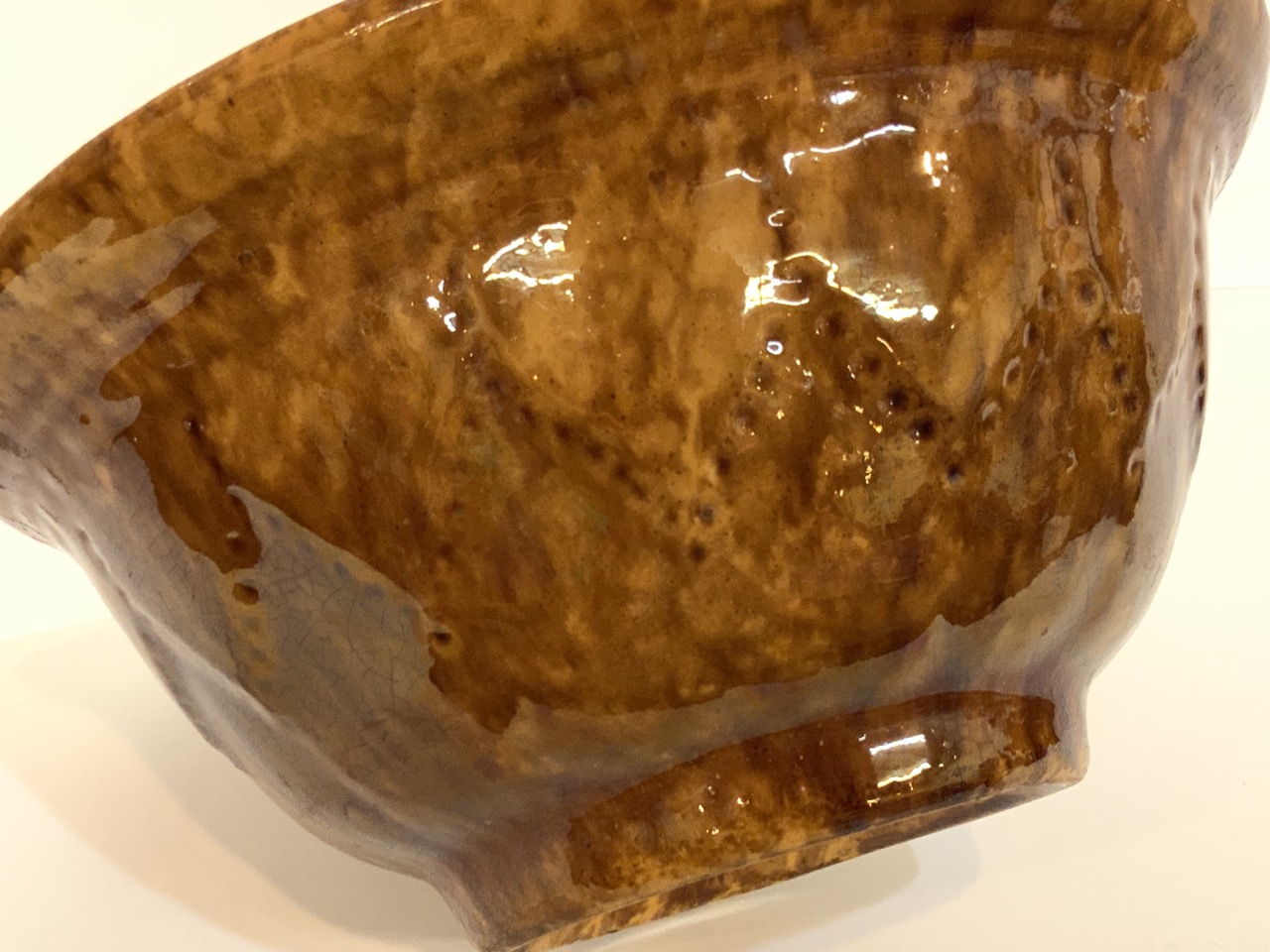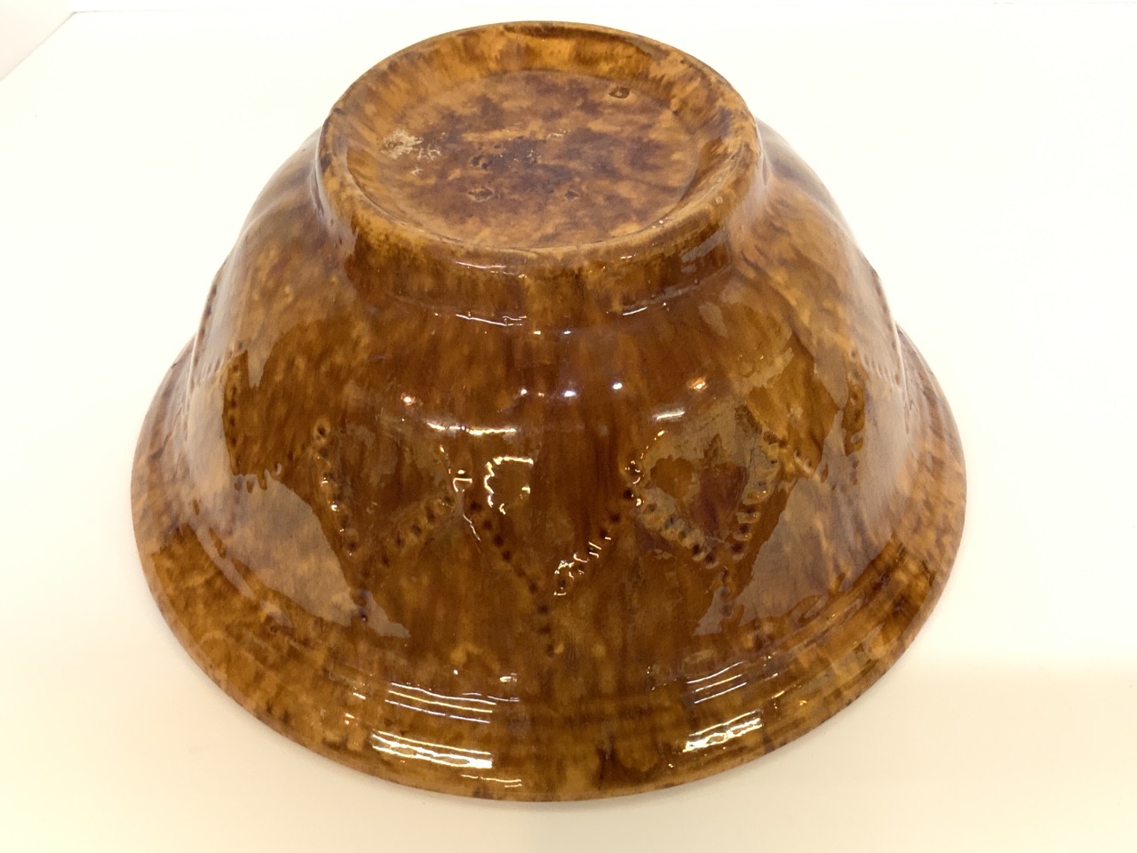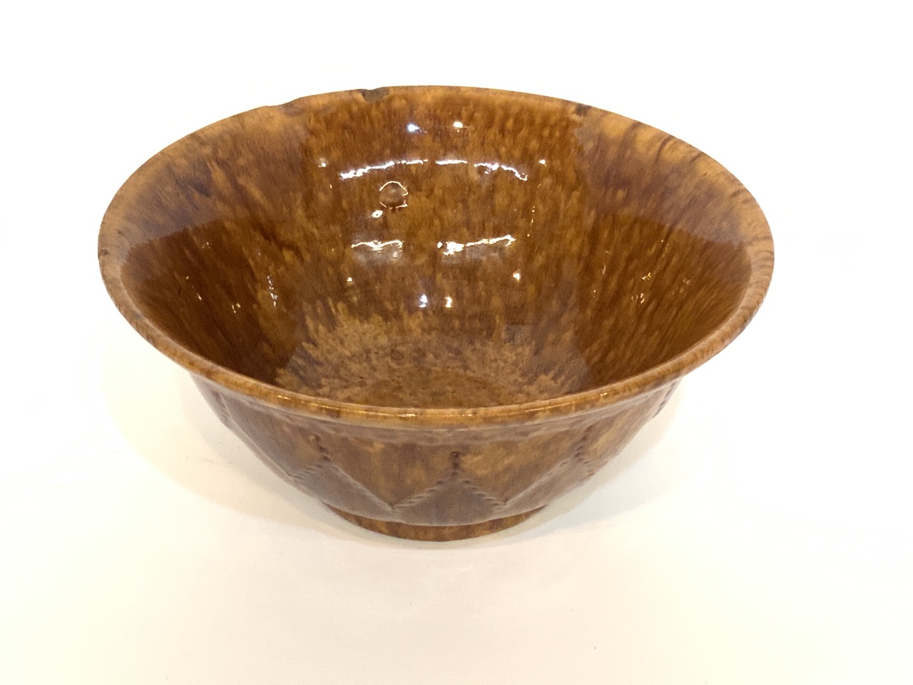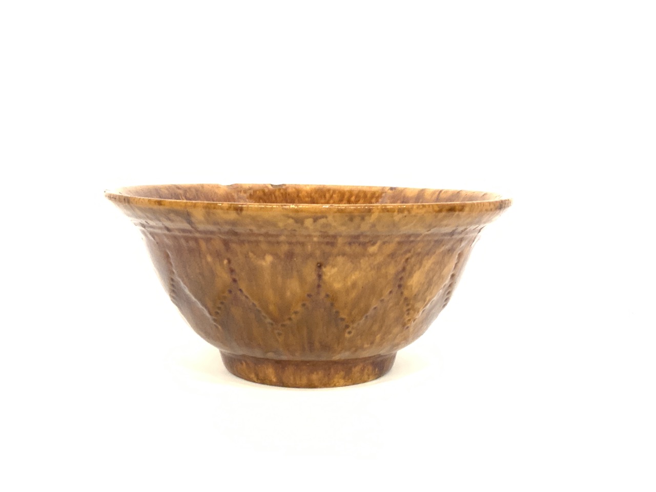 Bennington Rockingham brown spongeware mixing bowl with crown embossed pattern.