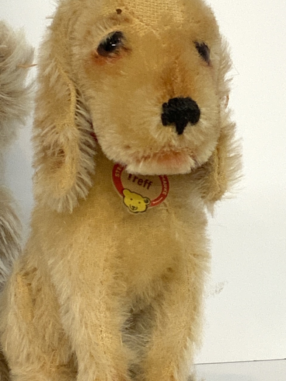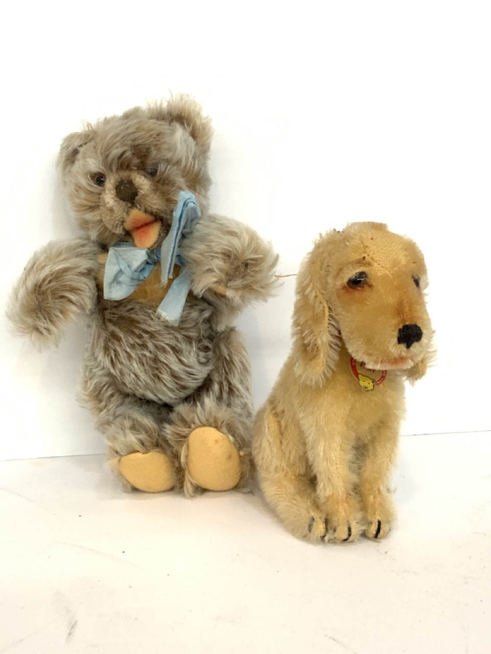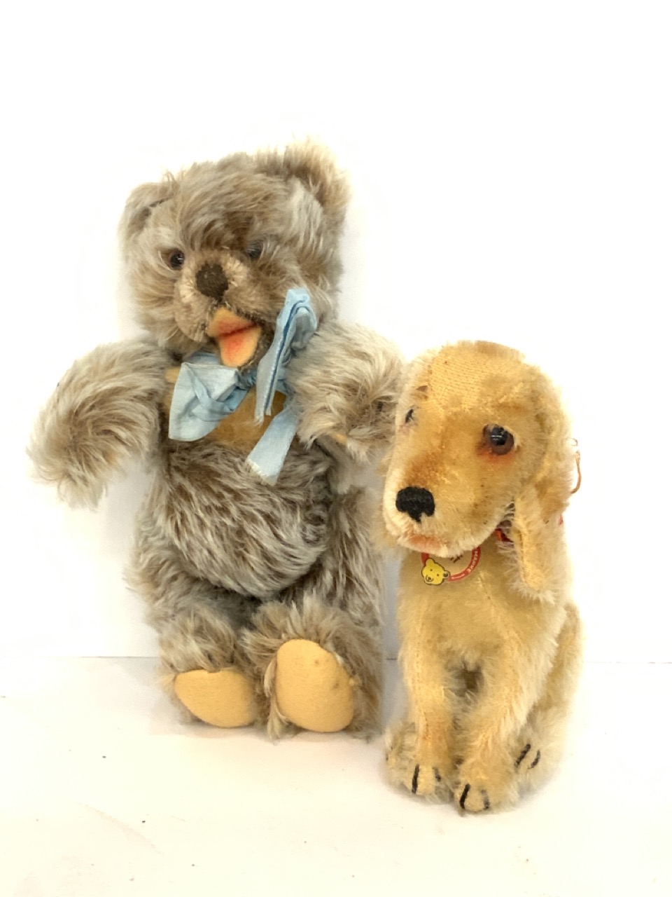 1950's Steiff Bear with blue ribbon, 8" height and Steiff "Treff" mohair dog.