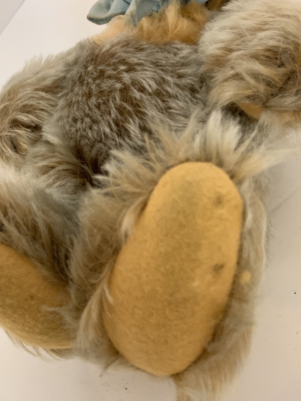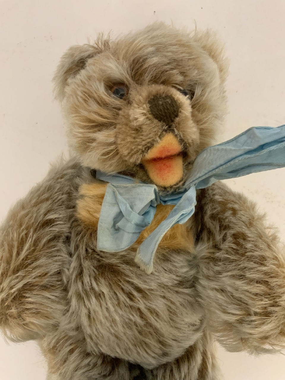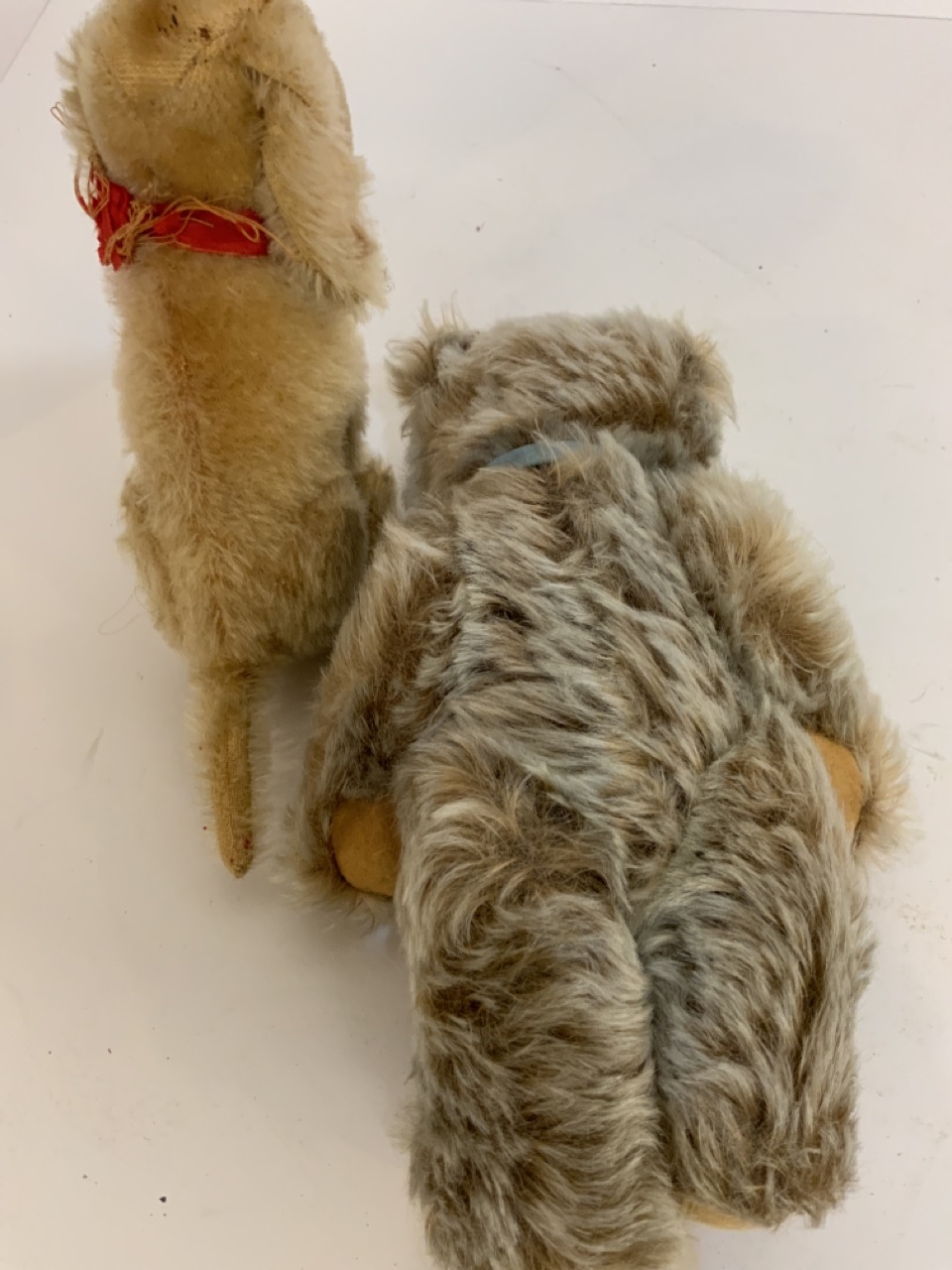 1950's Steiff Bear with blue ribbon, 8" height and Steiff "Treff" mohair dog.