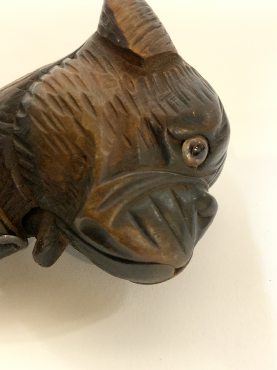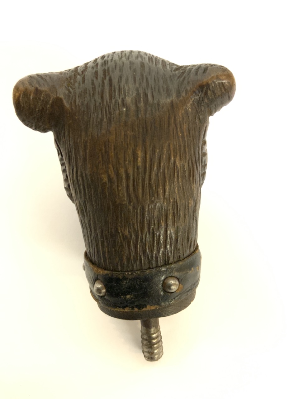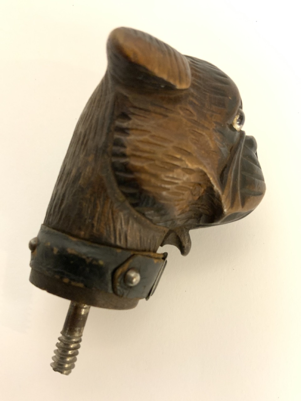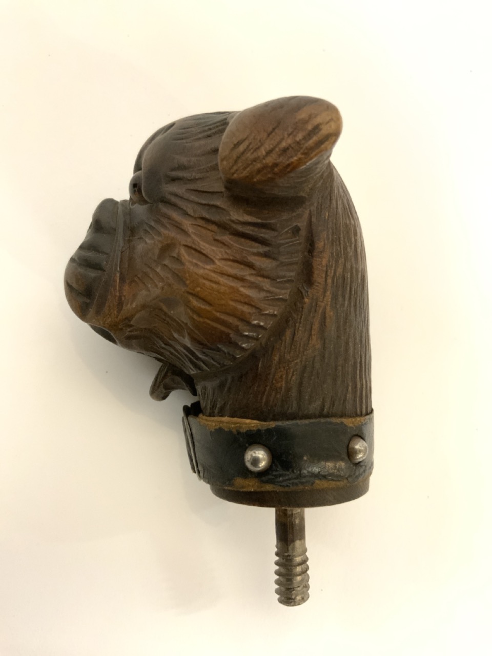 A carved German bull dog cane handle with push button open mouth mechanism and leather collar.