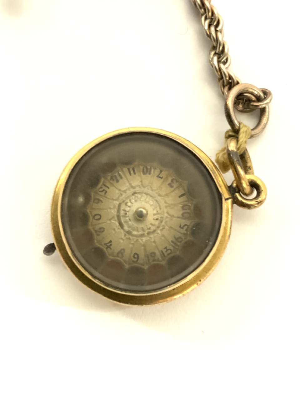 An antique roulette table fob charm game. Late 19th or early 20th century. Probably German. No markings found. Game in working order. 1" diameter.