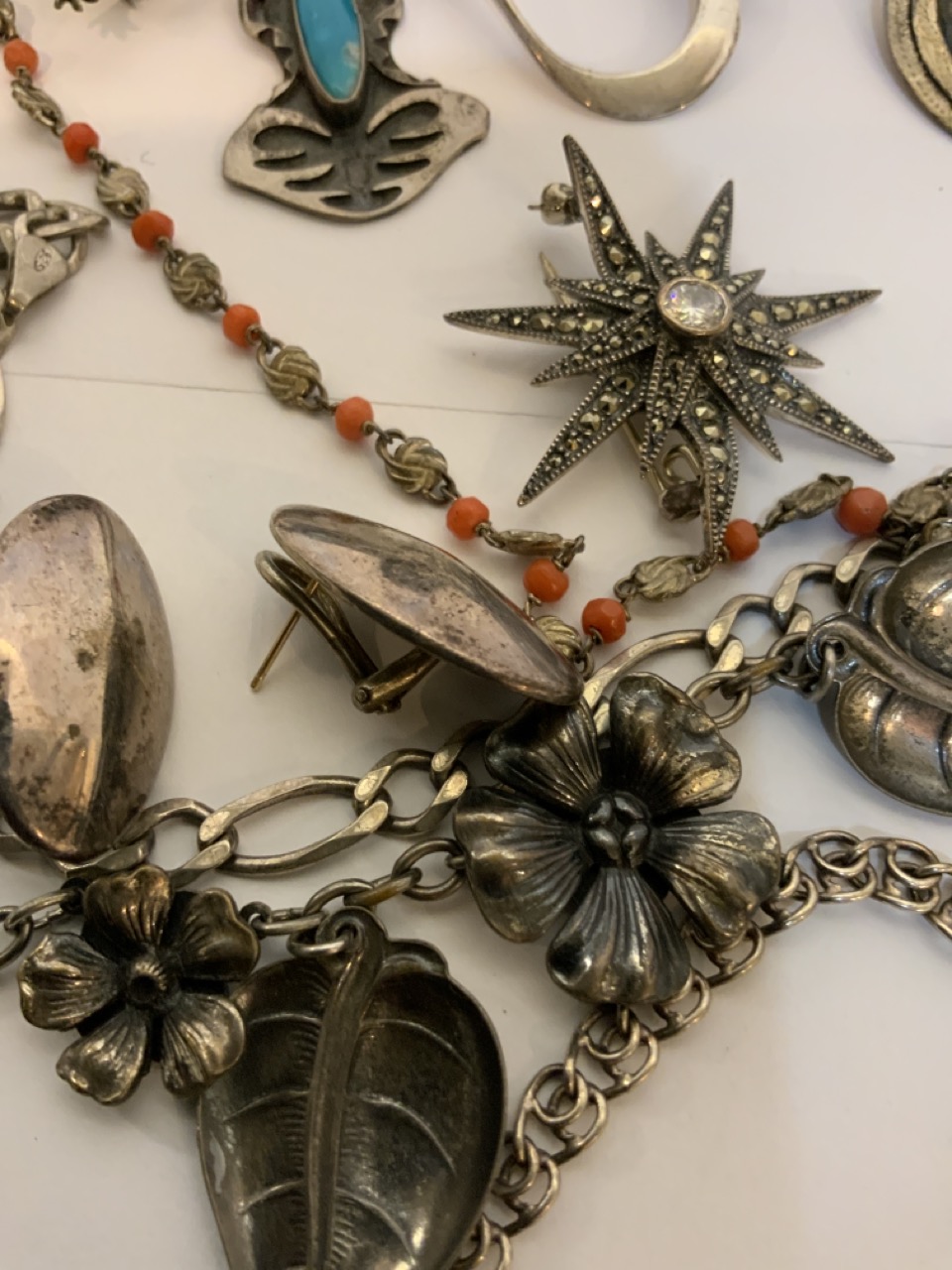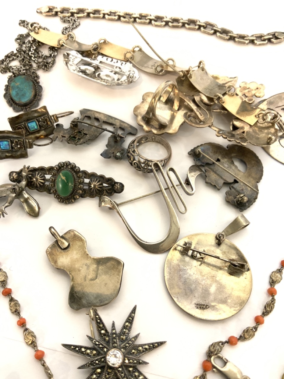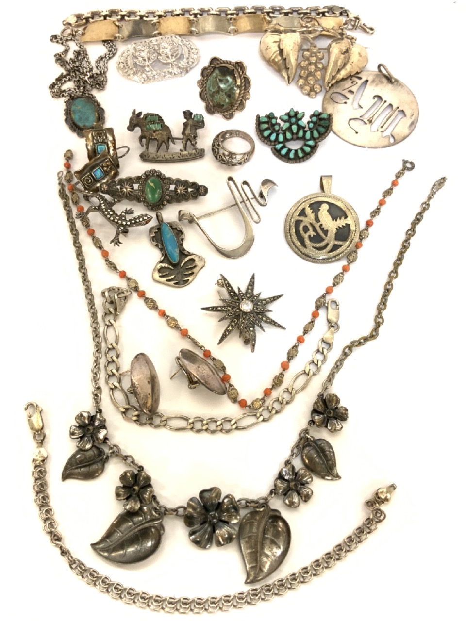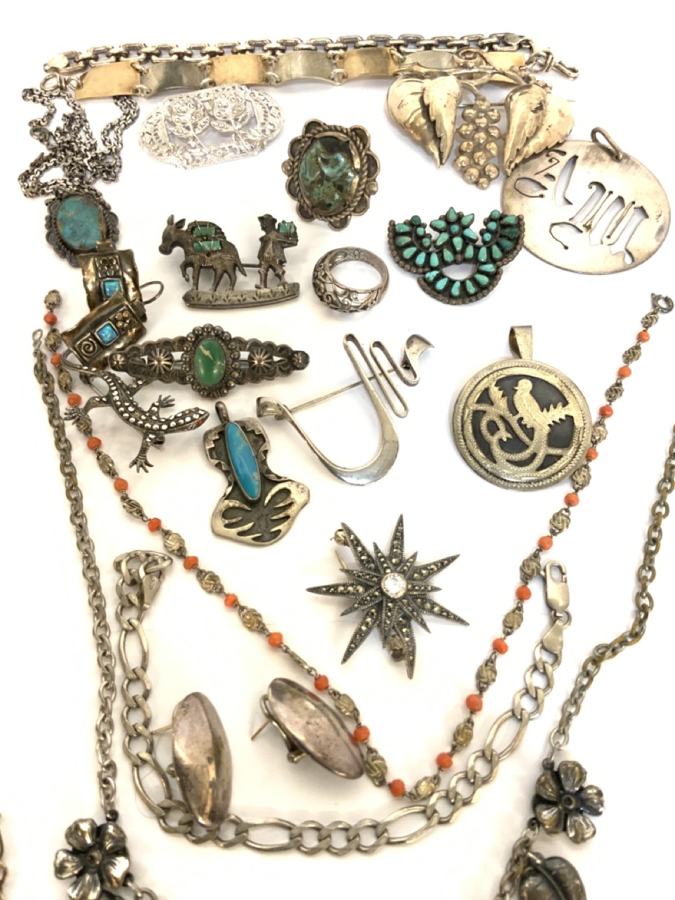Compiled grouping of mostly estate sterling silver jewelry. Indian, Mexican,, turquoise, coral and marcasite Etc.