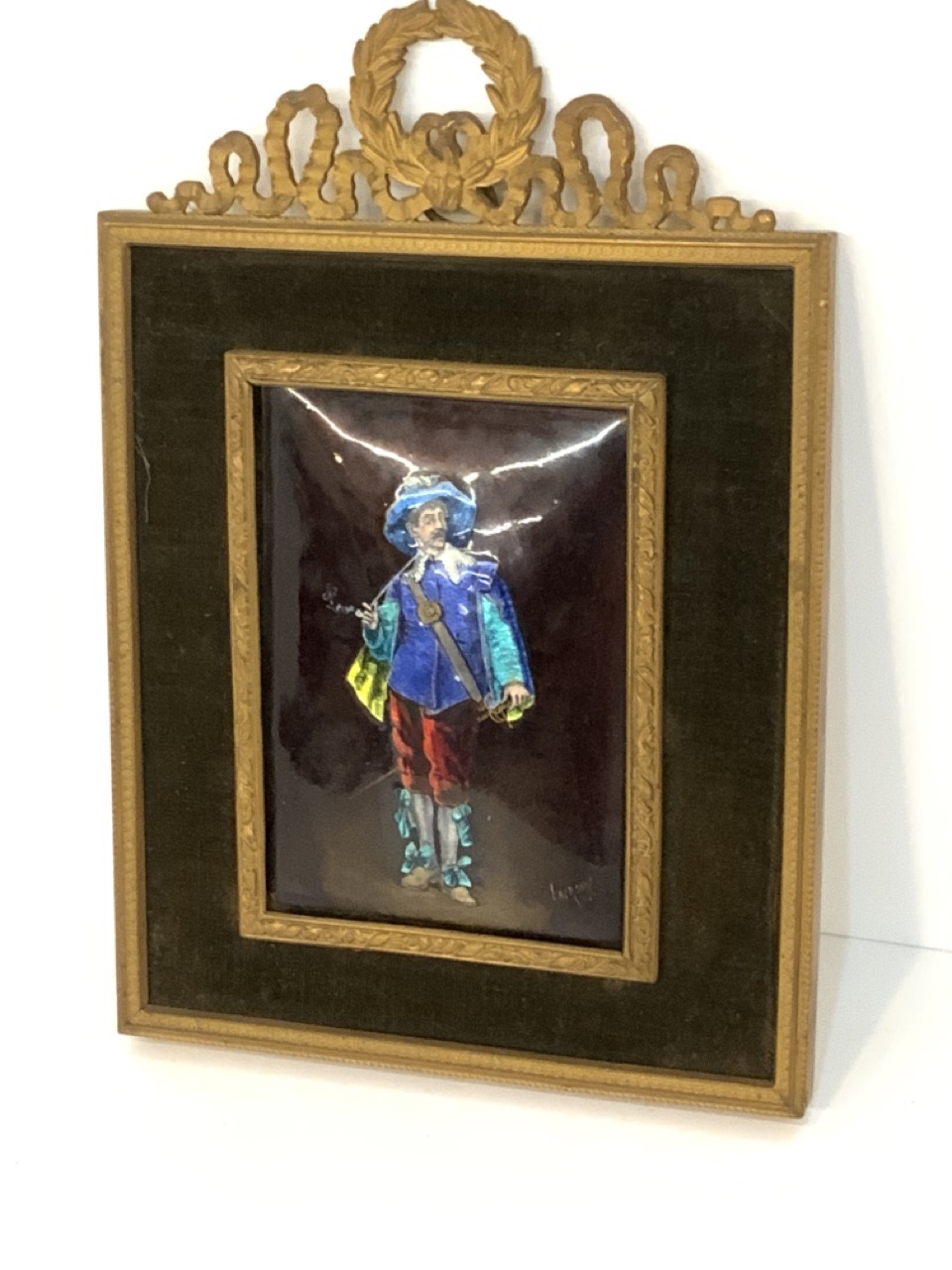 German enameled miniature painting of male musketeer figure. Signed LaCroix.