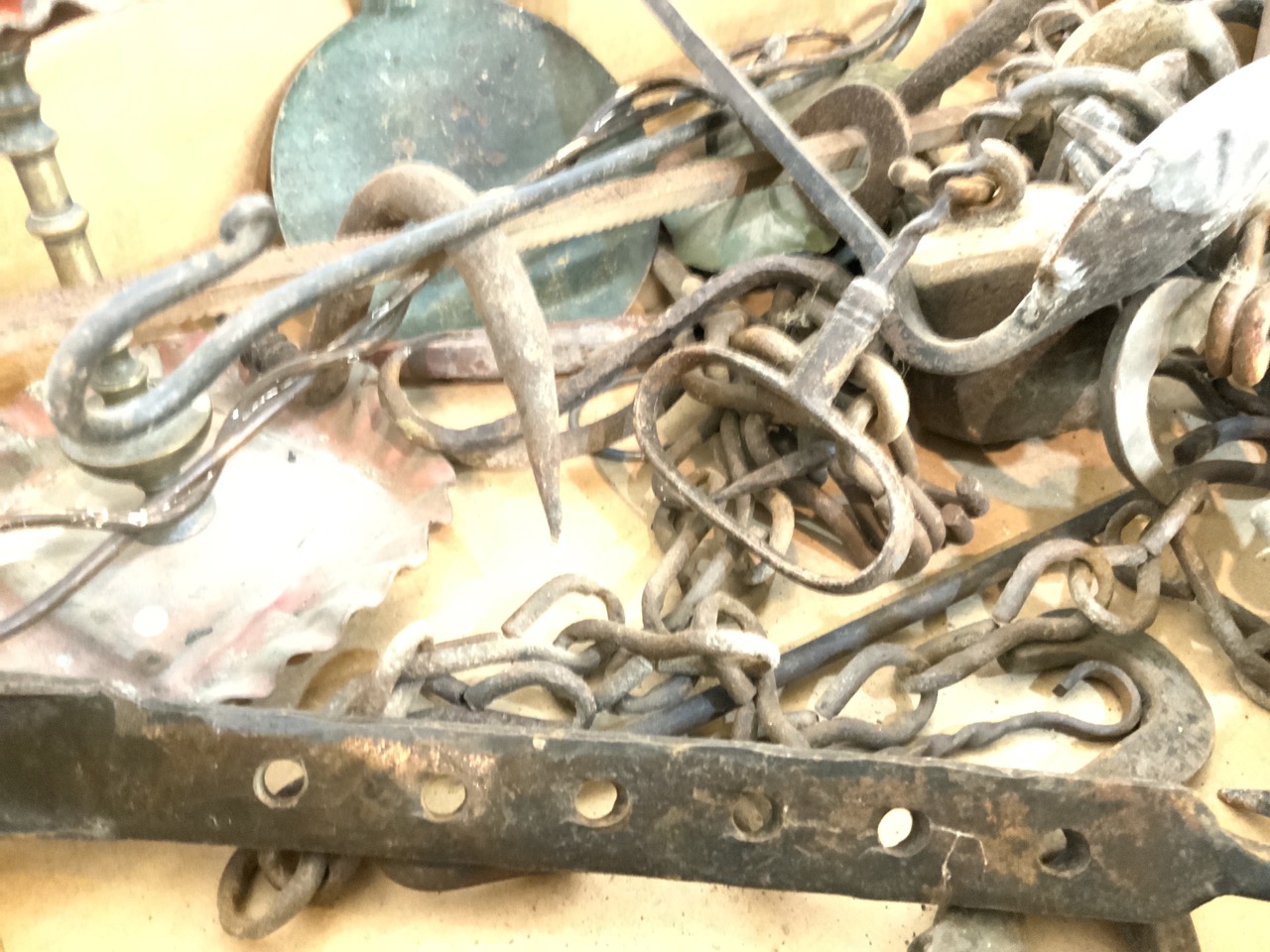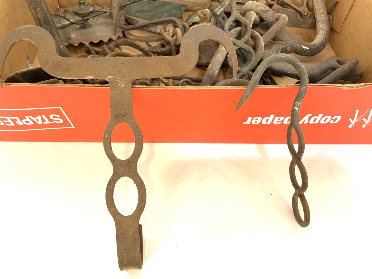 An assorted grouping of antique iron metalware, primitives etc. As seen in photograph preview.