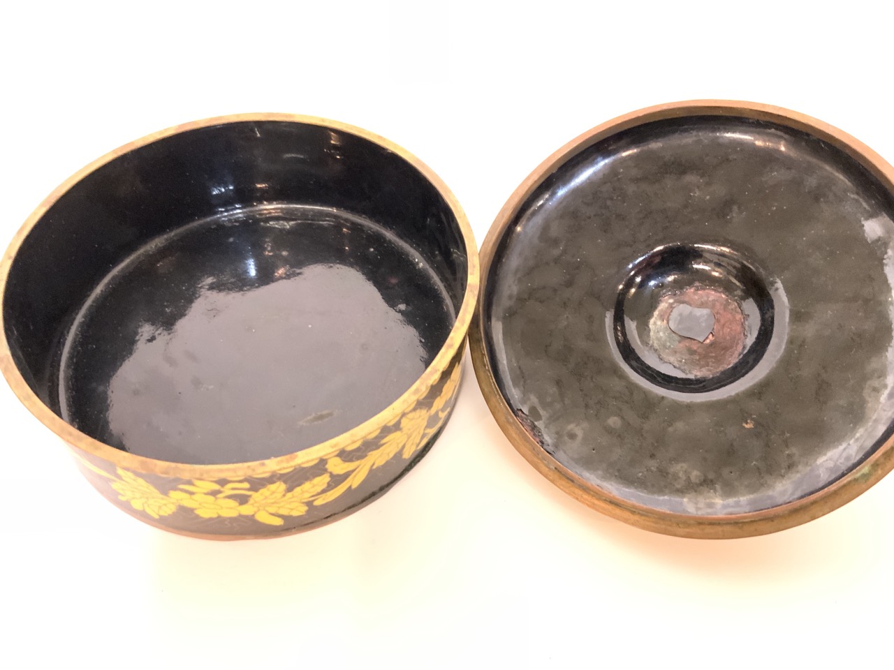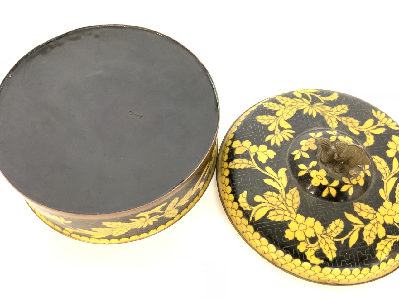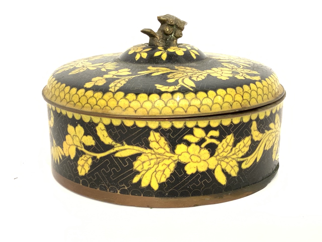 A fine yellow and back Chinese cloisonne enameled box with foo dog finial.
