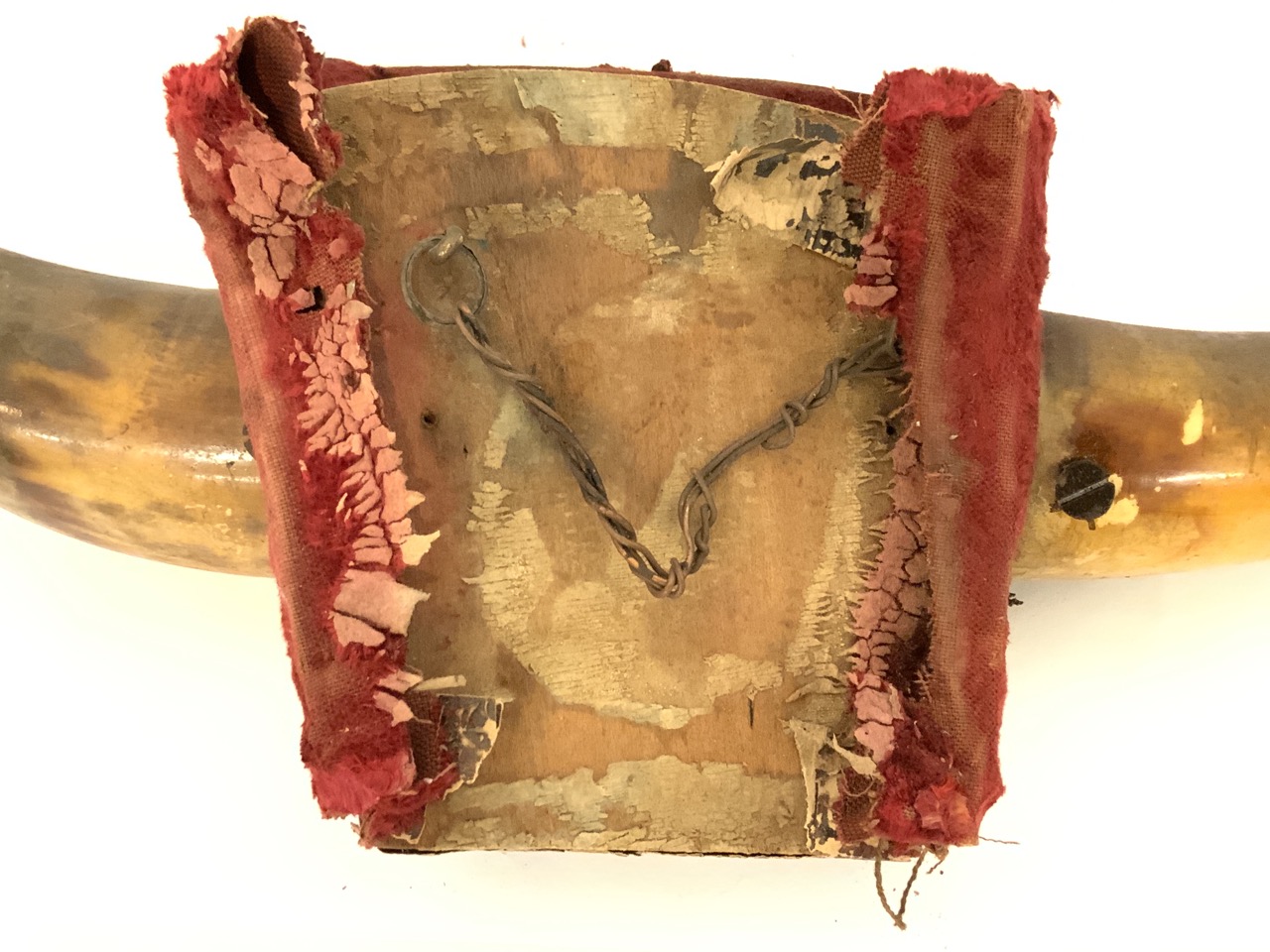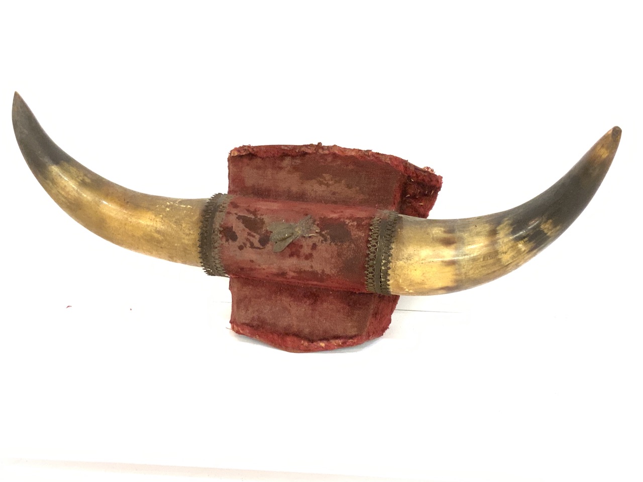 19th century Texas longhorn wall pocket. Red velvet outer lining with applied metal ornamental bee.