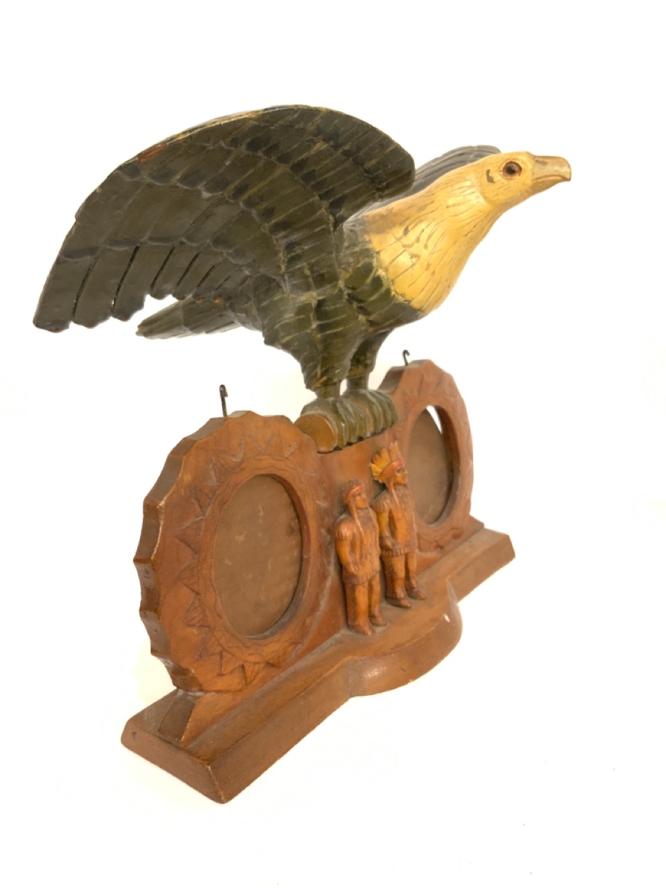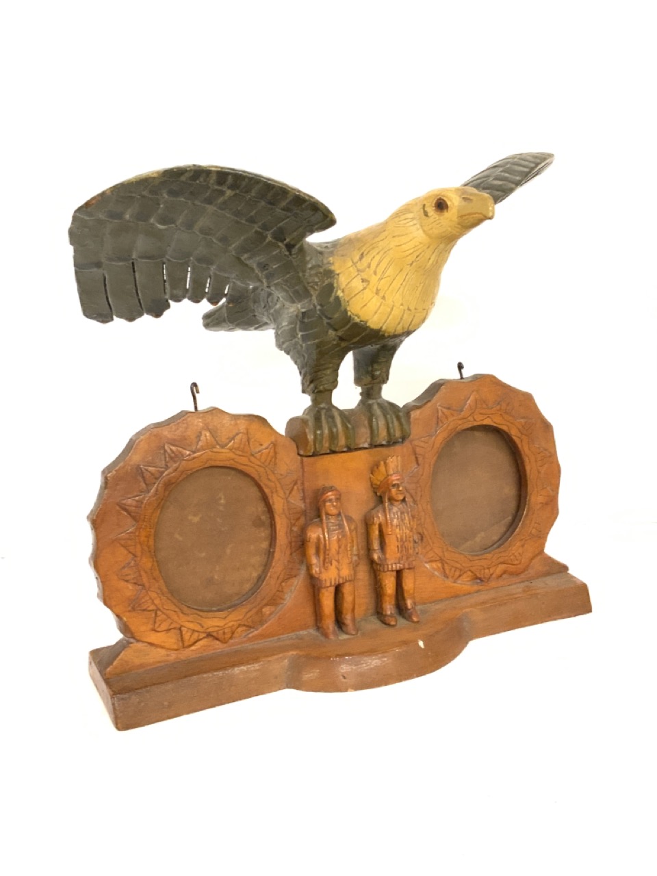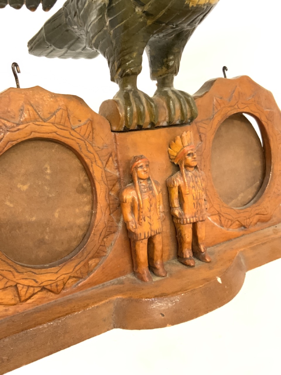 Americana carved folk art wood frame with eagle, double frame and hand carved American Indians at front and center.