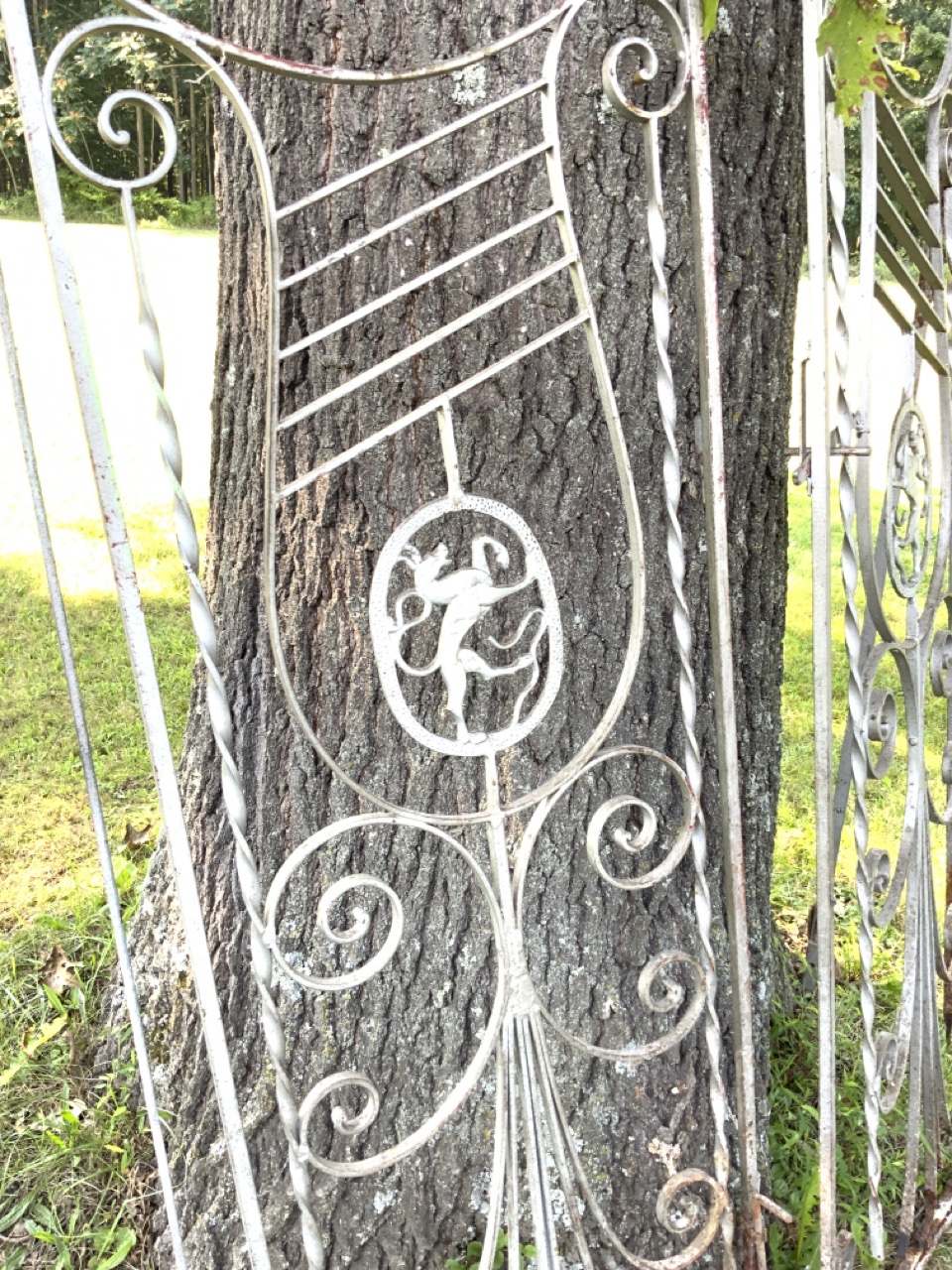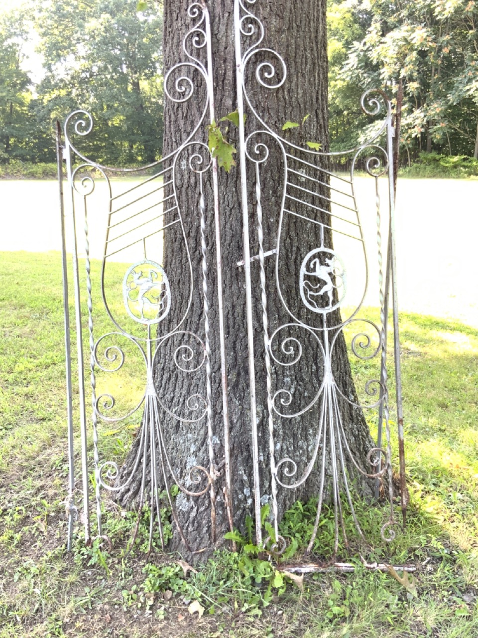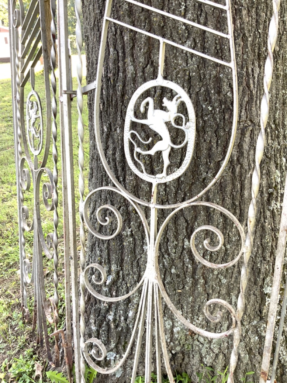 A pair of iron entry gates painted silver. Walking lion shields at entry. Bottom is rotted from water damage.