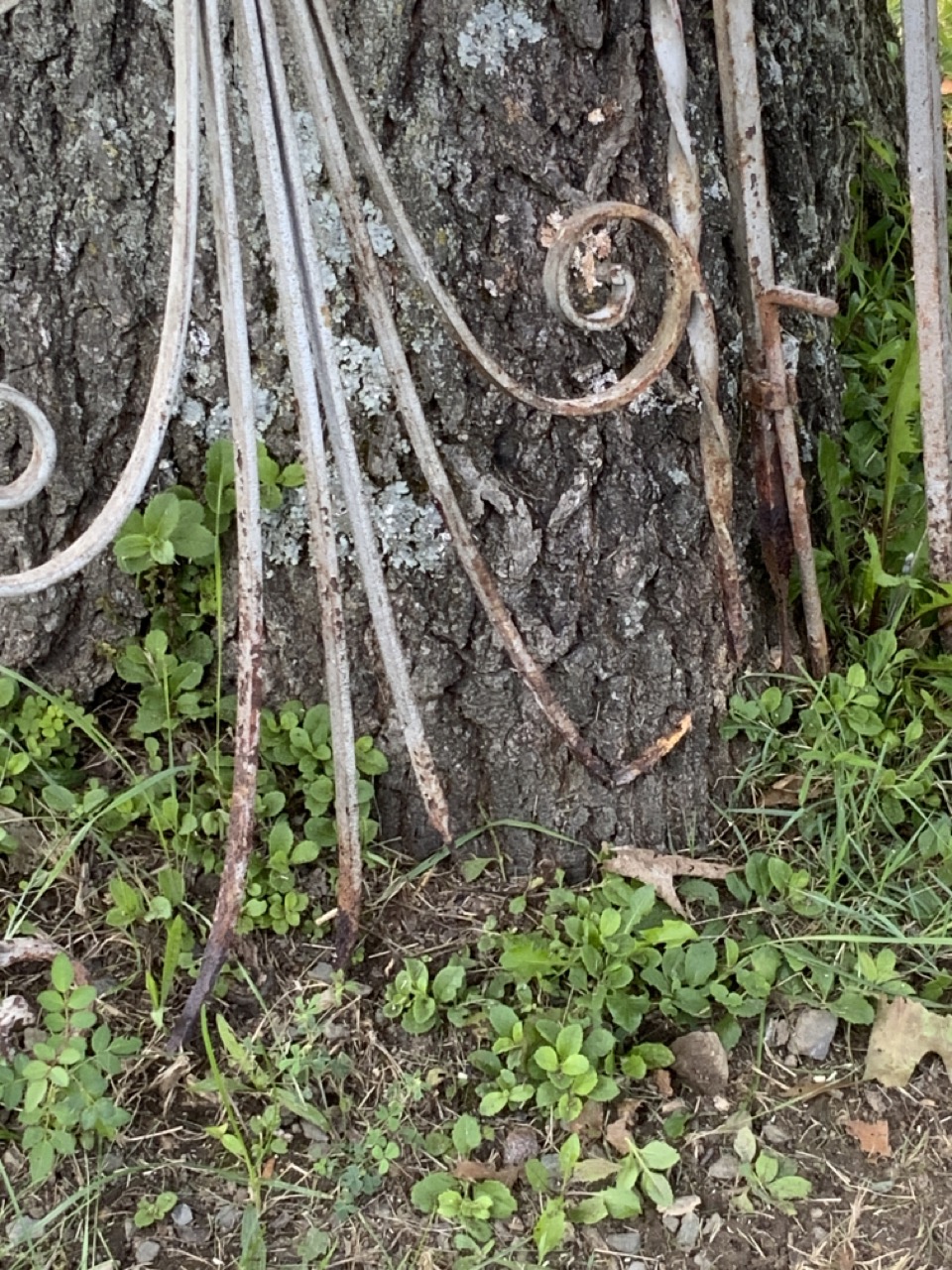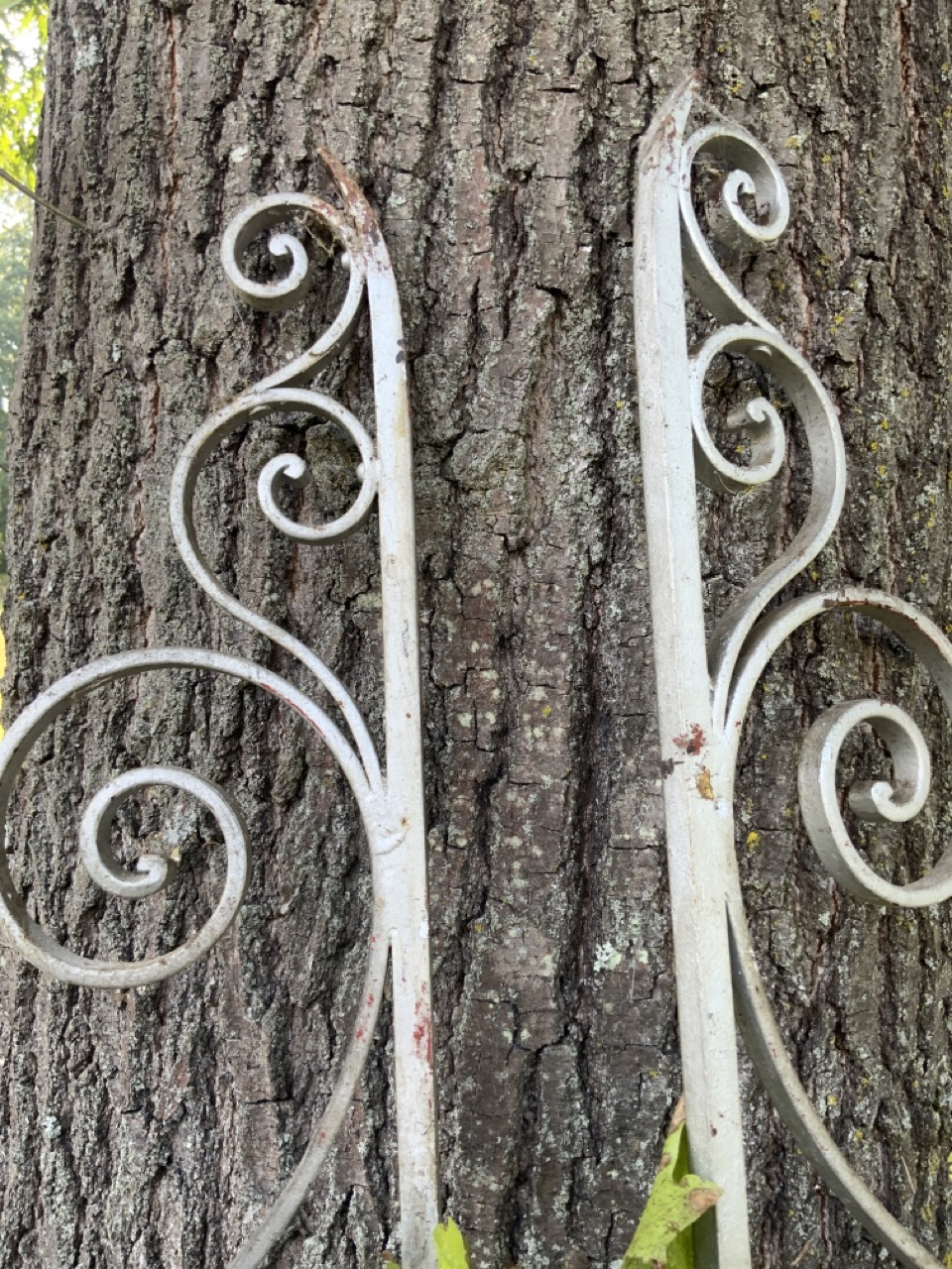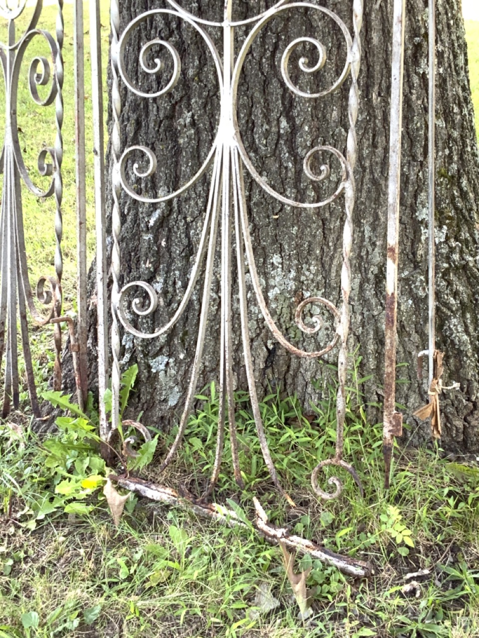 A pair of iron entry gates painted silver. Walking lion shields at entry. Bottom is rotted from water damage.