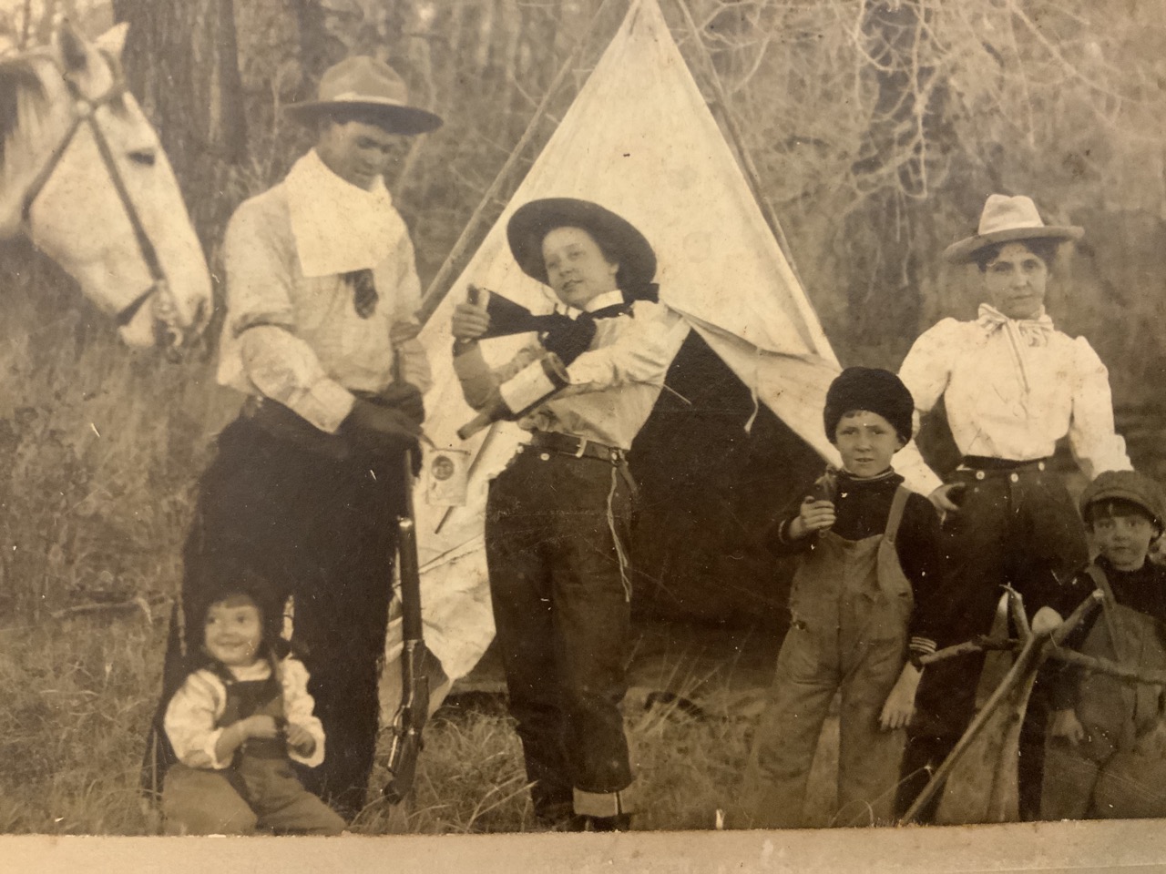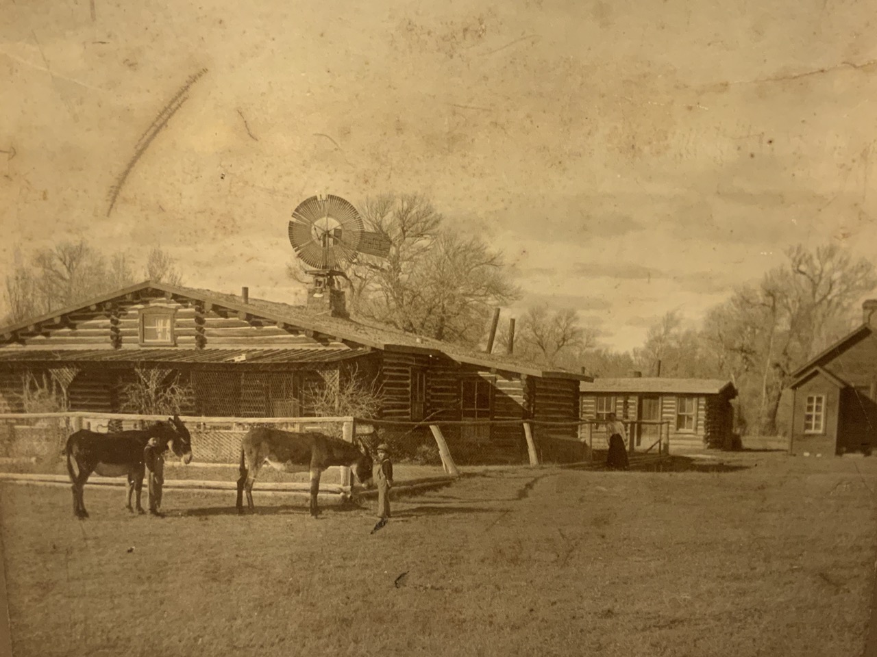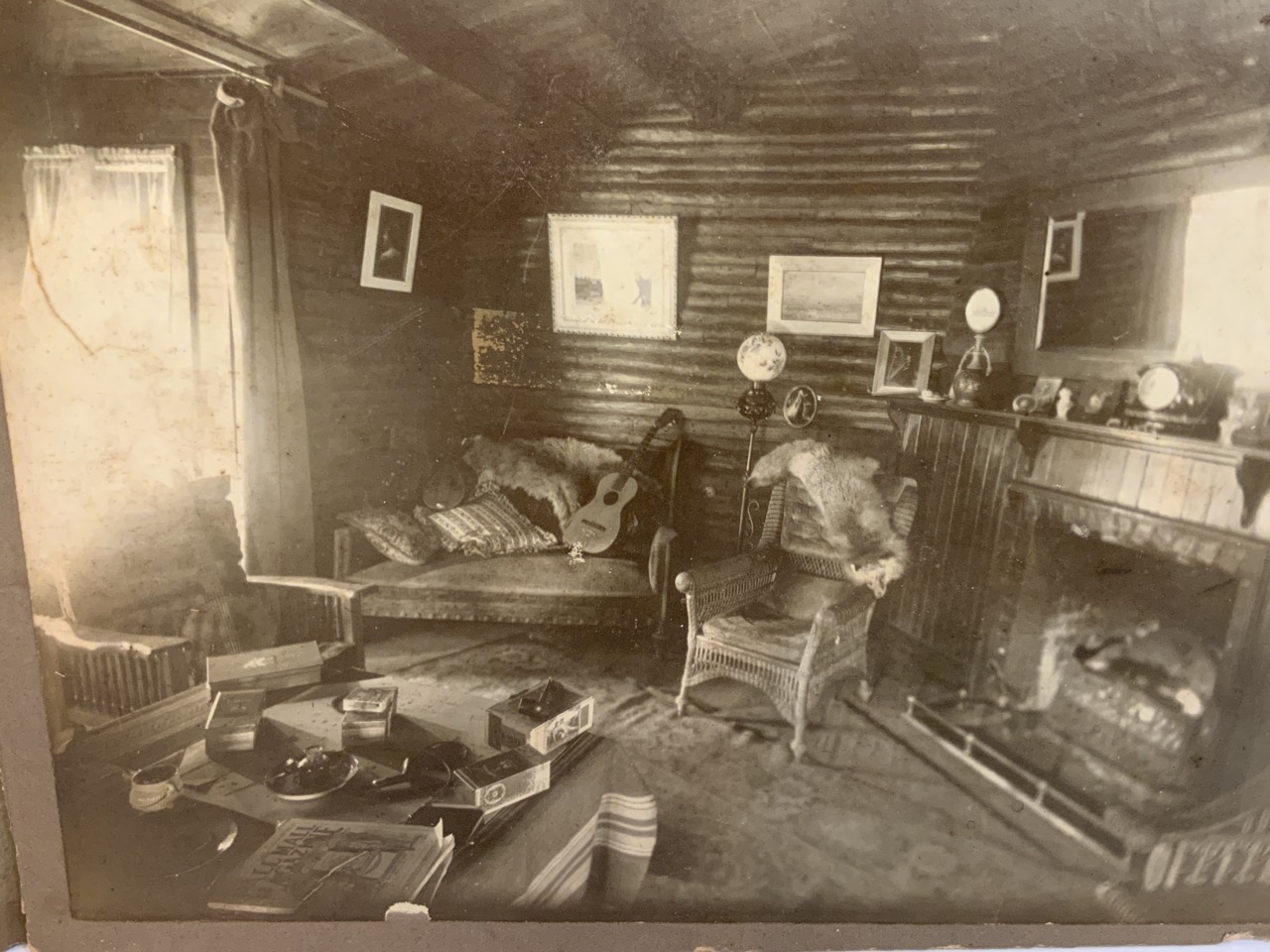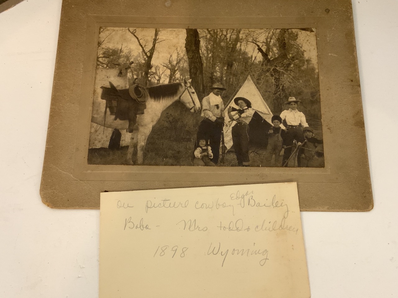 Four original photograph images c.1898 of an Old Western Pick Ranch In Wyoming. The Dunwood Ranch. Includes Exterior and Interior Images and Cowboy Edgar Bailey With Mrs. Todd And Children.