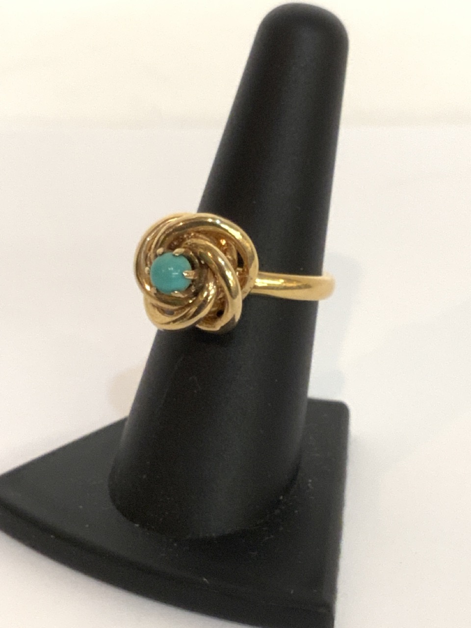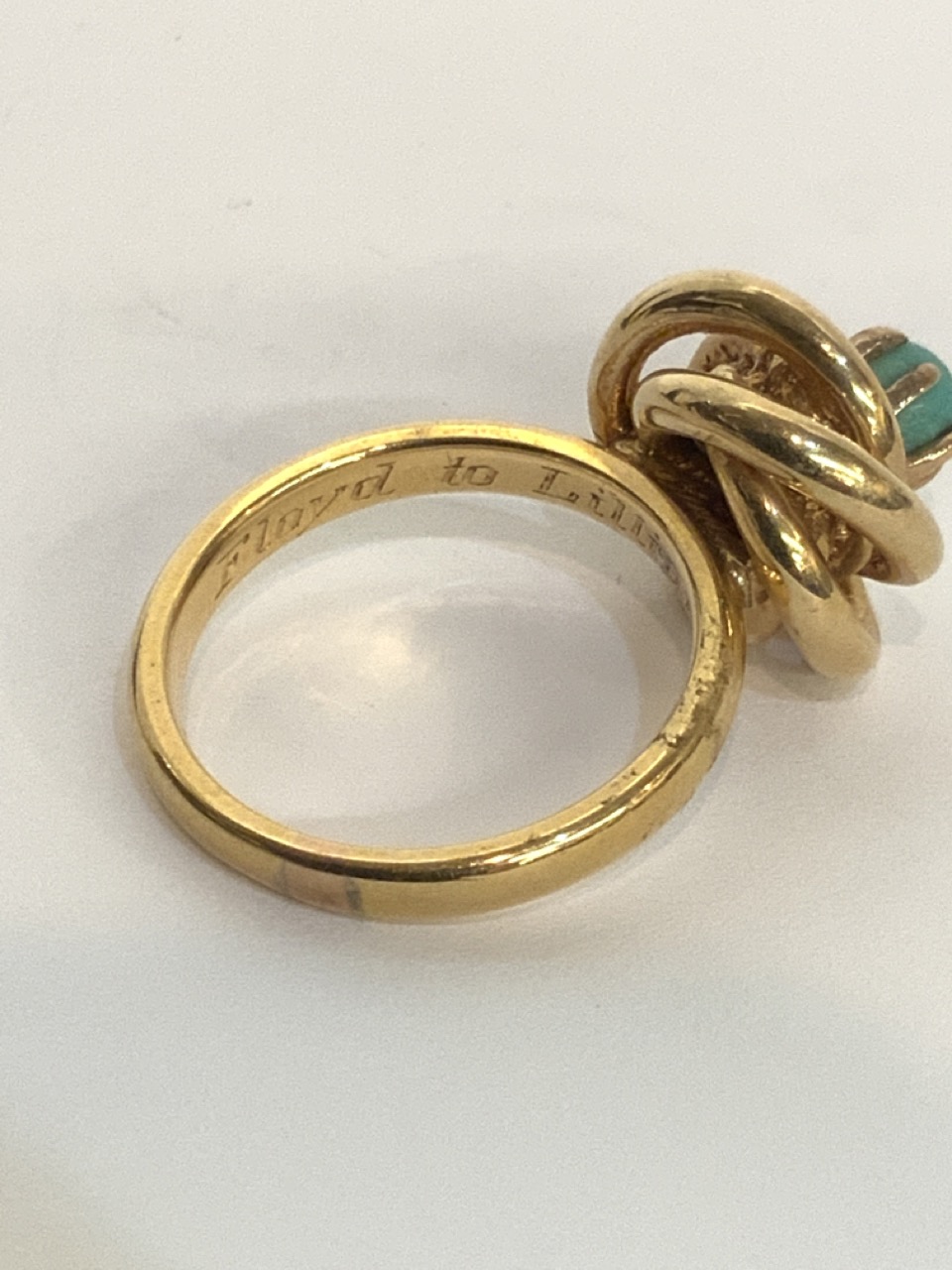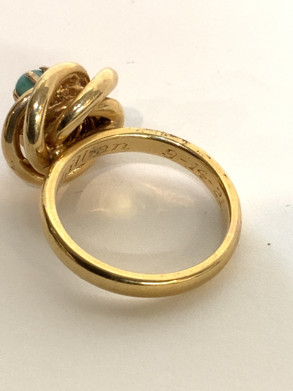 c.1921 14k yellow gold Persian turquoise cocktail ring. Inscribed "Flloyd To Lily 1921"